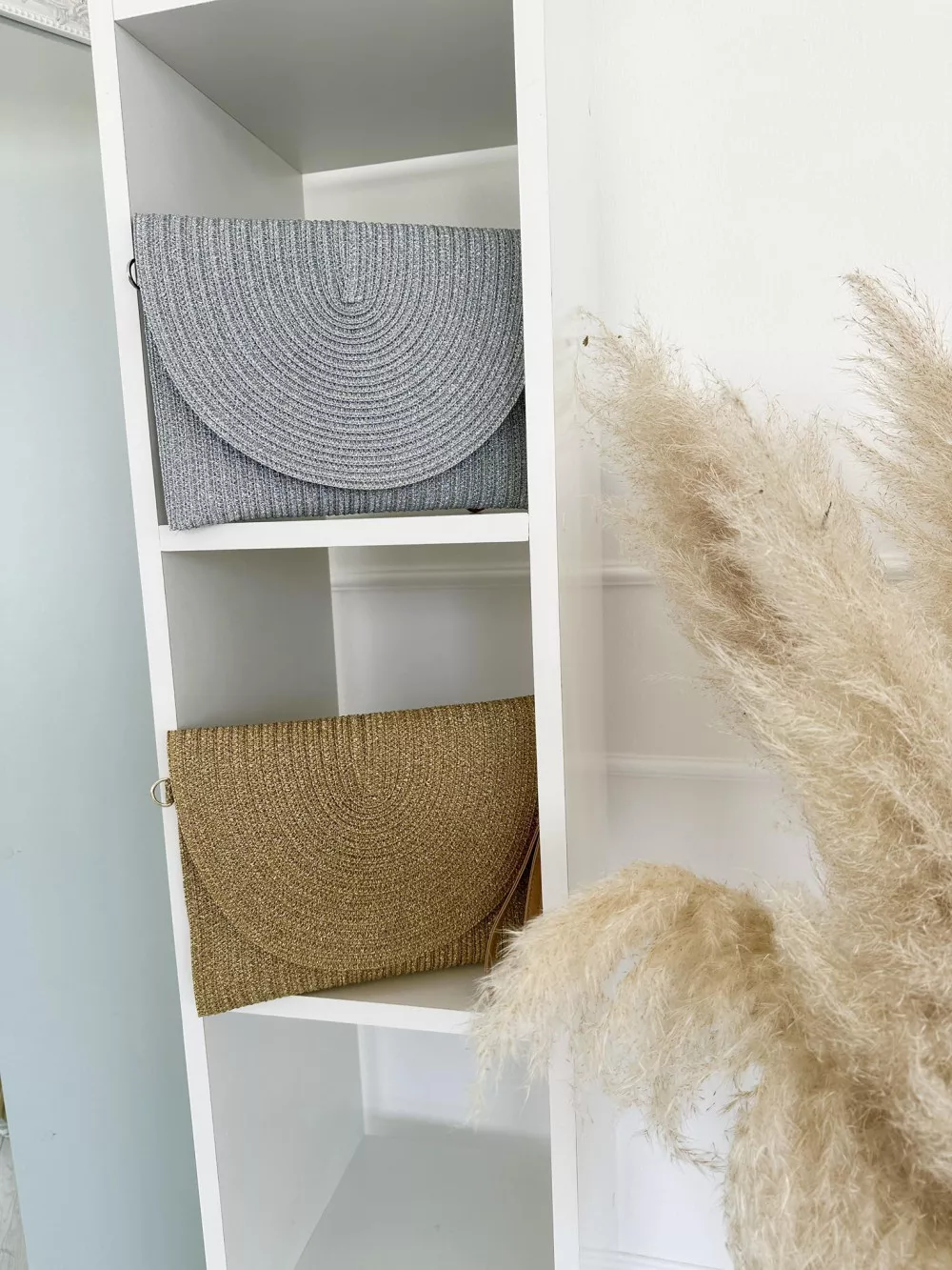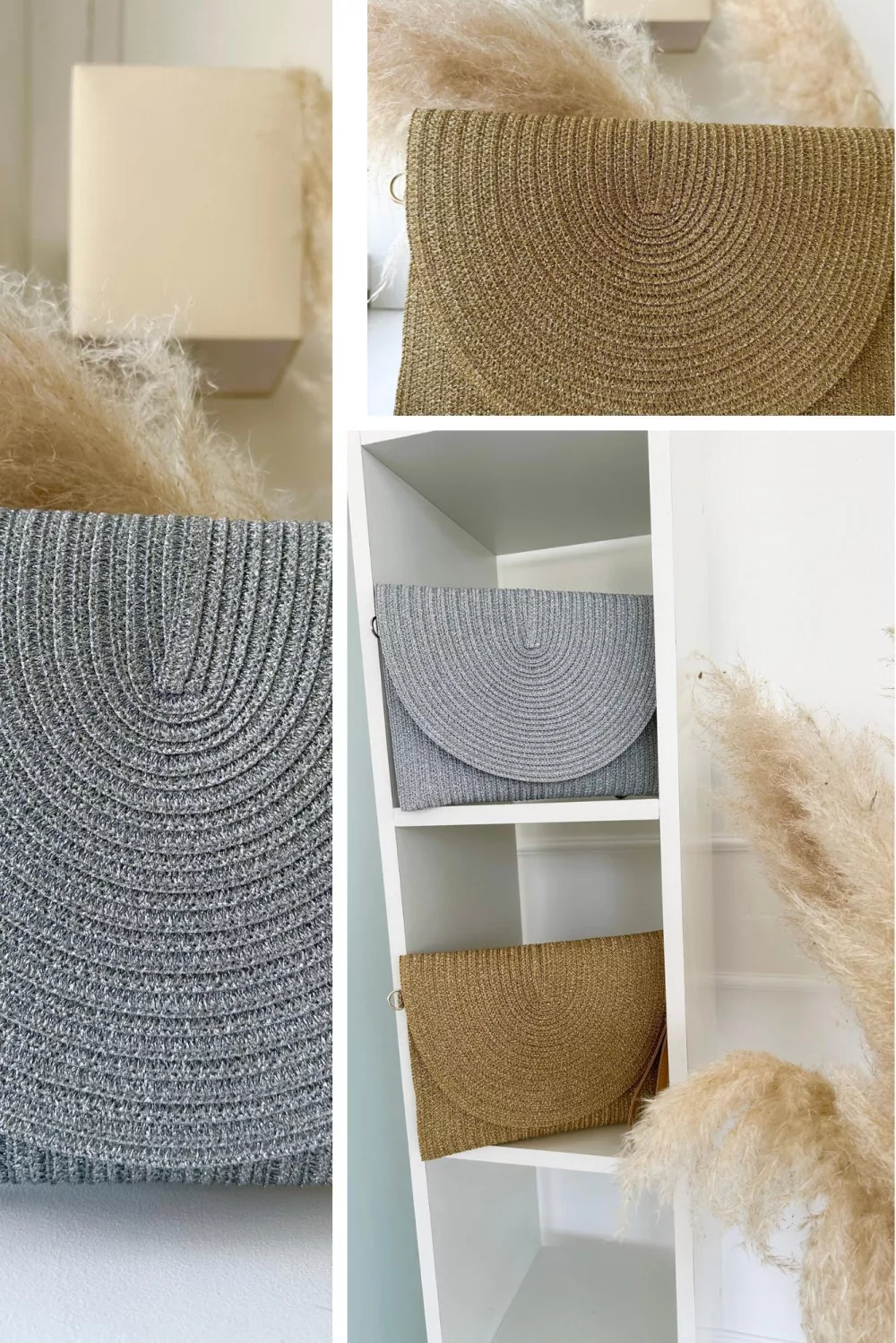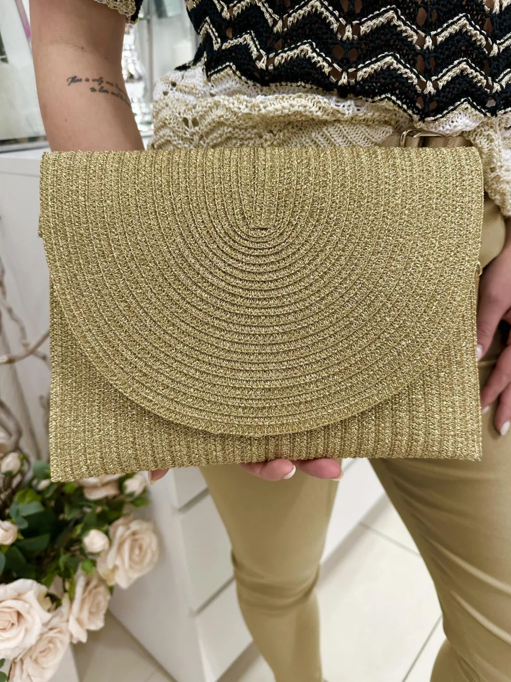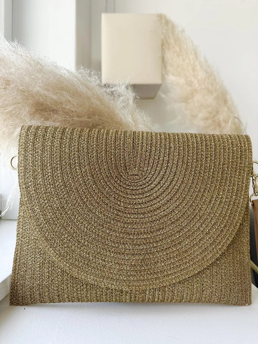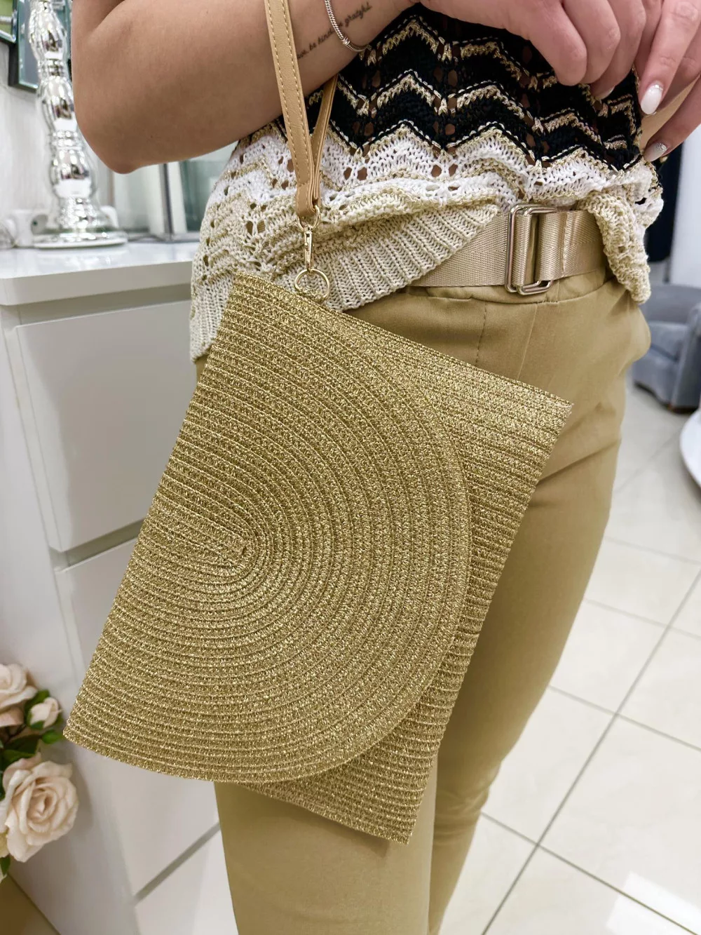 Anyagában csillogós gyékény borítéktáska állítható hosszú pánttal. Szélesség: 28 cm, Magasság: 20 cm.