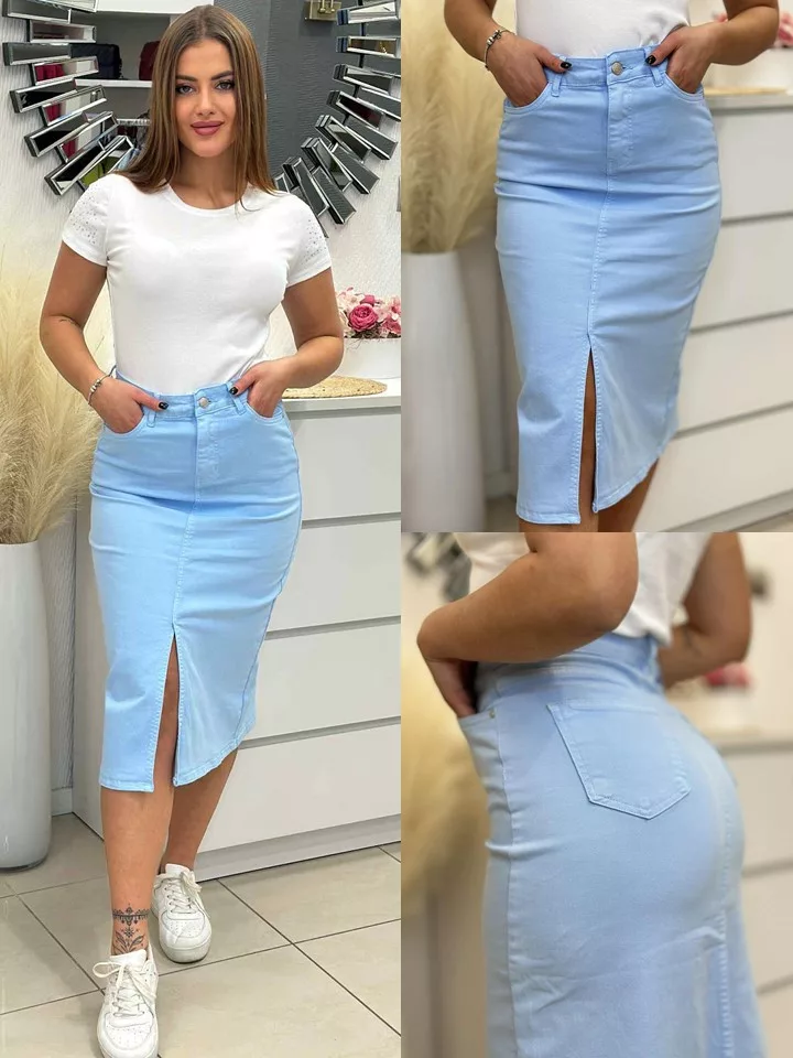 Csinos farmerszoknya , rugalmas anyagú, magas derekú. A Modell M méretet visel. A kabát külön vásárolható meg!