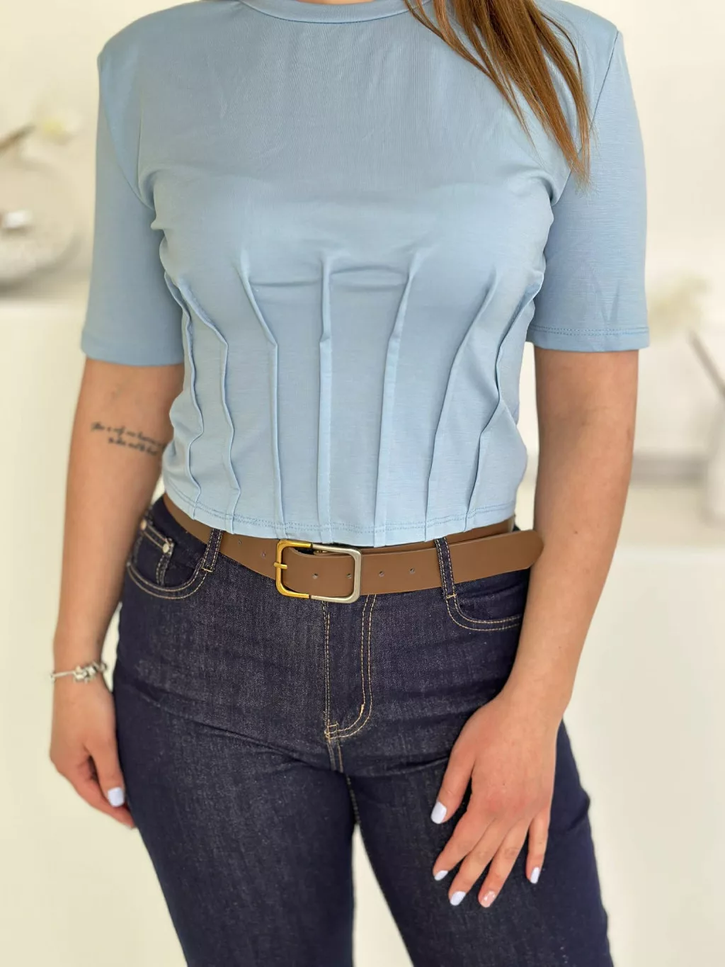 Csinos felső ,rugalmas, válltöméses, karcsúsított, rövid derekú. (S-L méretre ajánljuk.)