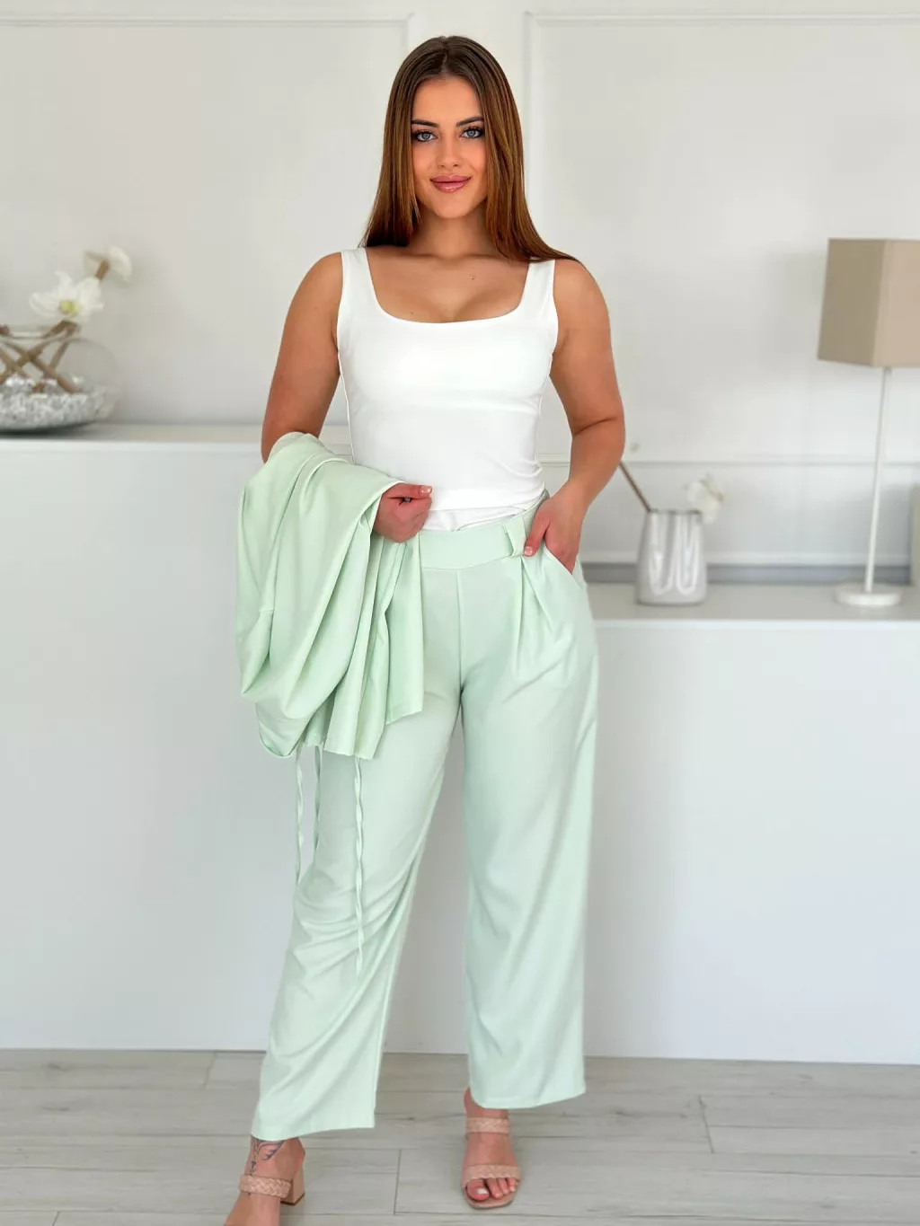 Csinos szett ,nem rugalmas, átlapolt, megkötős, béleletlen, díszzsebes blézer, magas, gumis derekú, elegáns, zsebes nadrággal. (S-L méretre ajánljuk.)