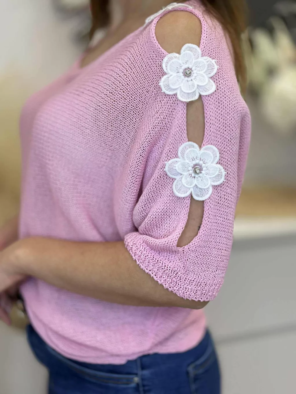 Denevérujjas, virágos felső , vállán nyitott, lenge fazonú, rugalmas, kötött. (S-L méretre ajánljuk.)