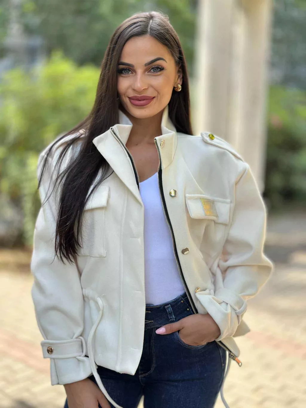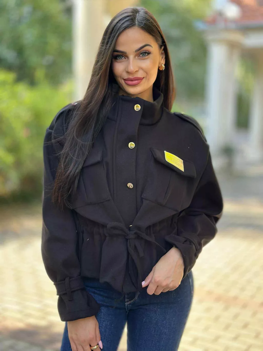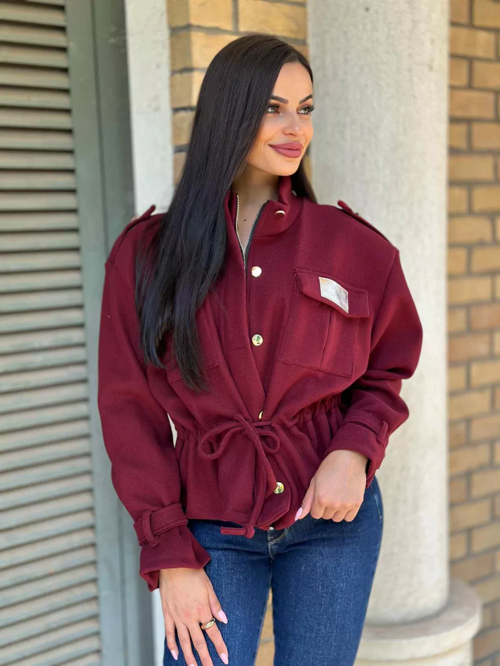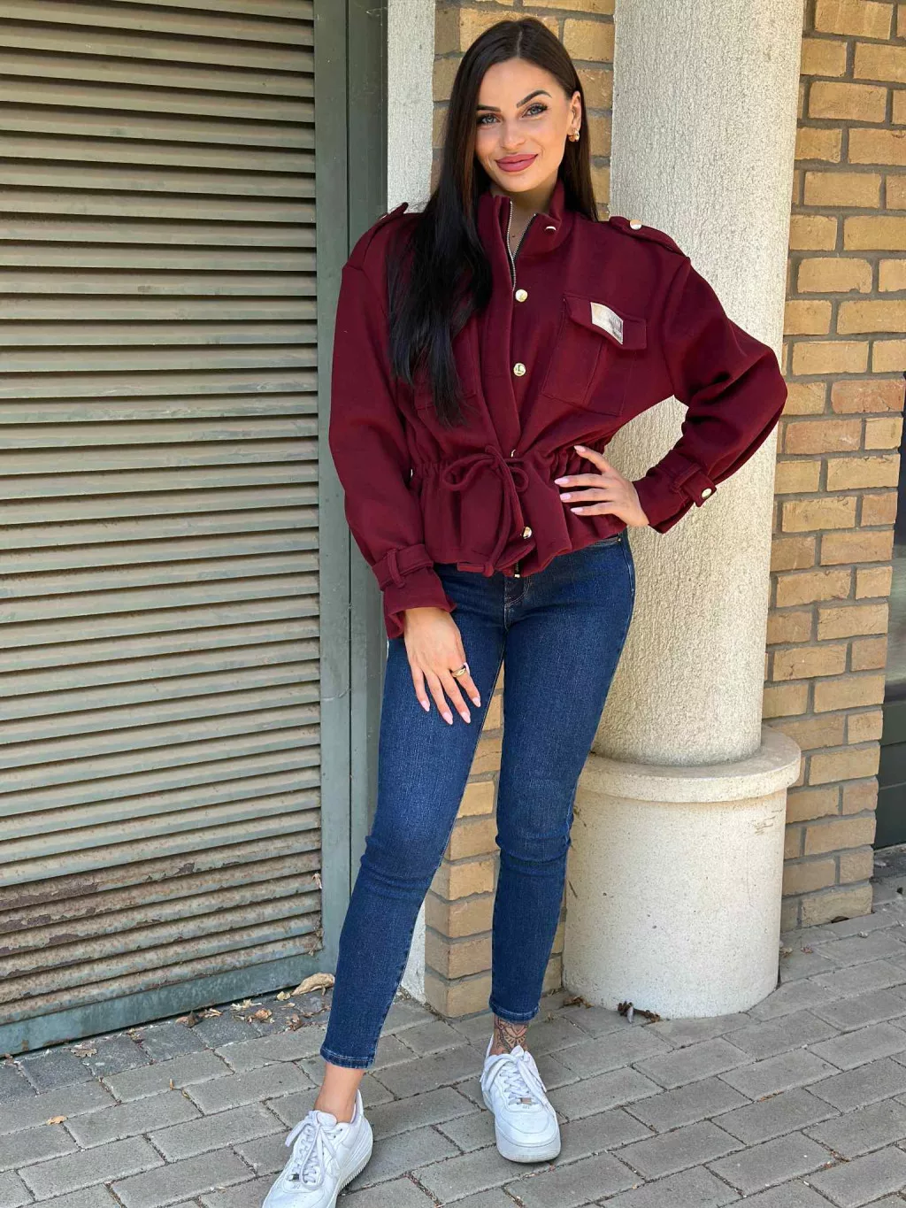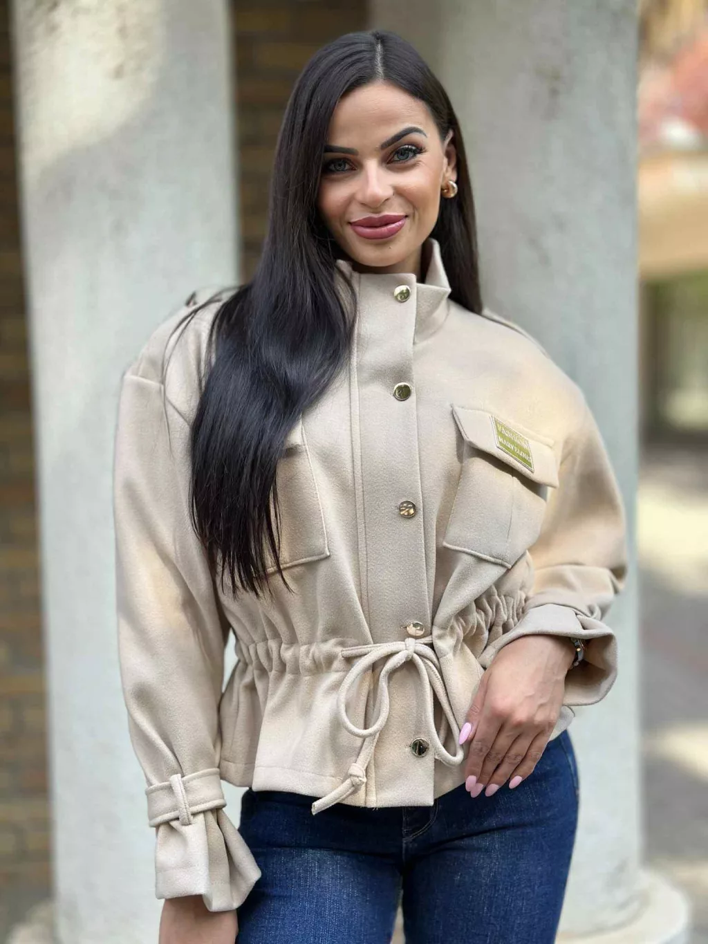 Enyhén rugalmas anyagú, béleletlen, zsebes, cipzáras, rövid derekú, összehúzható, megkötős átmeneti kabát. (M-XL méretre ajánljuk.)