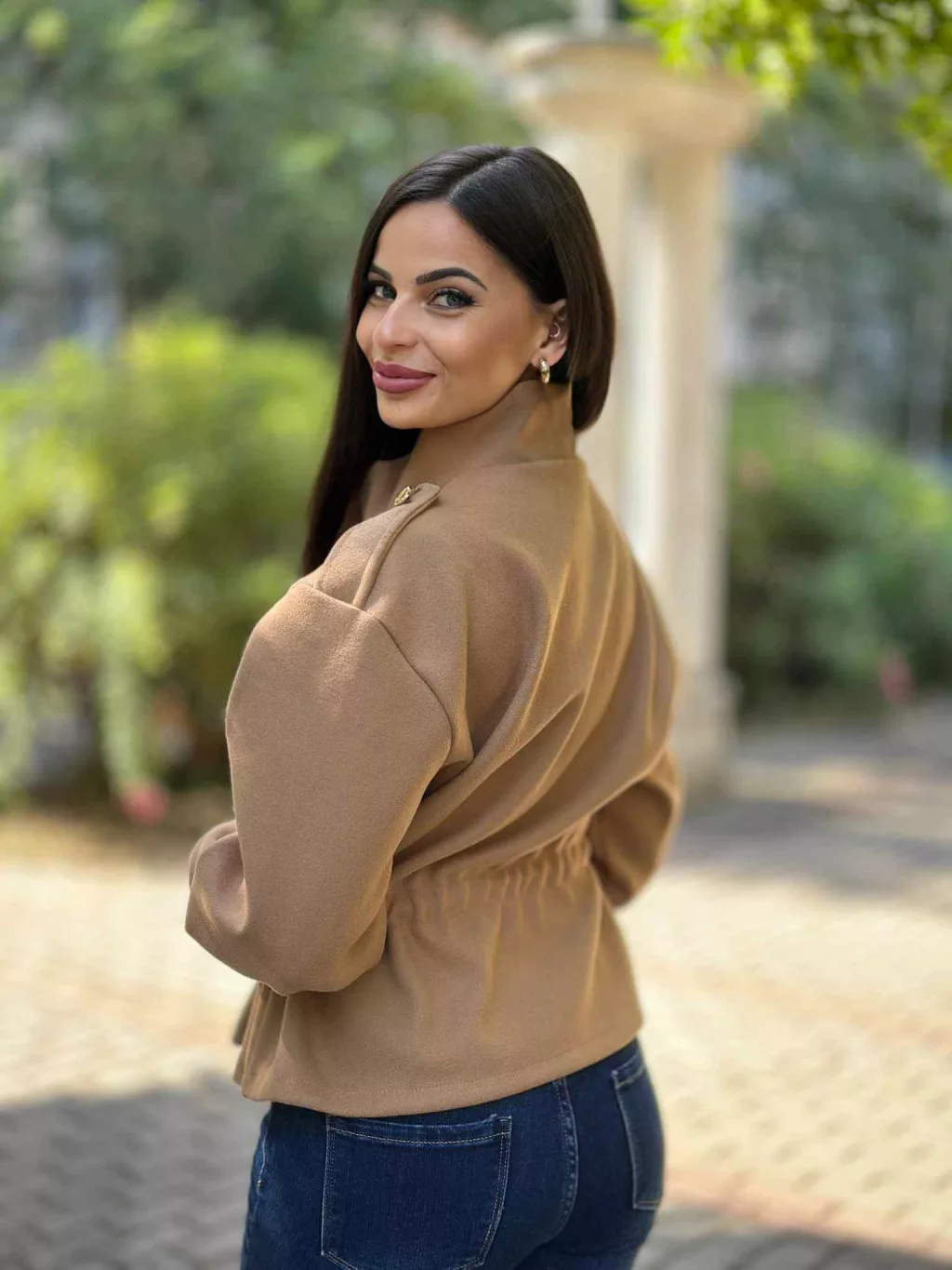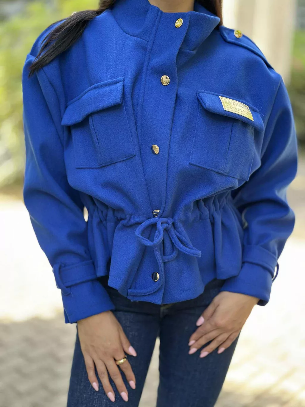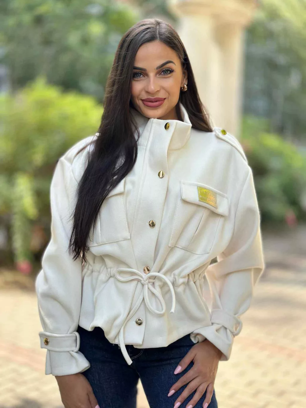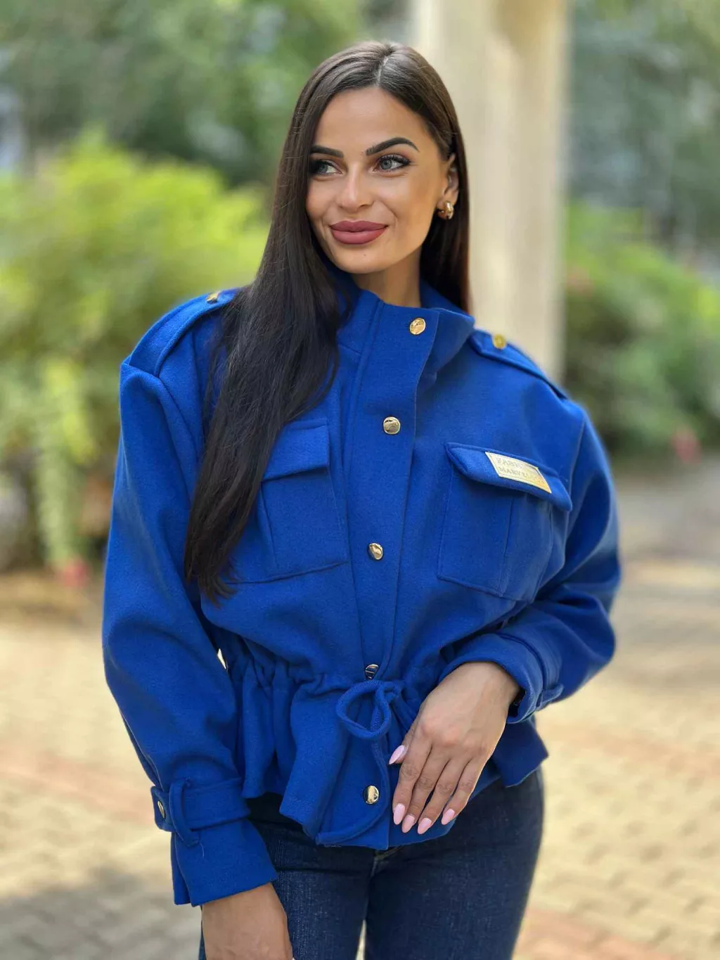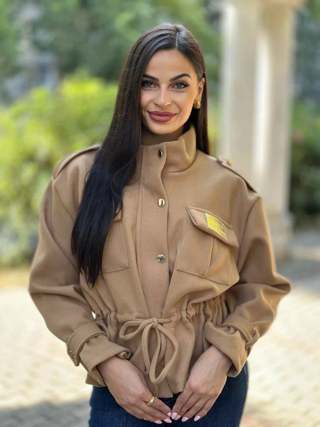 Enyhén rugalmas anyagú, béleletlen, zsebes, cipzáras, rövid derekú, összehúzható, megkötős átmeneti kabát. (M-XL méretre ajánljuk.)
