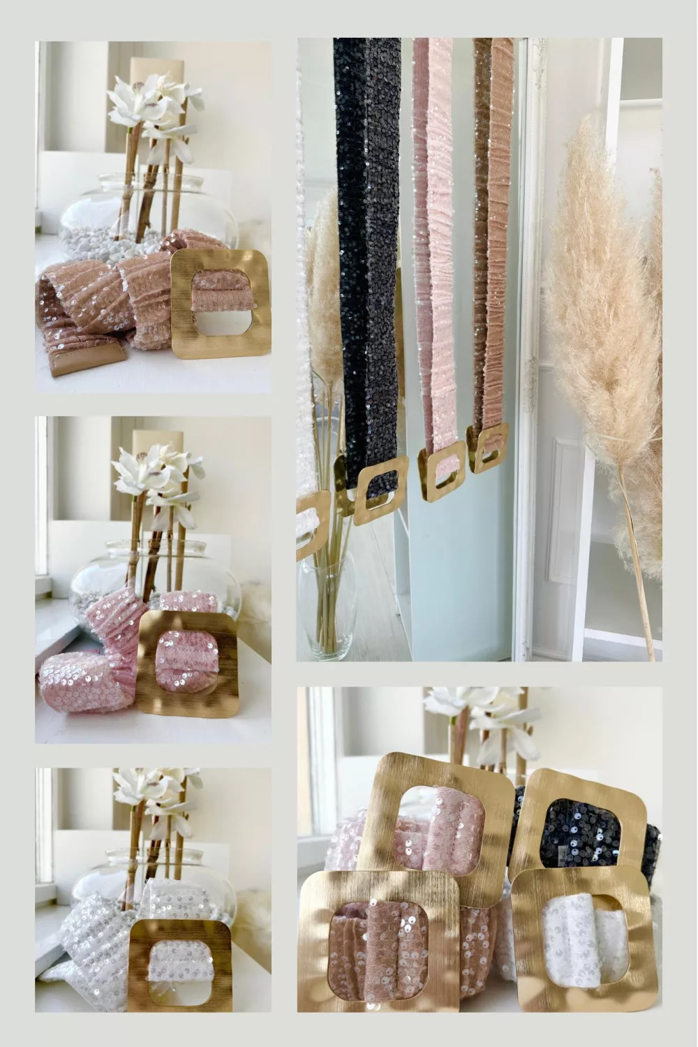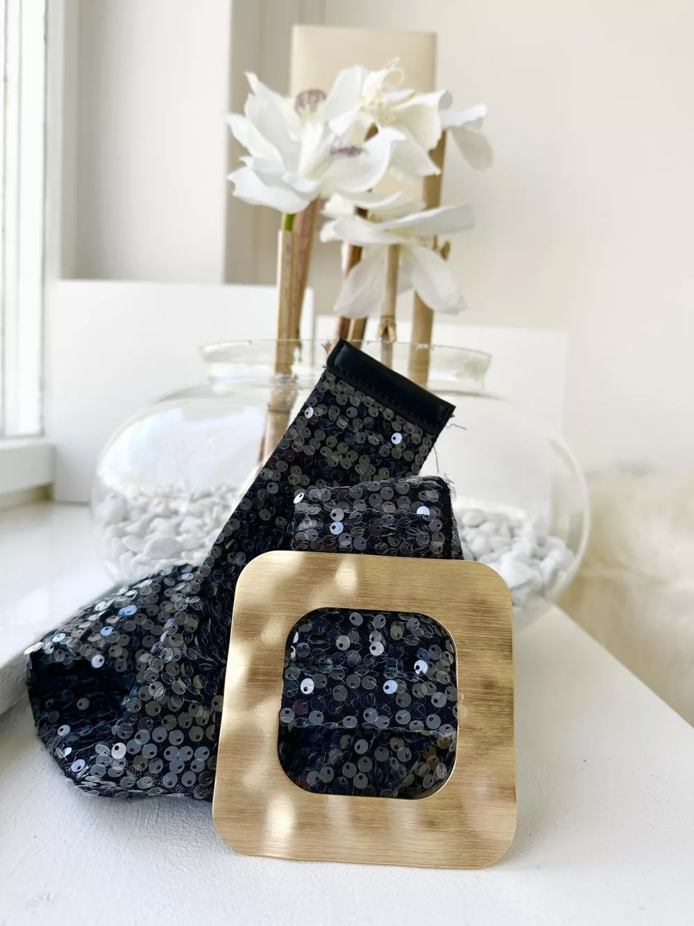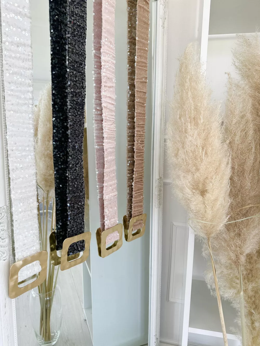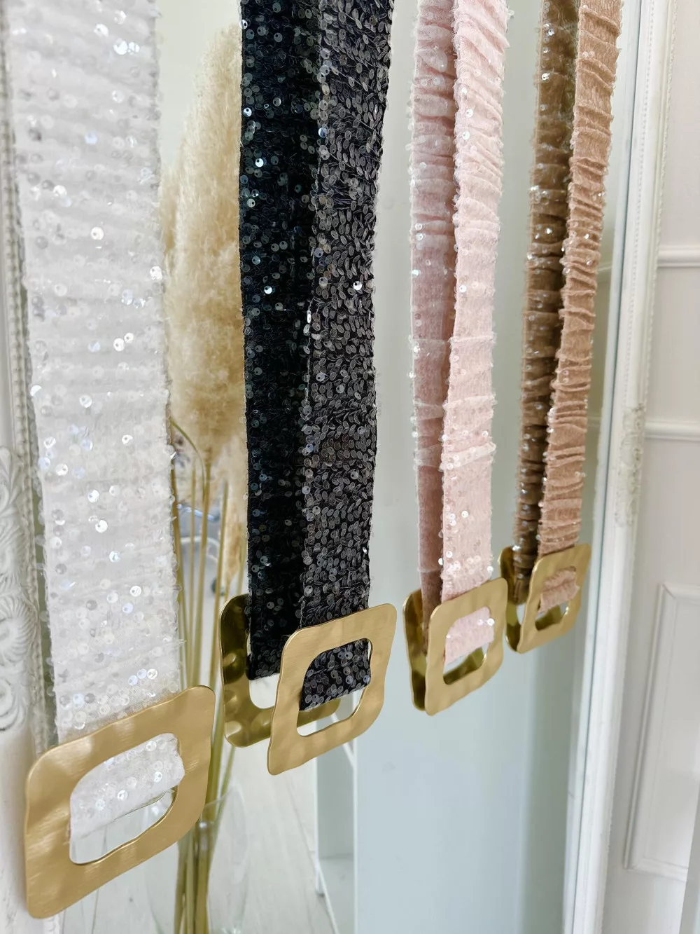 Extra rugalmas, flitterekkel díszített fémcsatos öv.