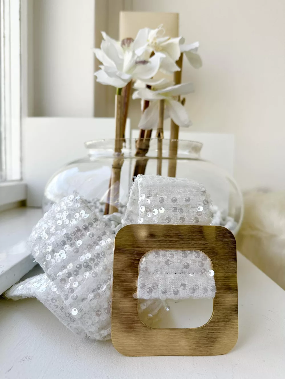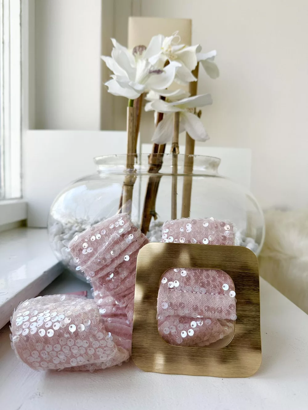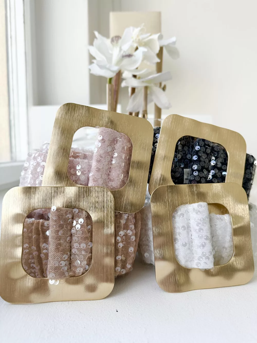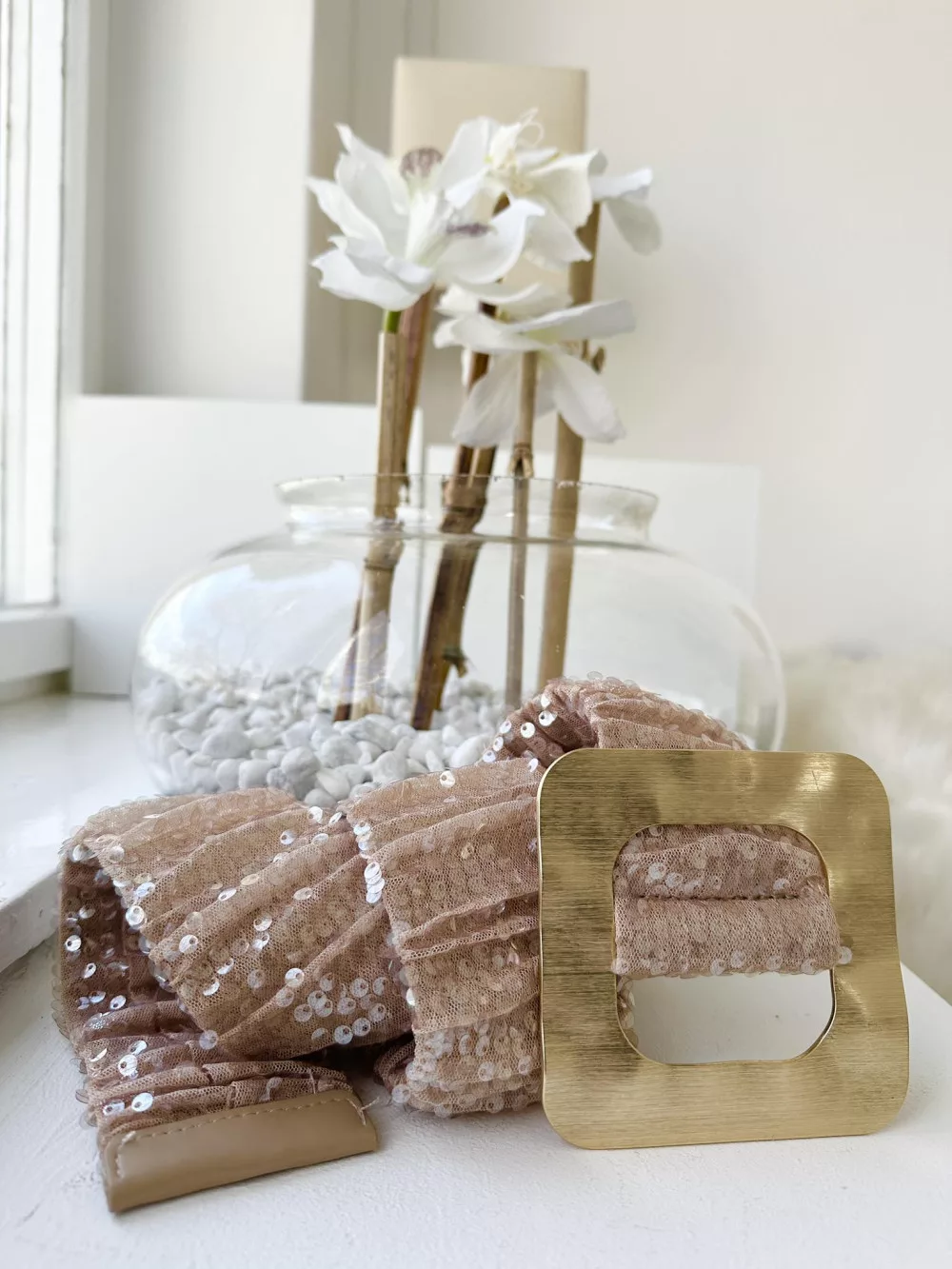 Extra rugalmas, flitterekkel díszített fémcsatos öv.