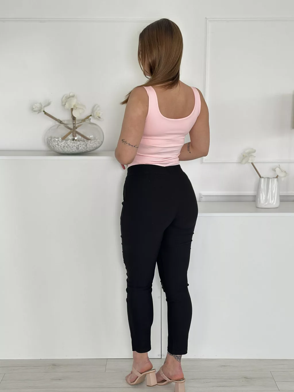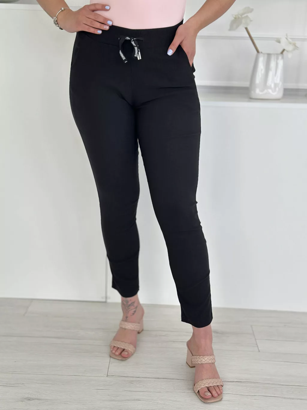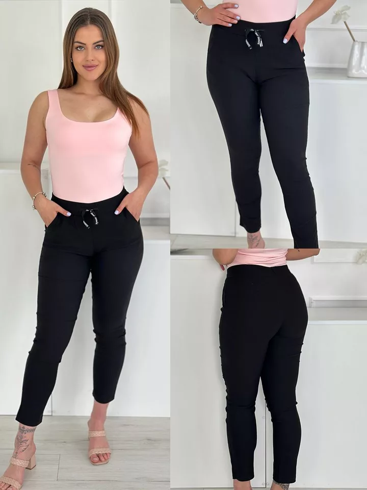 Extra rugalmas, pamut nadrág ,magas, gumis derekú, zsebes, megkötős. A Modell M méretet visel.