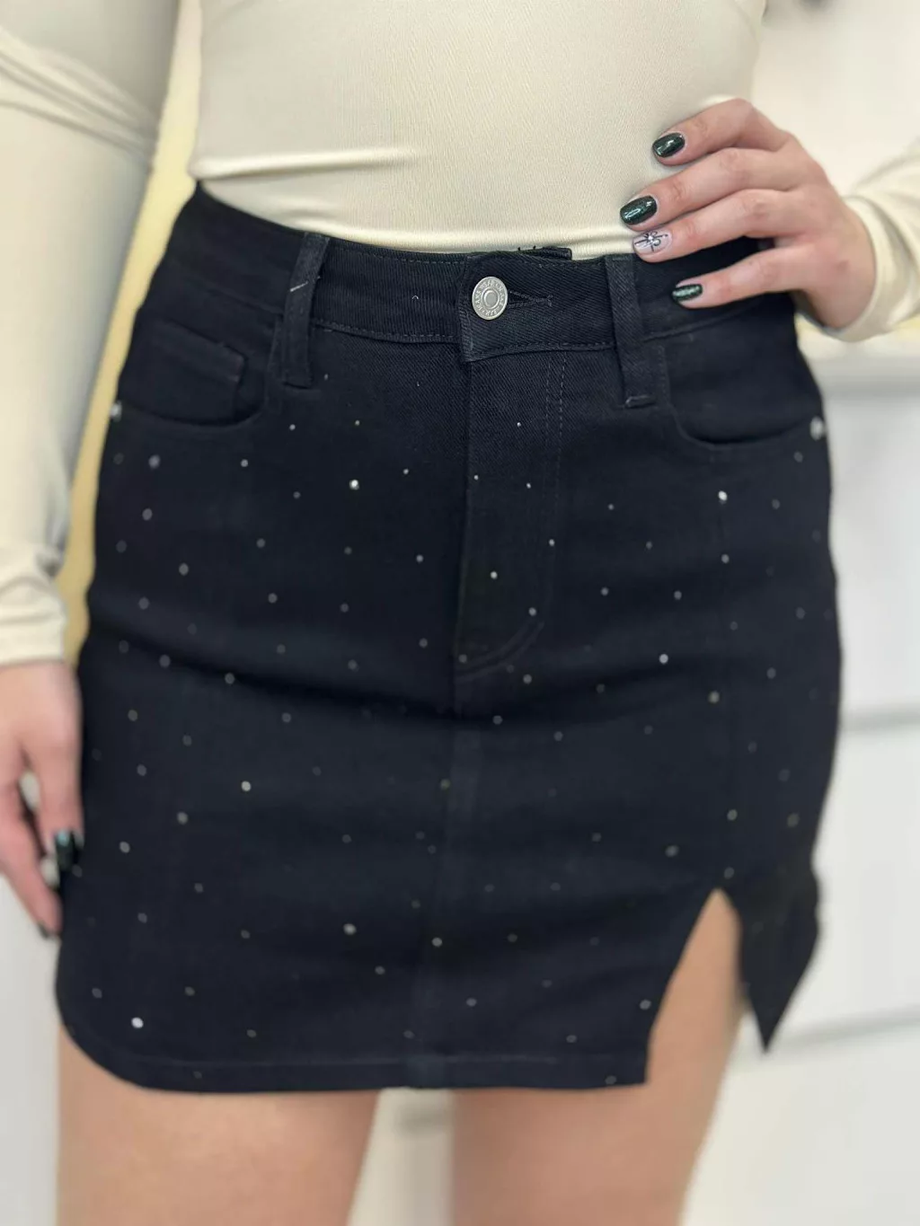 Kövekkel díszített farmer skort