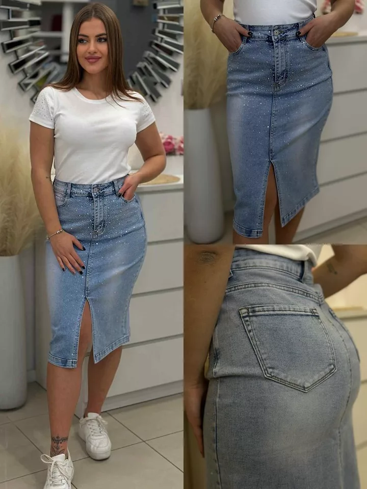 Kövekkel díszített farmerszoknya , rugalmas anyagú, magas derekú. A Modell M méretet visel. A kabát külön vásárolható meg!