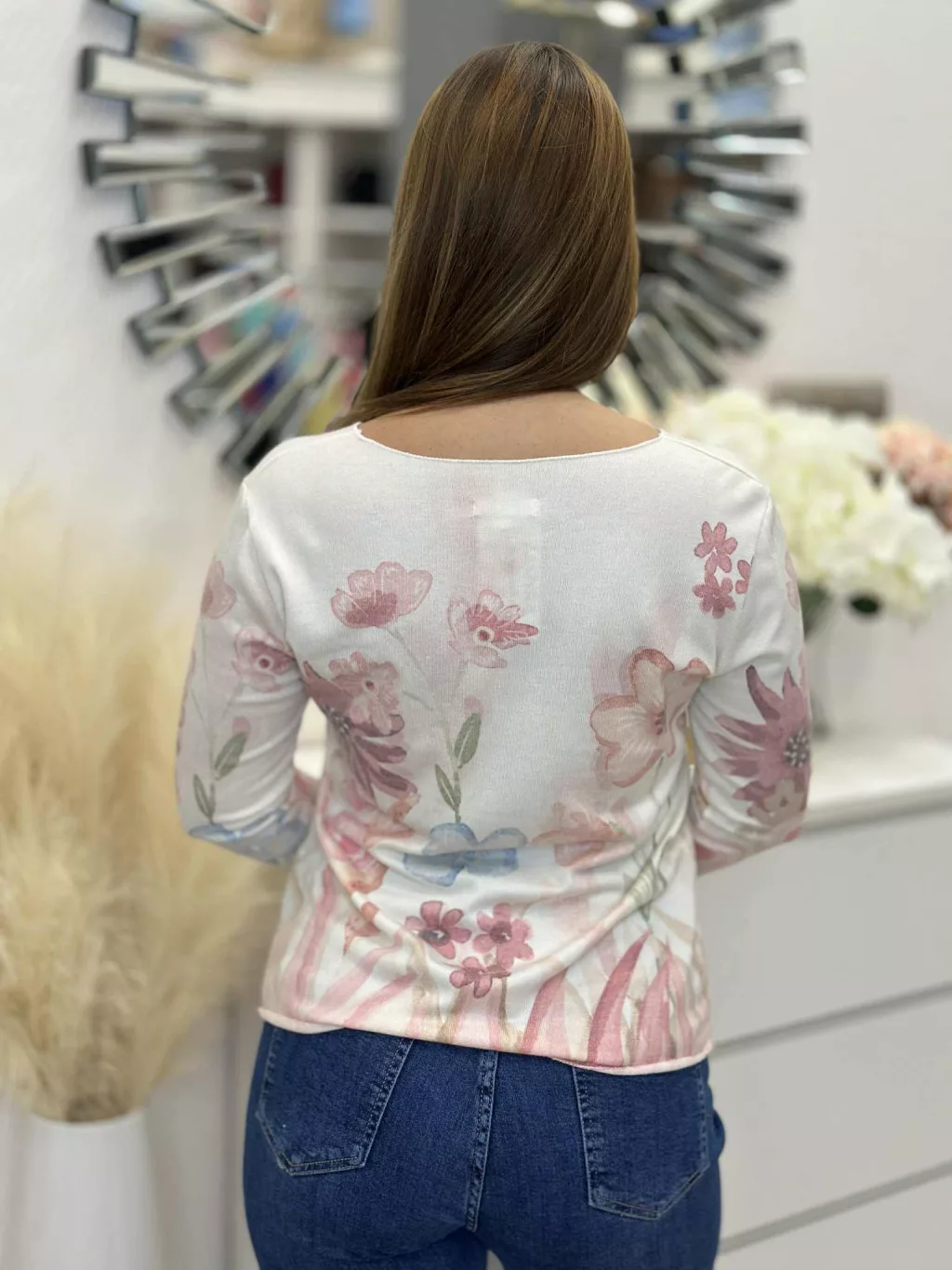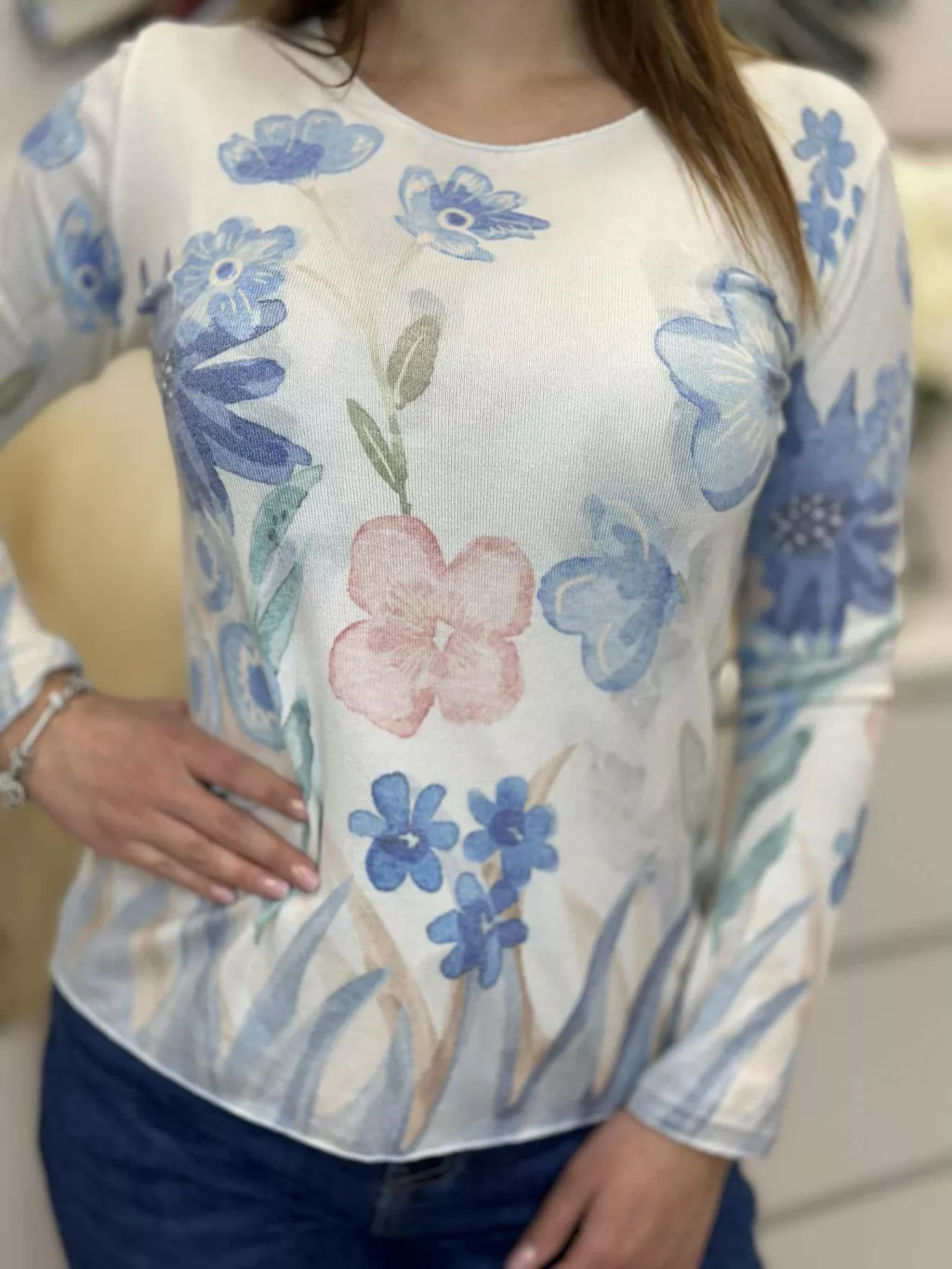 Lenge fazonú felső , extra rugalmas, vékony, kötött, mintás. (S-L méretre ajánljuk.)