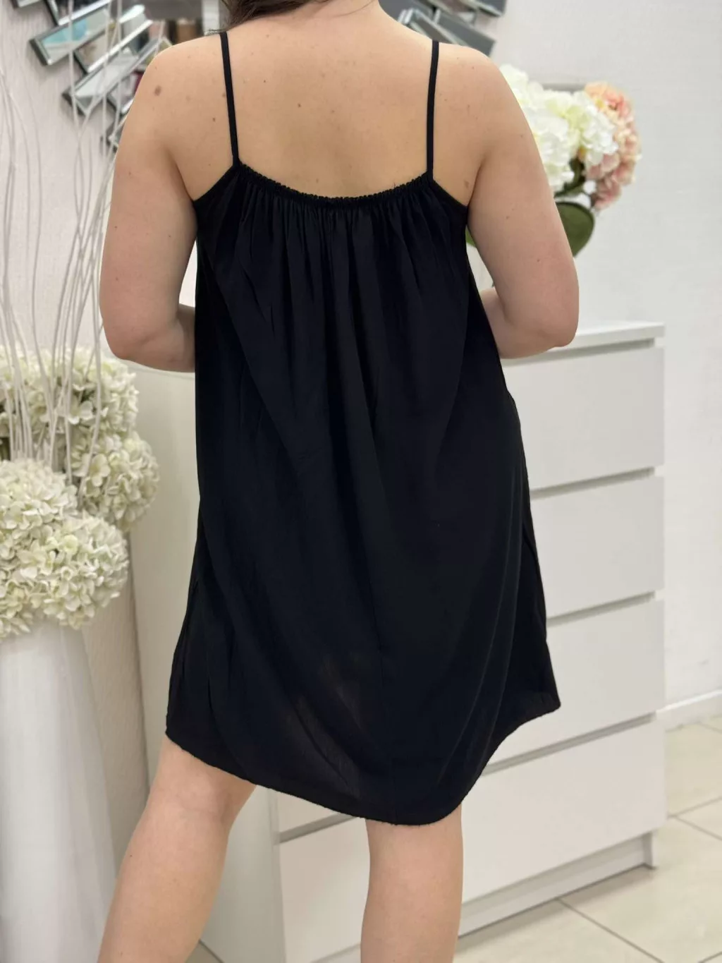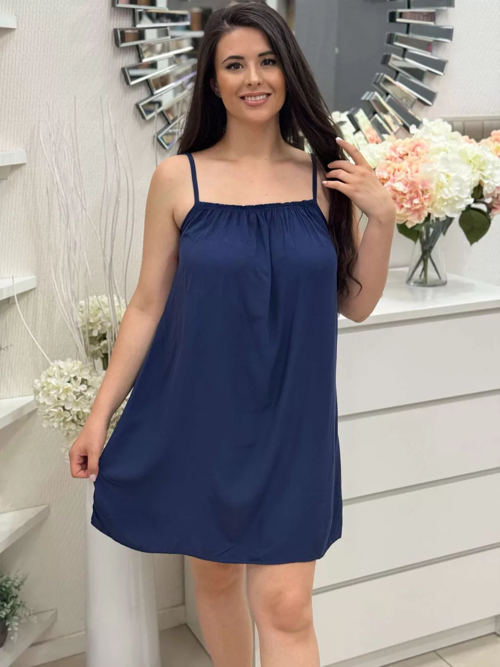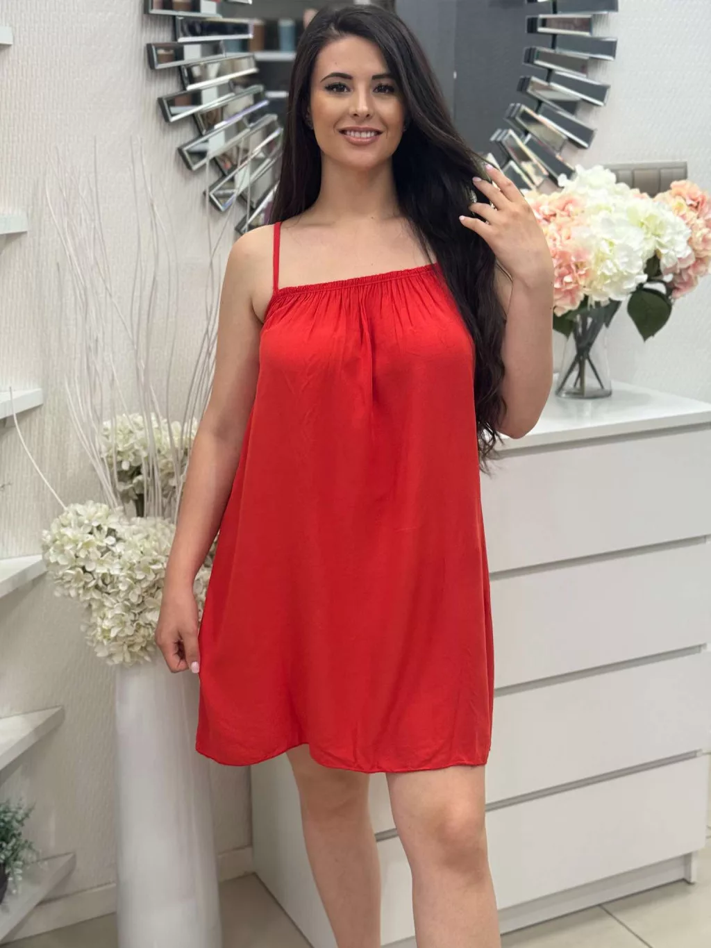 Lenge fazonú, gumis nyakú, nem rugalmas anyagú, pántos nyári ruha. (S-M méretre ajánljuk.)