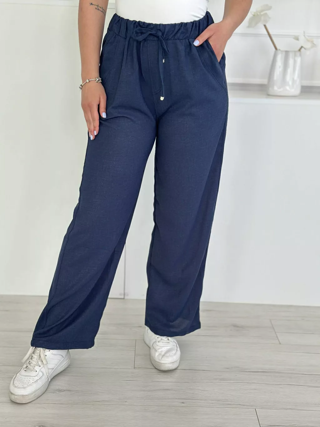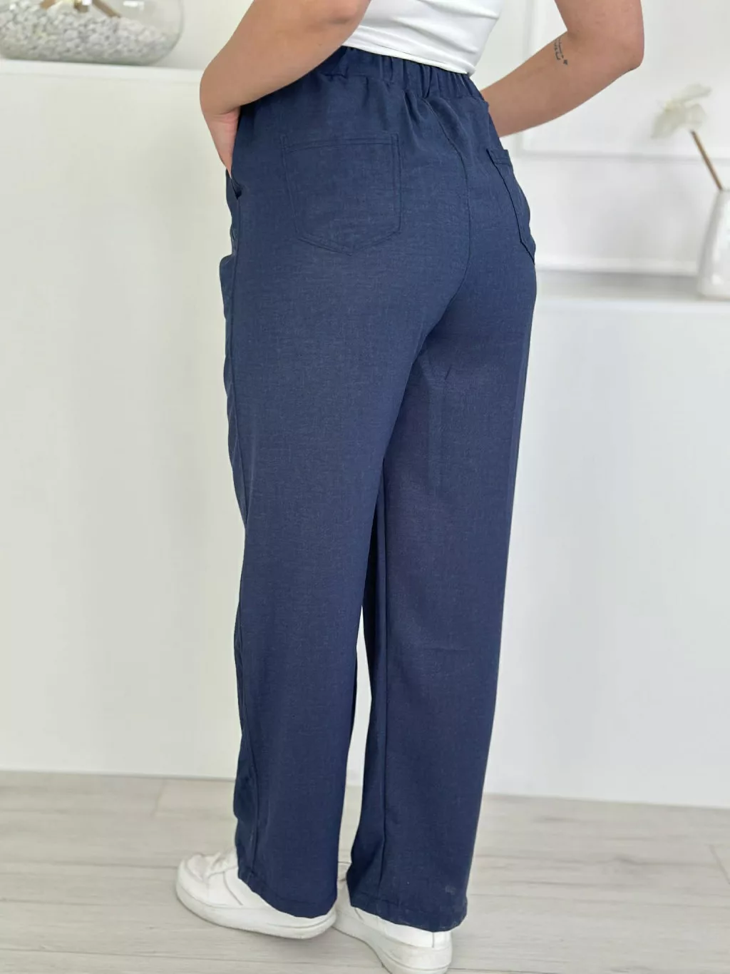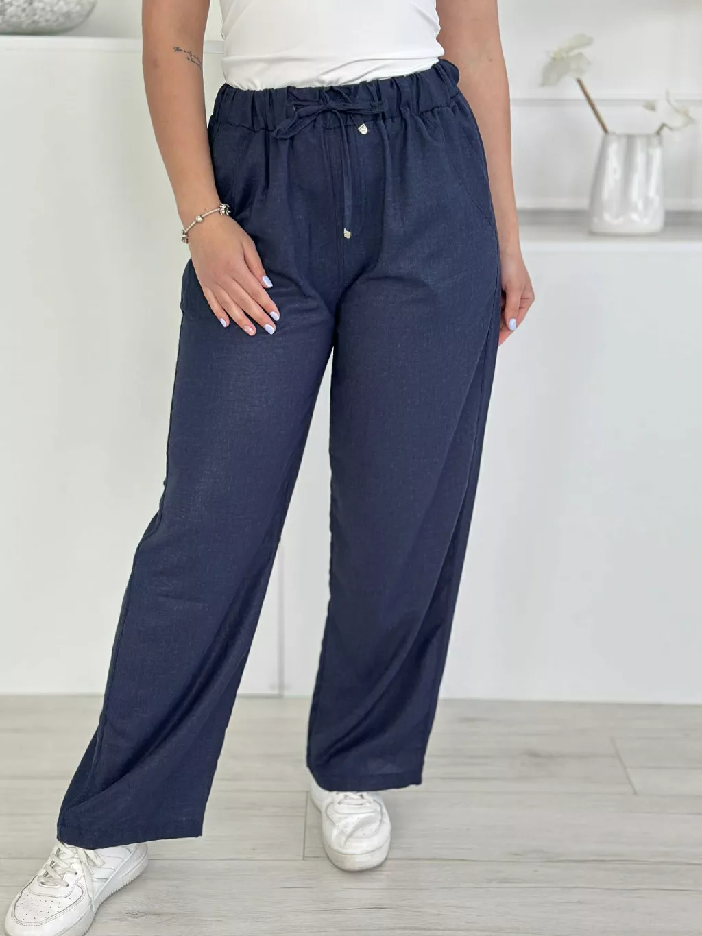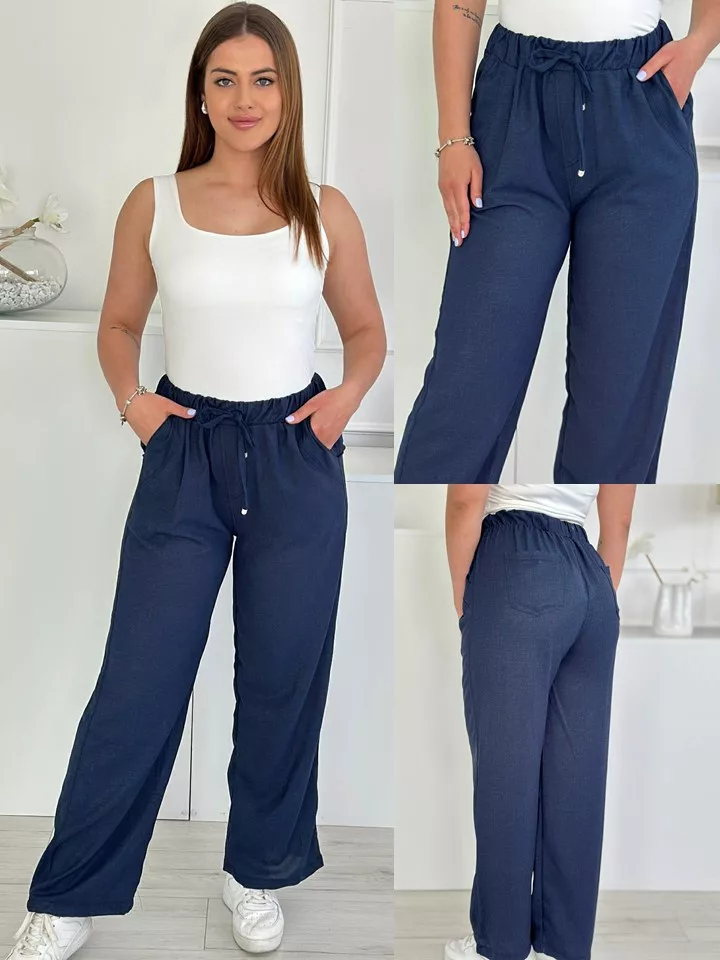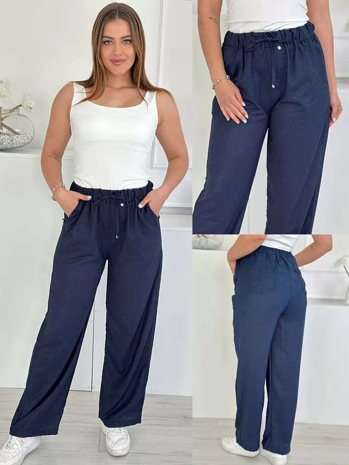 Lenge fazonú nadrág ,magas, gumis derekú, nem rugalmas anyagú, zsebes, megkötős. A Modell L méretet visel.