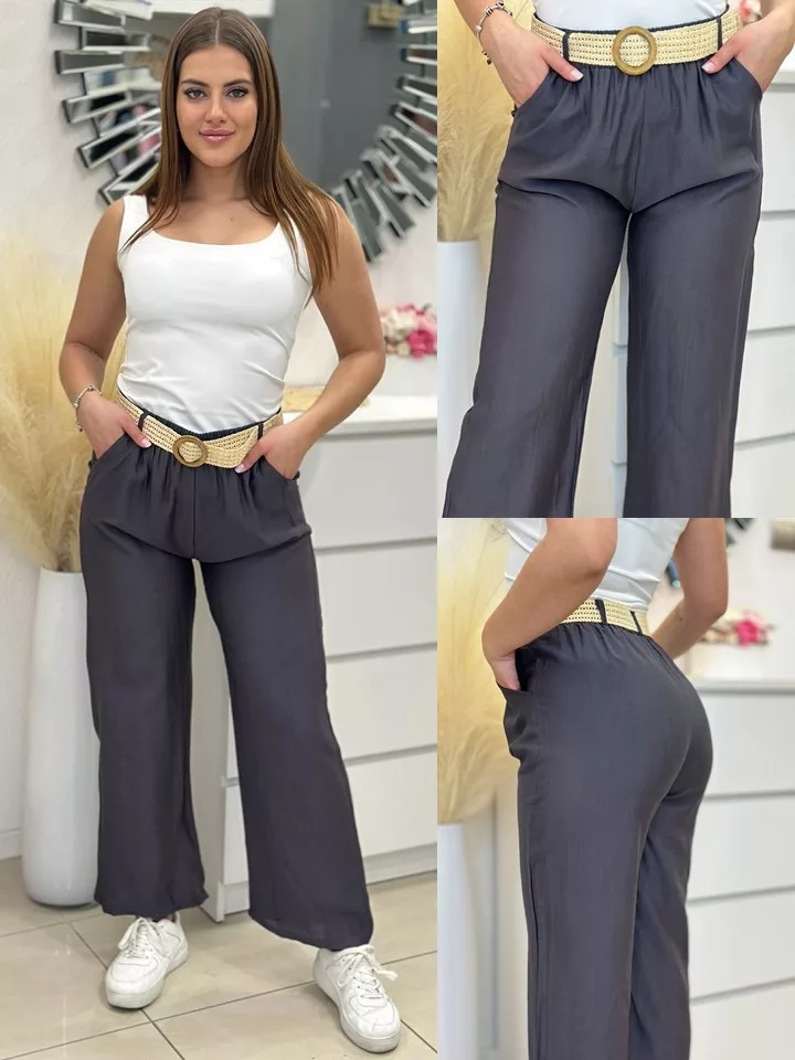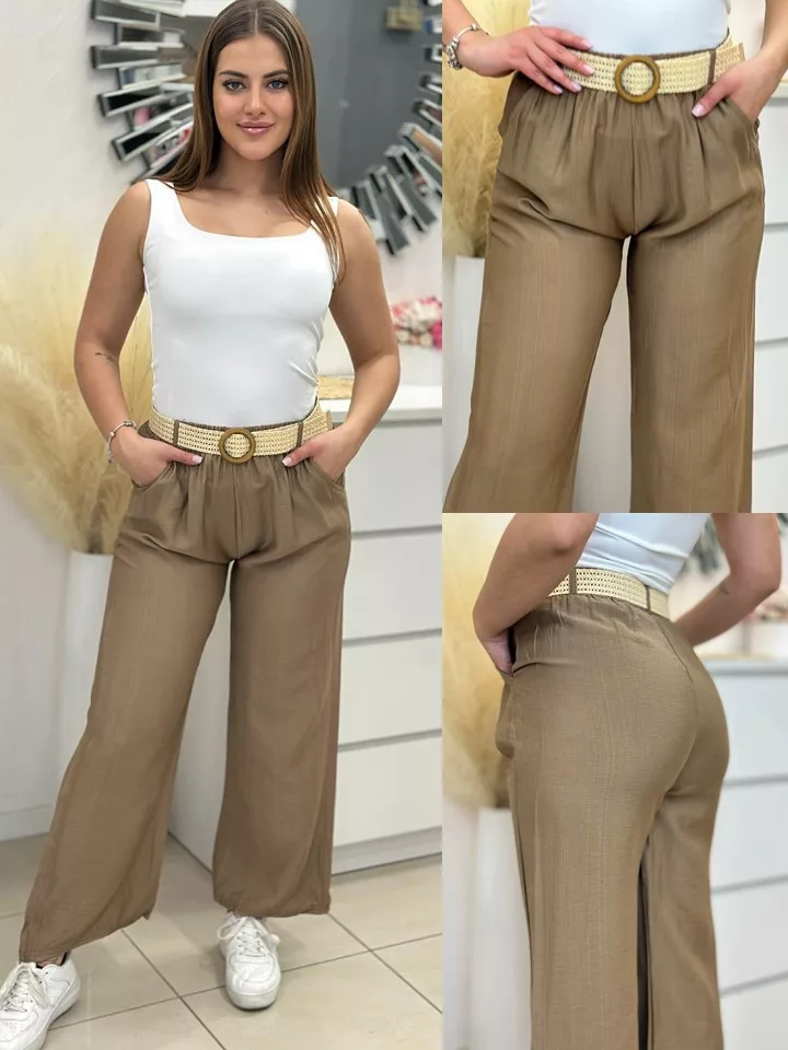Lenge fazonú nadrág ,magas, gumis derekú, zsebes, öves, nem rugalmas anyagú. A Modell M/XL méretet visel.