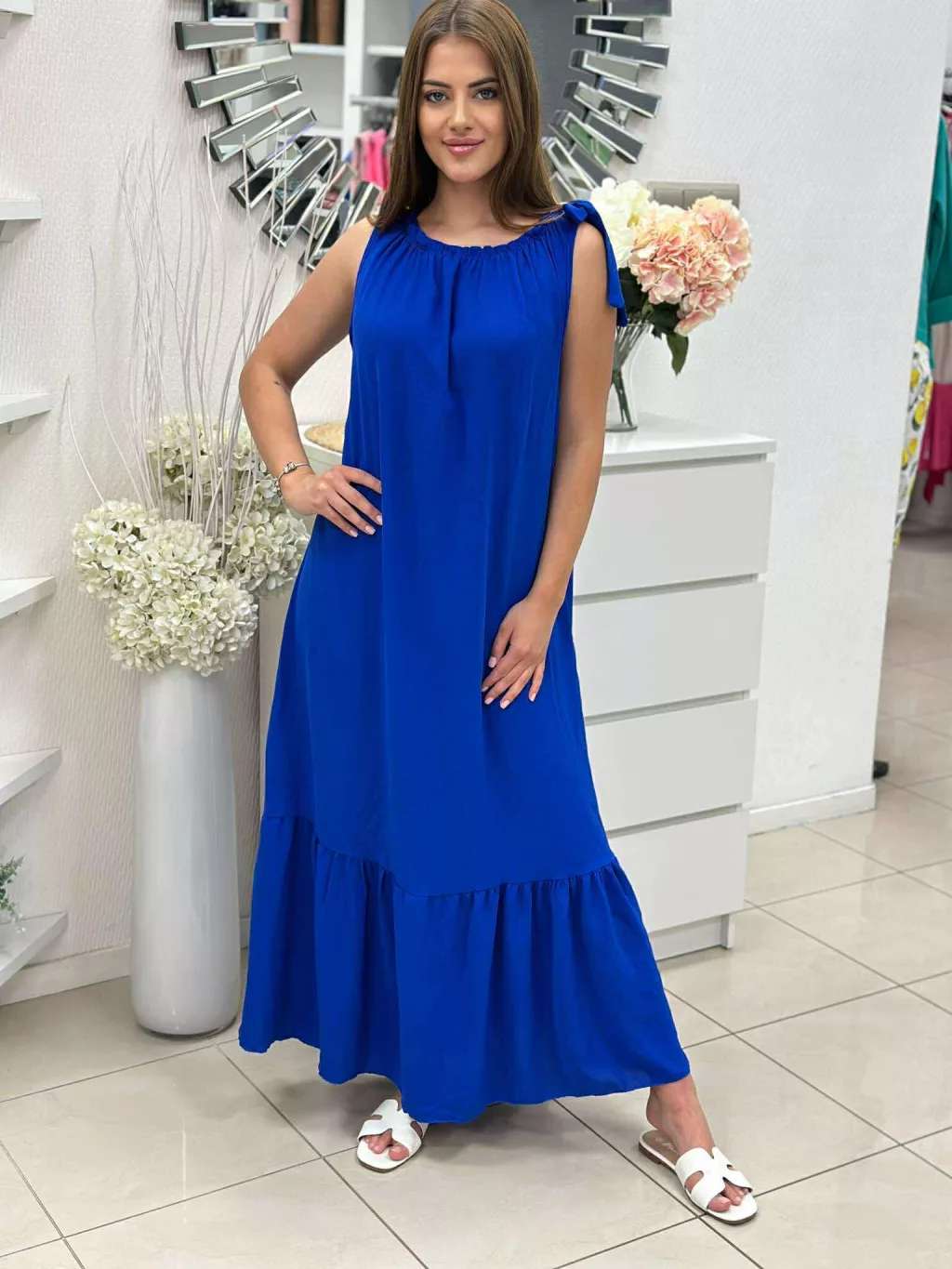 Lenge fazonú, nyakán gumis, megkötős maxiruha. (S-XL méretre ajánljuk.)