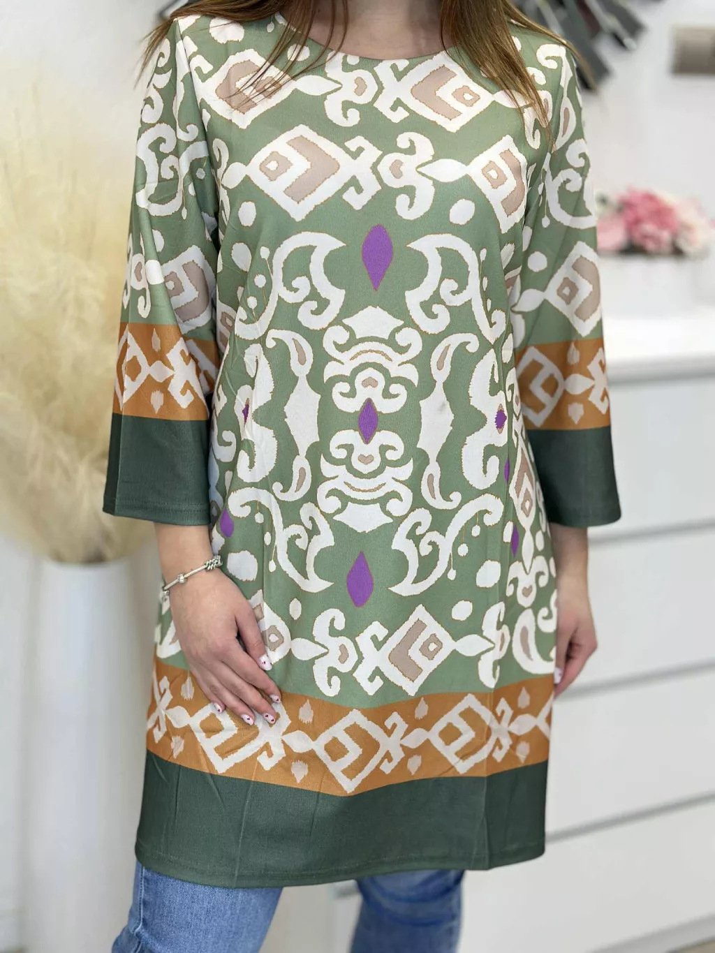 Lenge fazonú ruha , enyhén rugalmas anyagú, A vonalú, mintás. A Modell L méretet visel.
