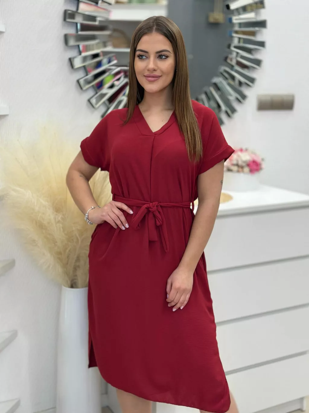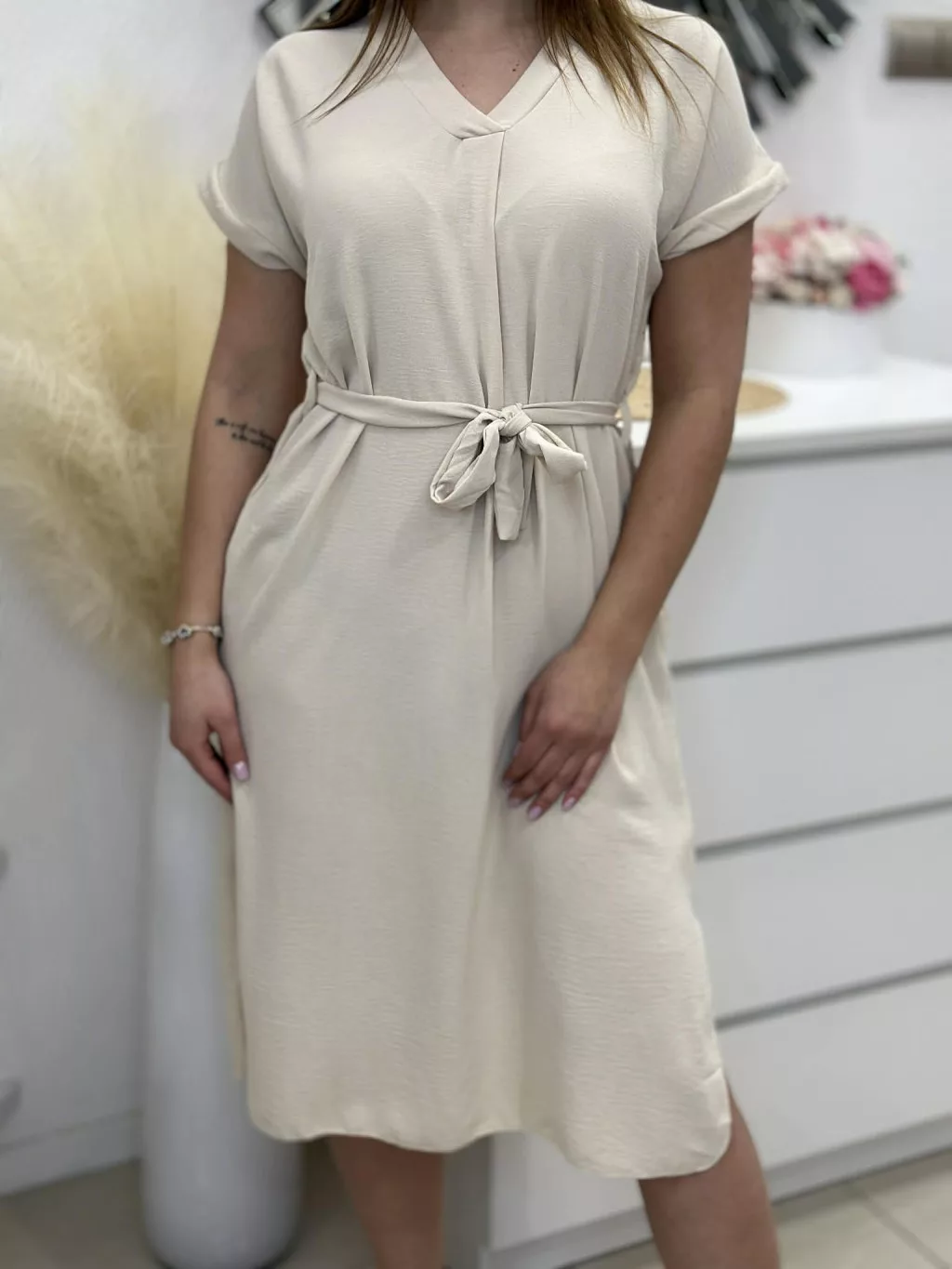 Lenge fazonú, zsebes ruha , megkötős, felsliccelt, nem rugalmas anyagú. A Modell L/XL méretet visel.