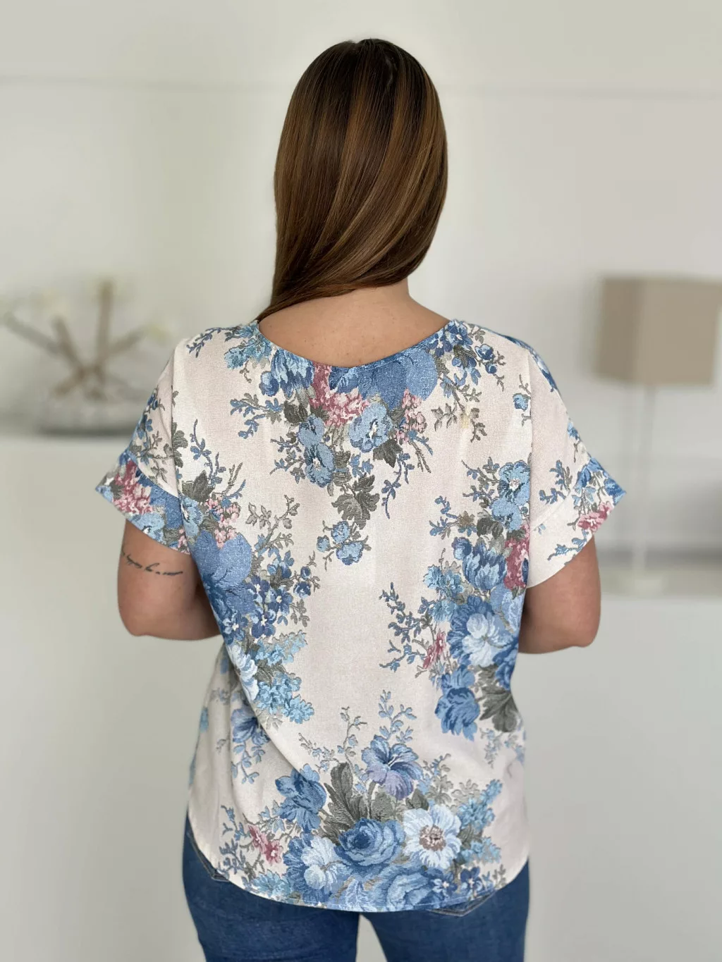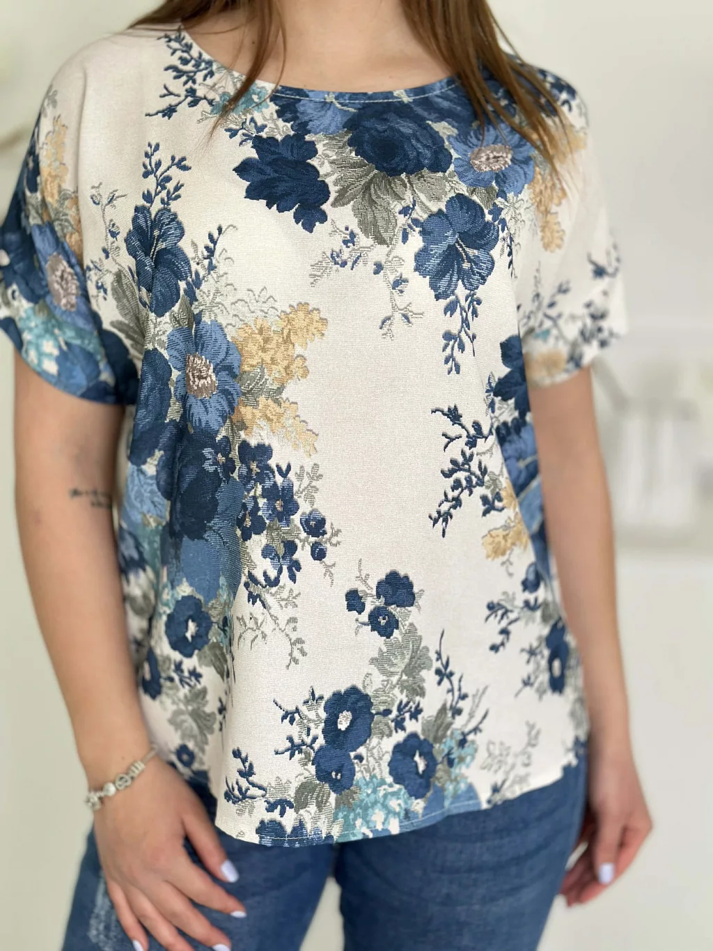 Lenge, mintás blúz ,kerek nyakú, nem rugalmas anyagú. (S-L méretre ajánljuk.)