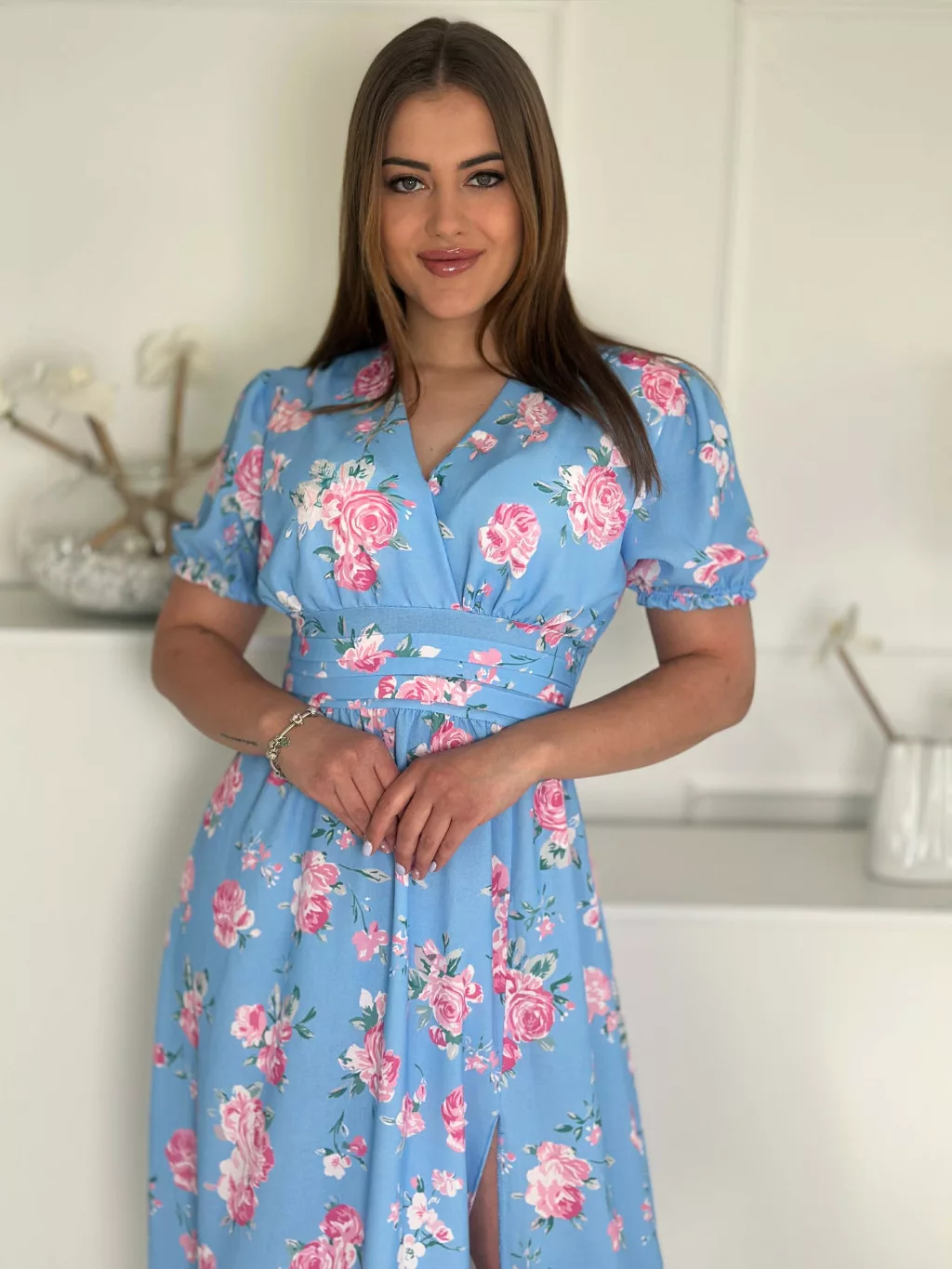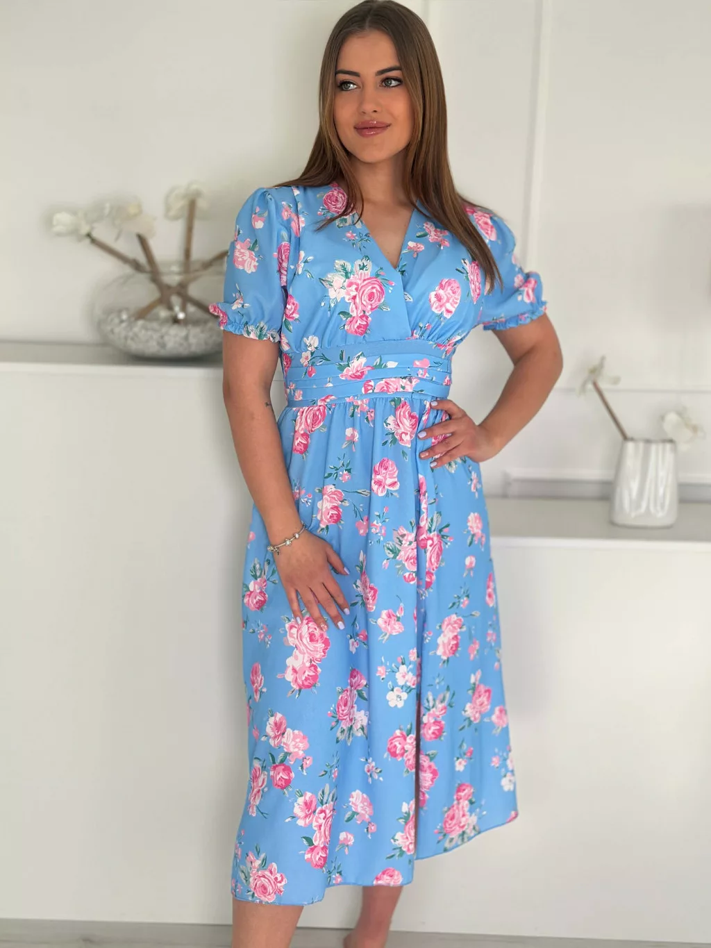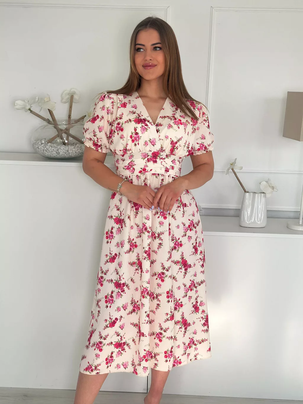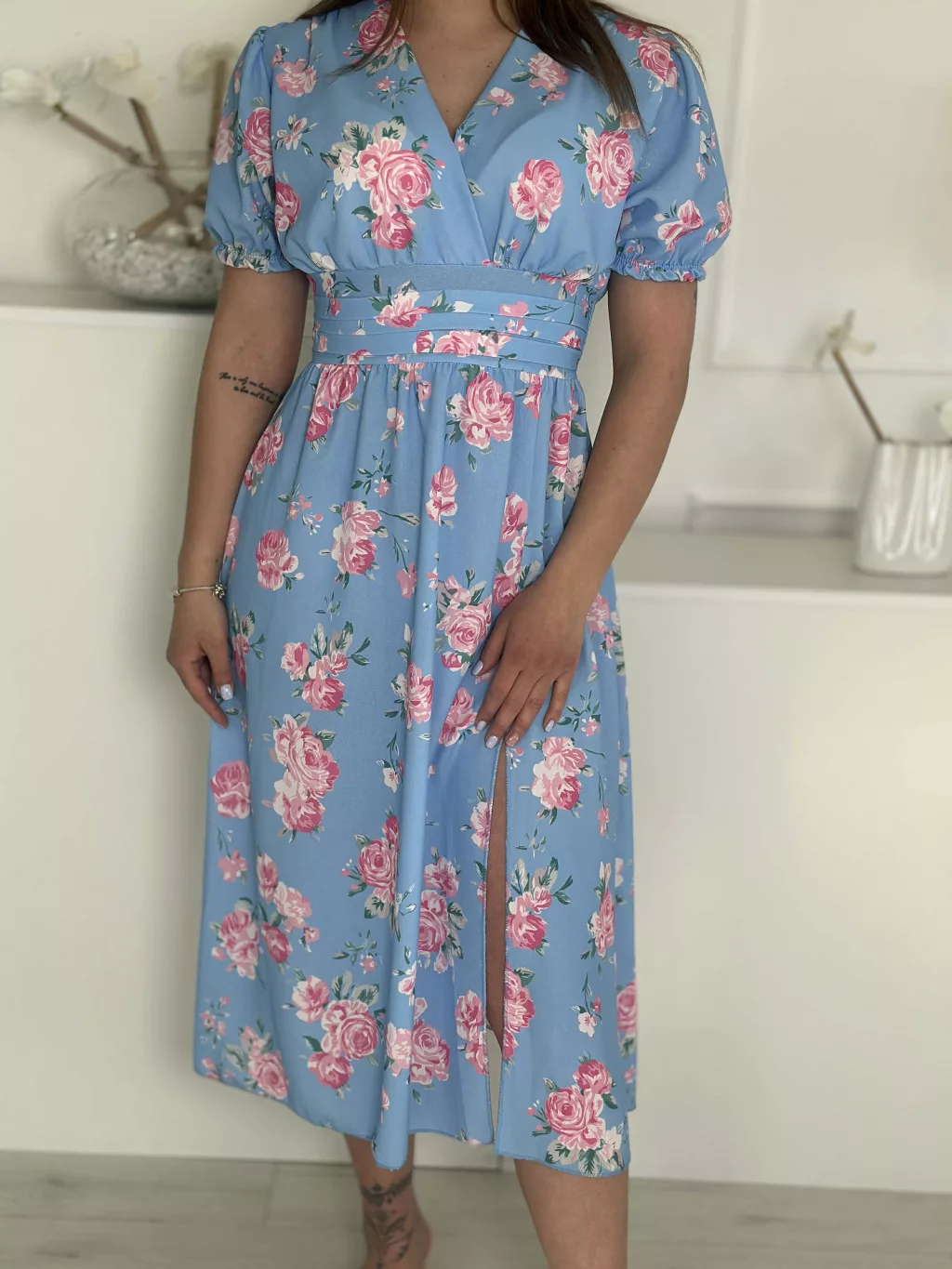 Lenge, mintás ruha ,gumis derekú, átlapolt, felsliccelt, nem rugalmas anyagú. (S-L méretre ajánljuk.)