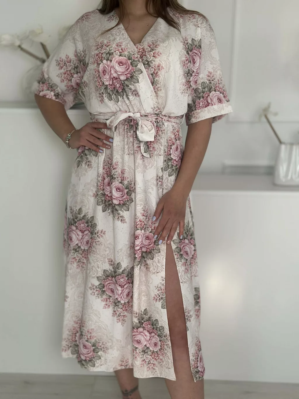Lenge, mintás ruha ,gumis derekú, átlapolt, megkötős, felsliccelt, nem rugalmas anyagú. (S-L méretre ajánljuk.)