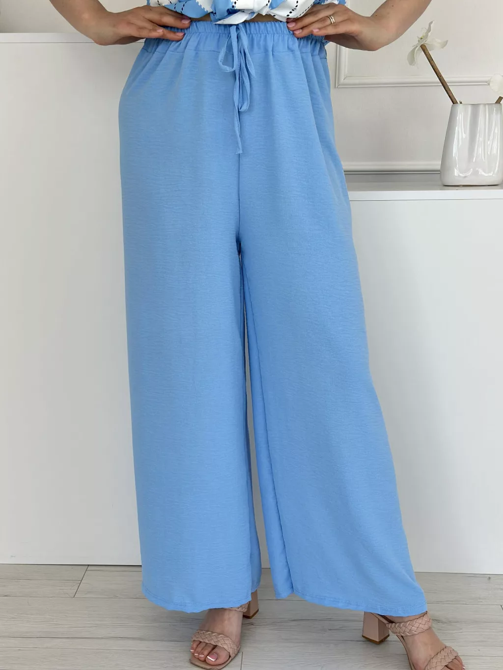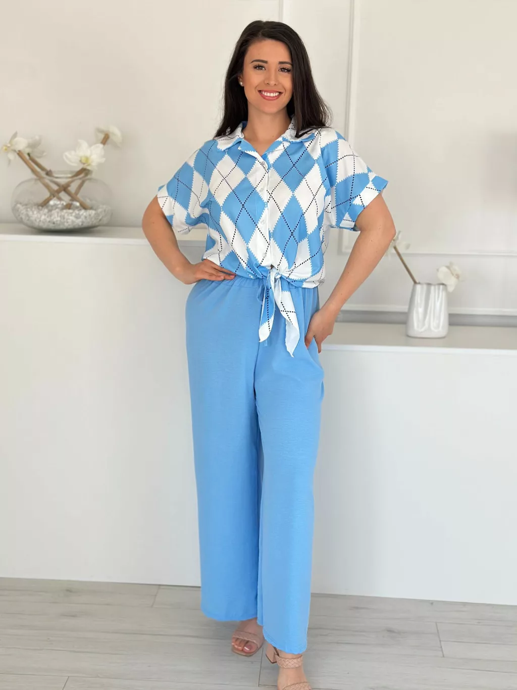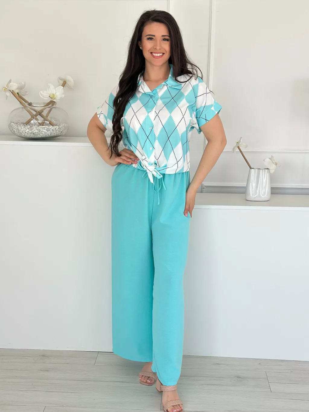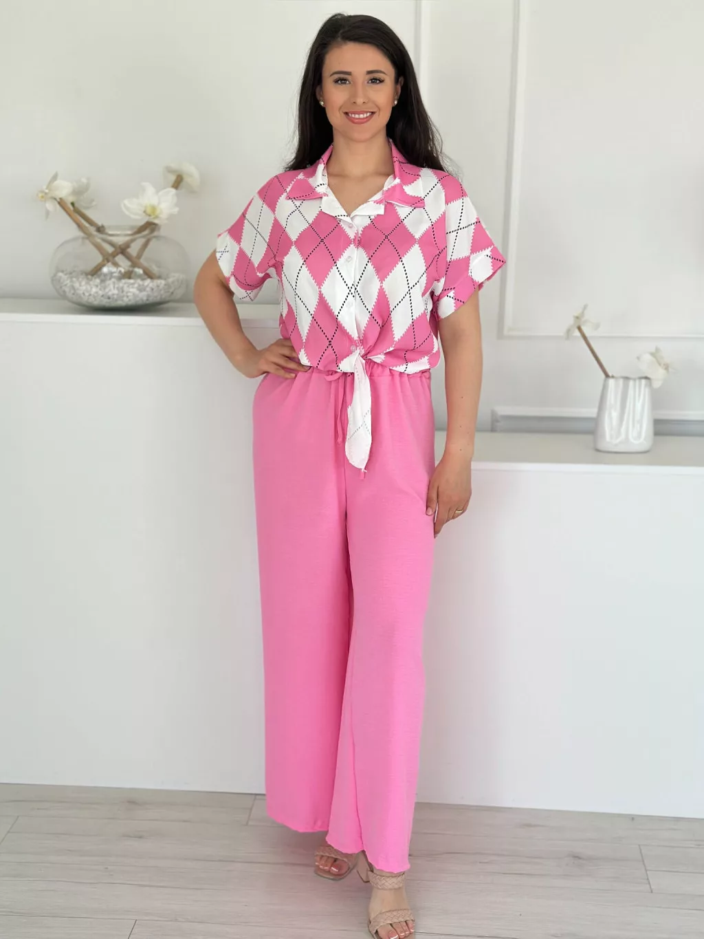 Lenge szett ,nem rugalmas, gombos, megkötős felső, magas, gumis derekú nadrággal. (S-L méretre ajánljuk.)