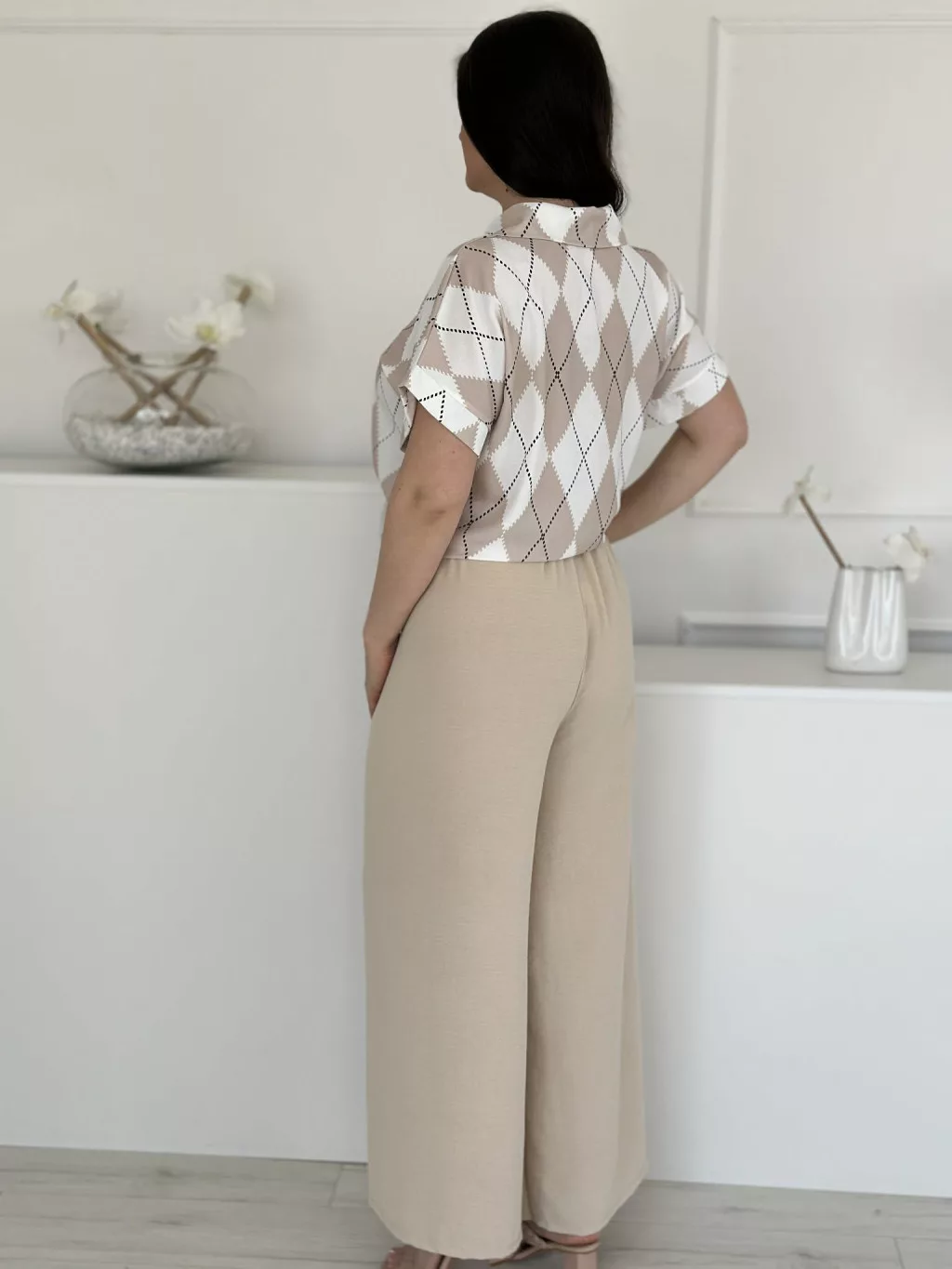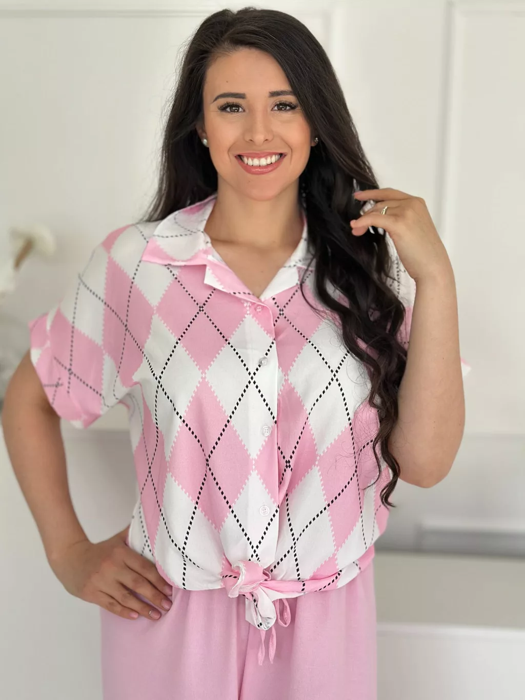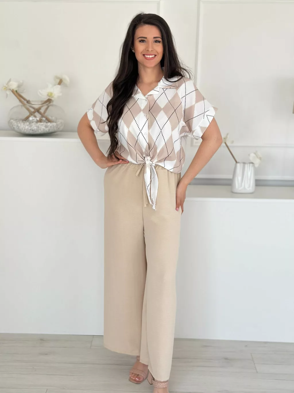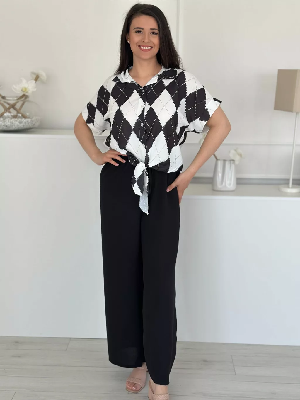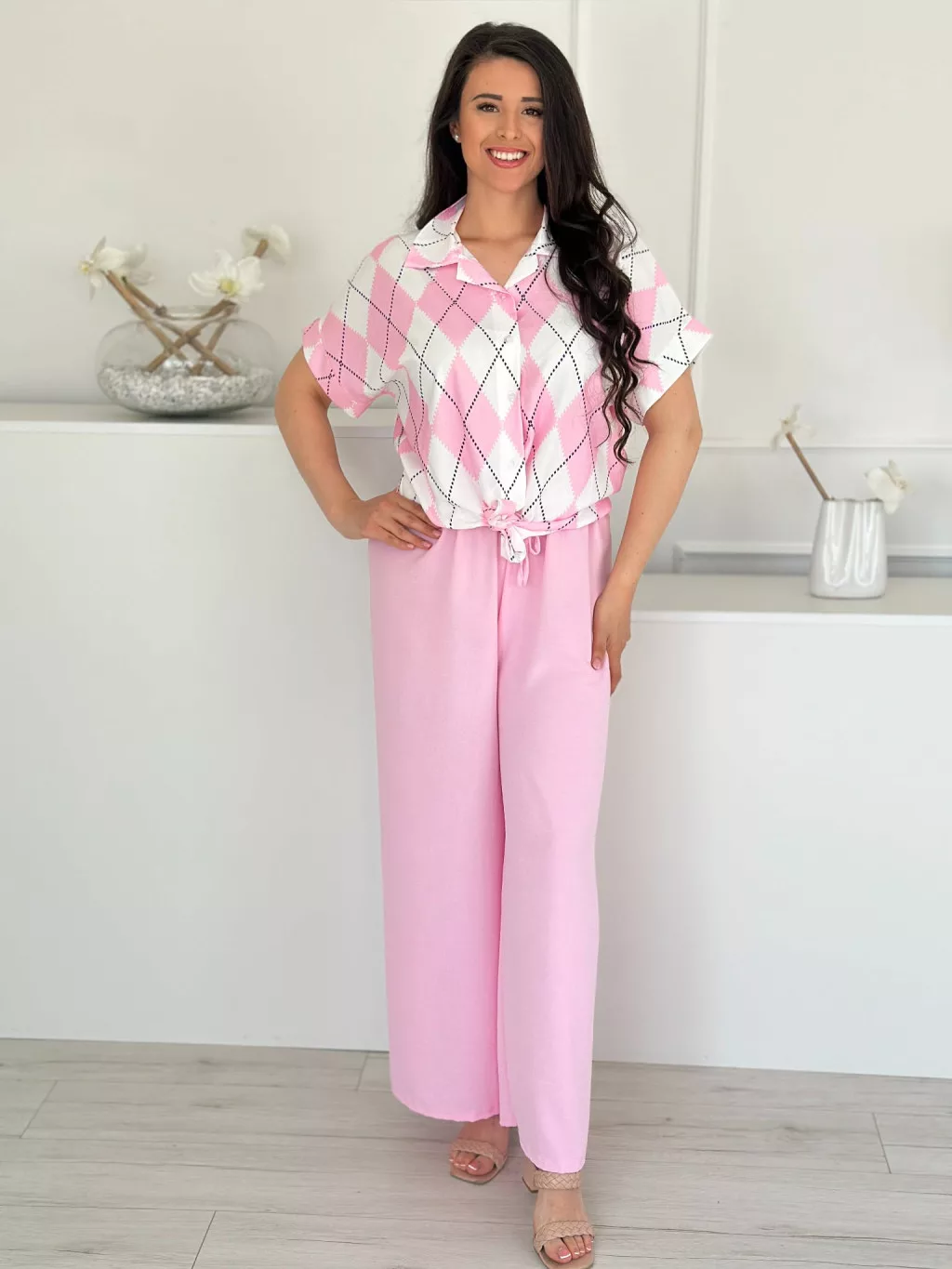 Lenge szett ,nem rugalmas, gombos, megkötős felső, magas, gumis derekú nadrággal. (S-L méretre ajánljuk.)