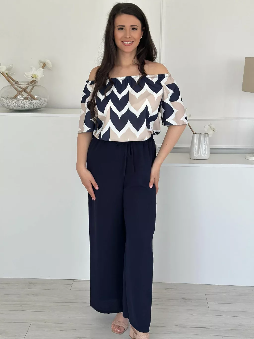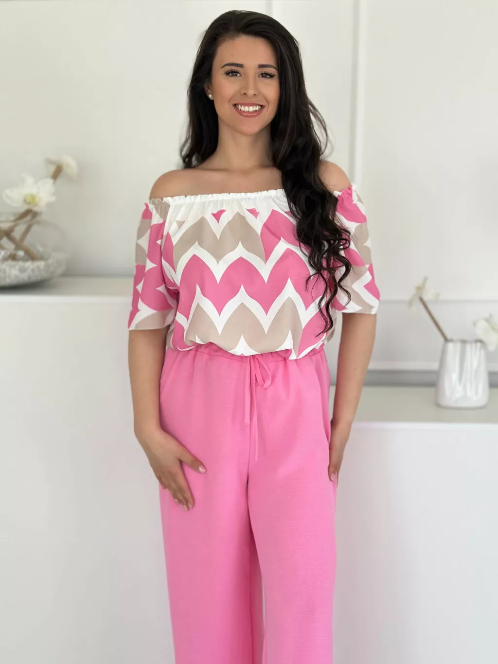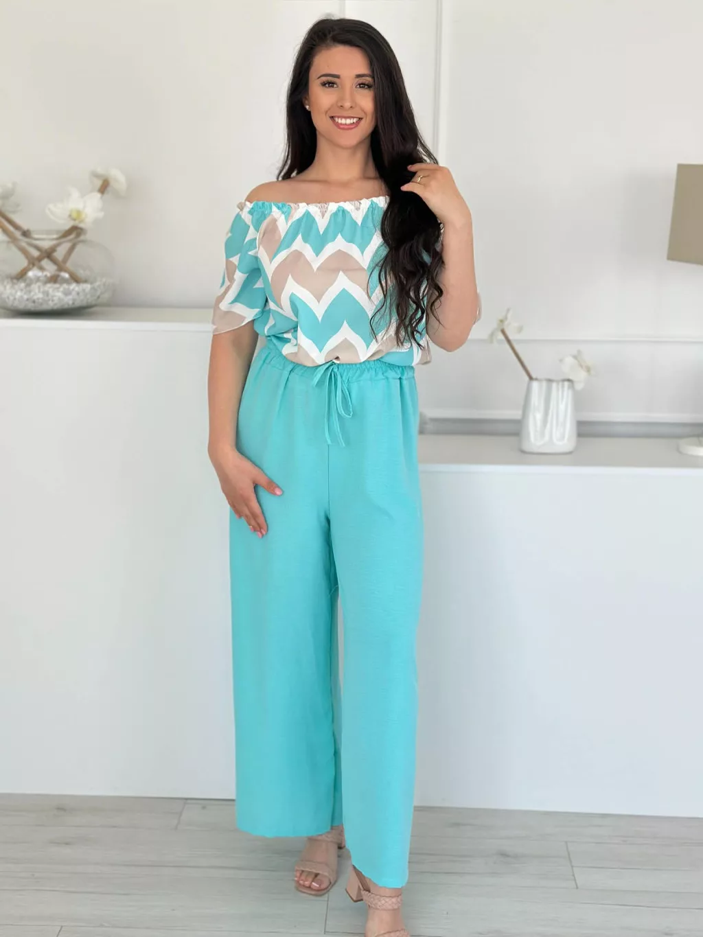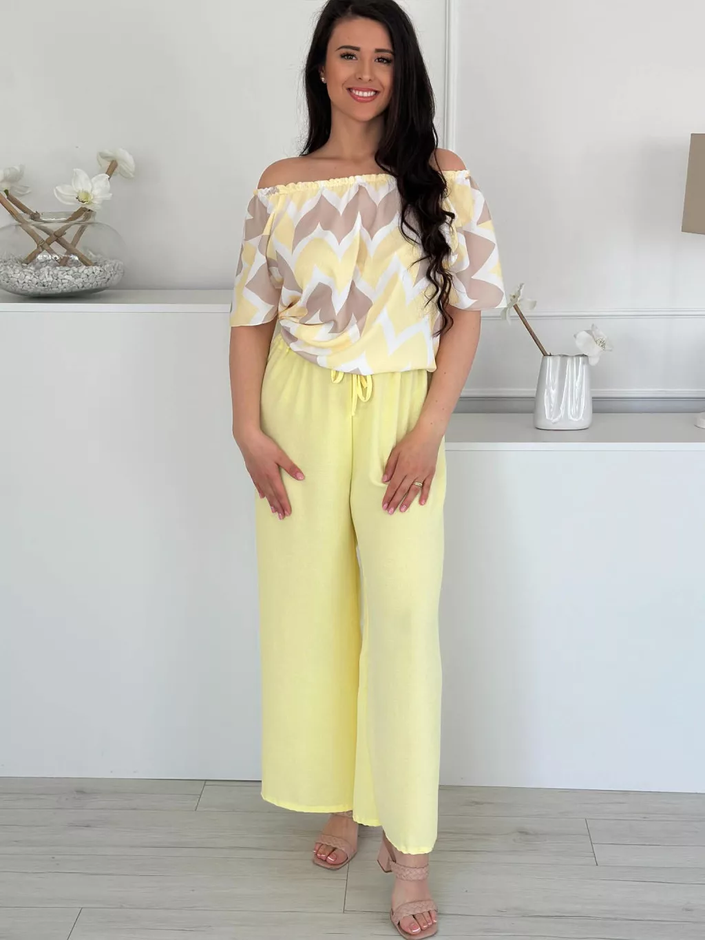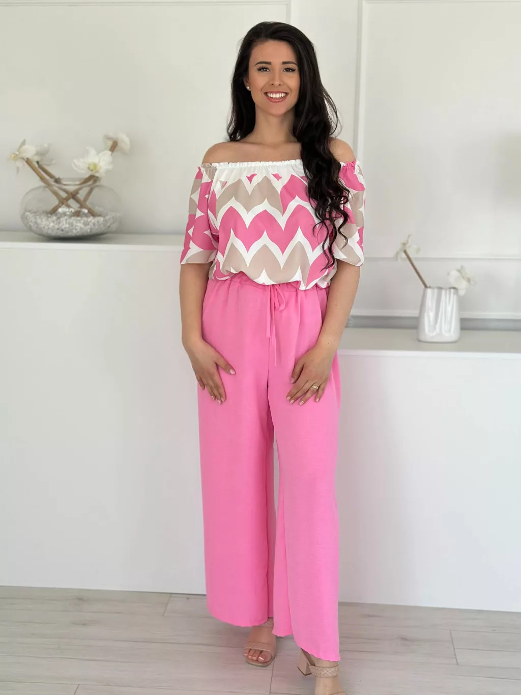 Lenge szett ,nem rugalmas, vállra lehúzhtaó, gumis felső, magas, gumis derekú nadrággal. (S-L méretre ajánljuk.)