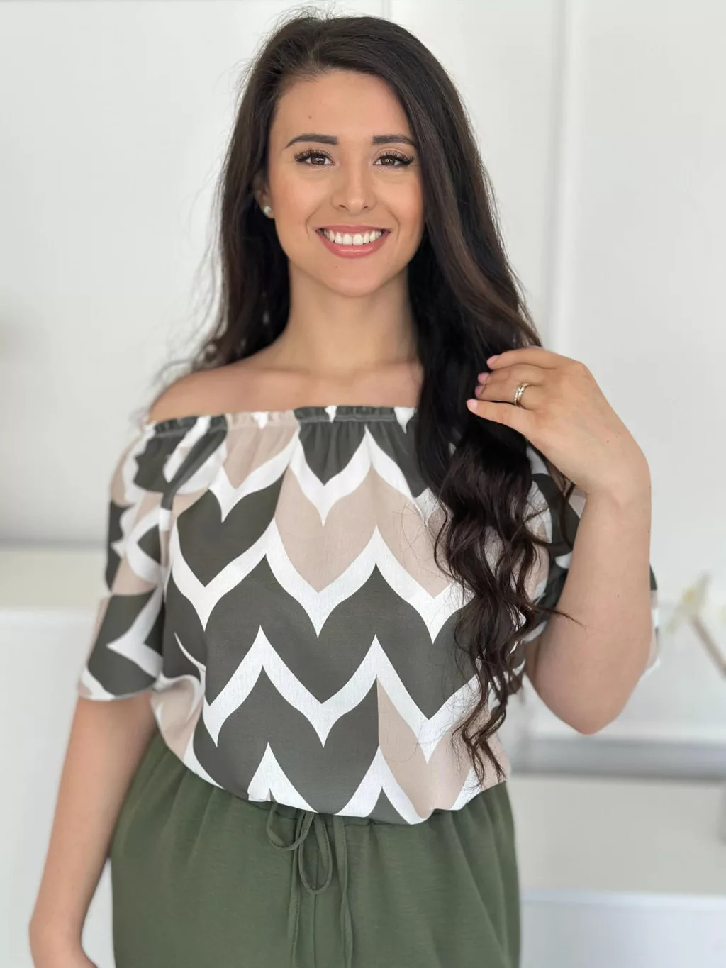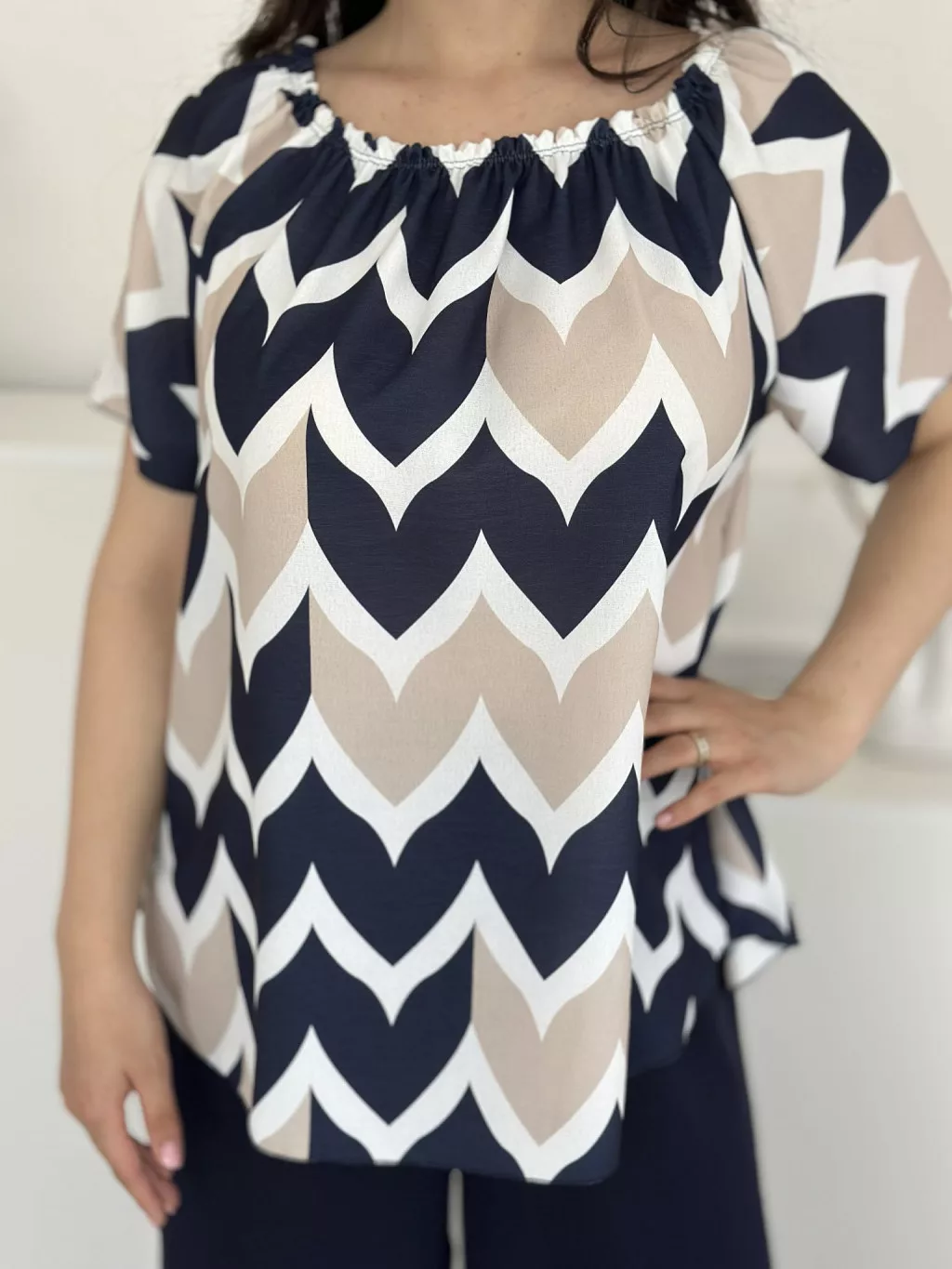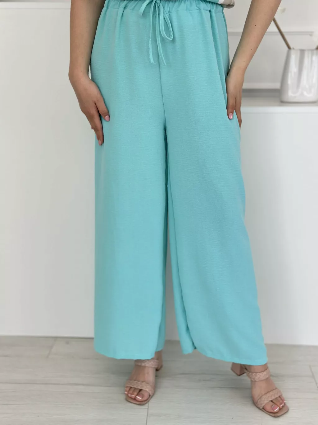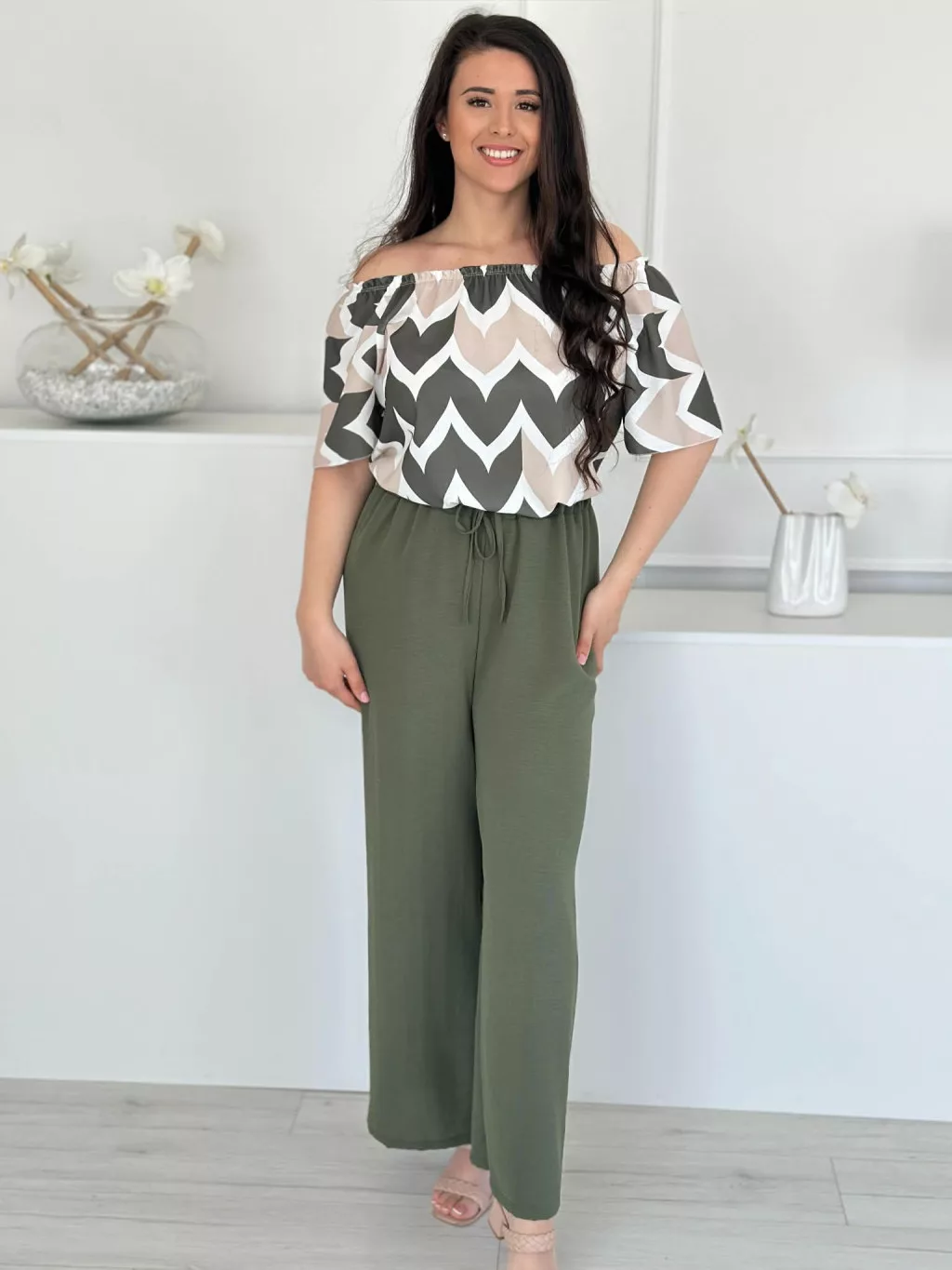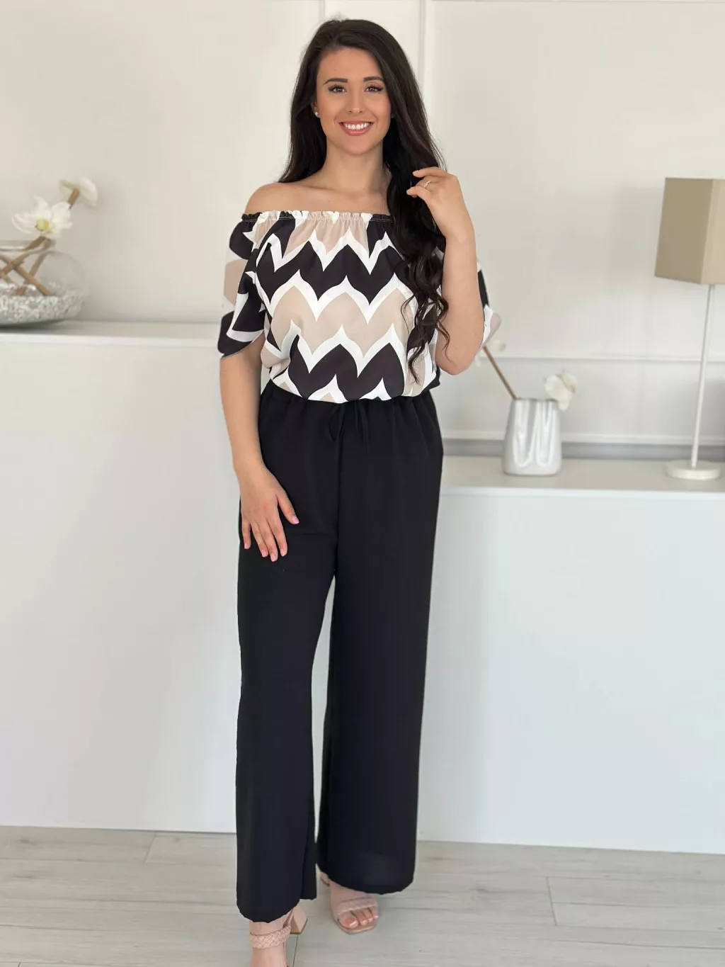 Lenge szett ,nem rugalmas, vállra lehúzhtaó, gumis felső, magas, gumis derekú nadrággal. (S-L méretre ajánljuk.)