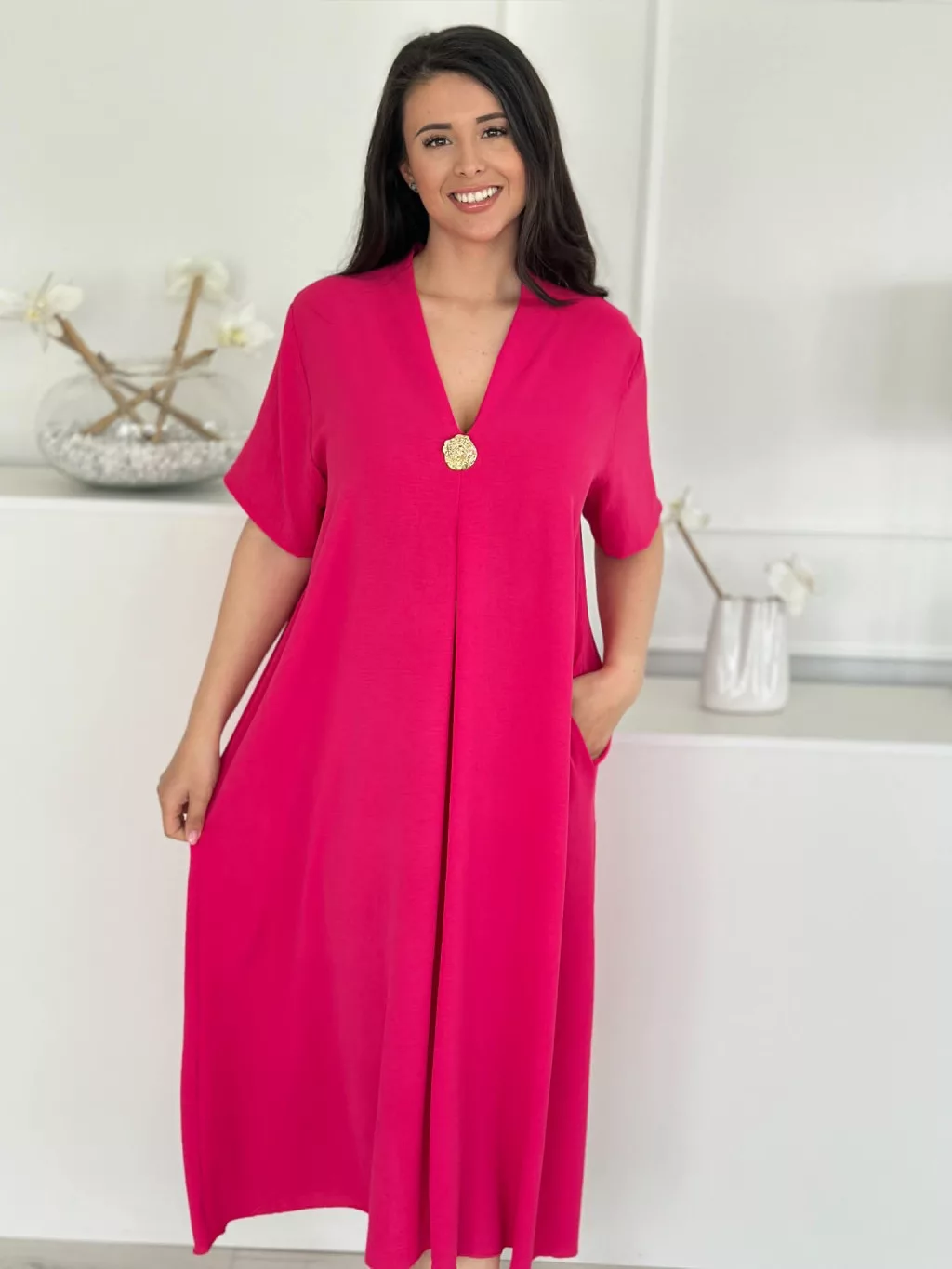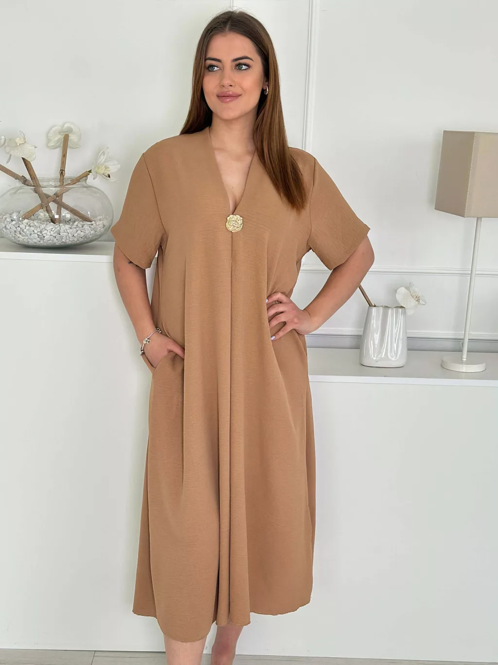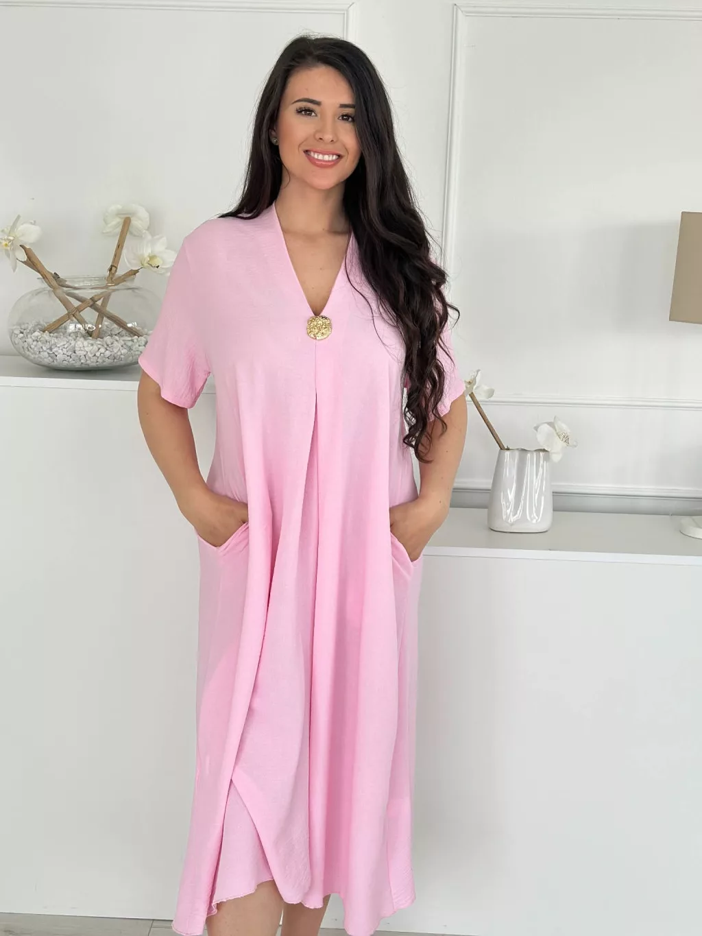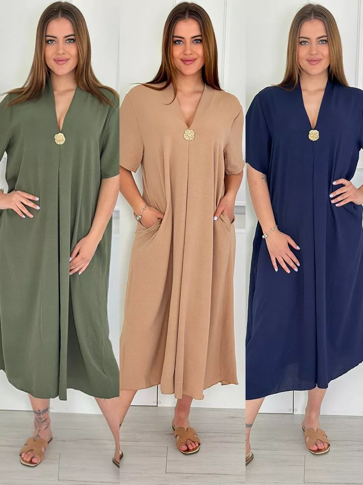Lenge, zsebes ruha , nem rugalmas, levehető kitűzővel. (M-XL méretre ajánljuk.)