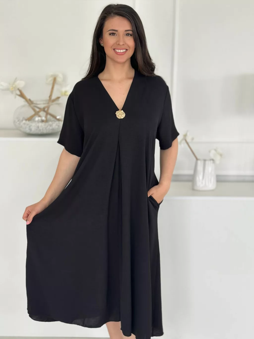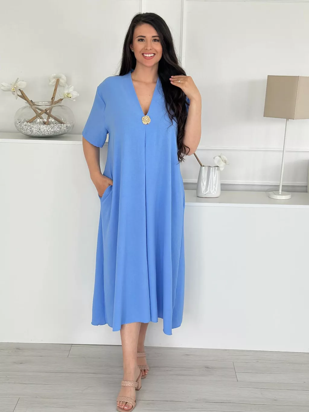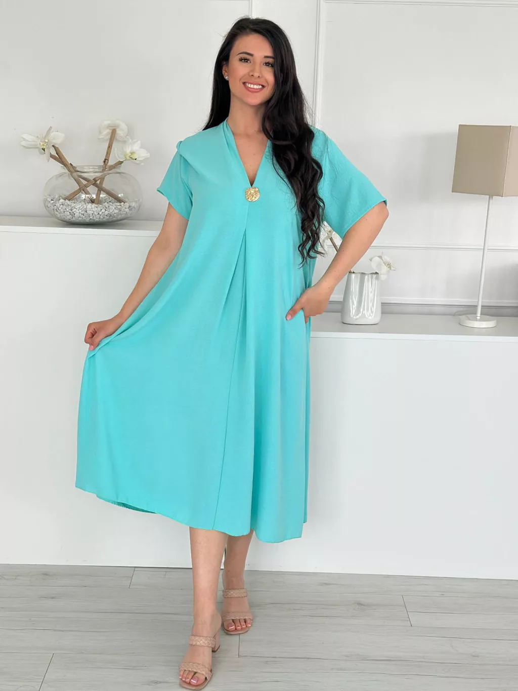 Lenge, zsebes ruha , nem rugalmas, levehető kitűzővel. (M-XL méretre ajánljuk.)
