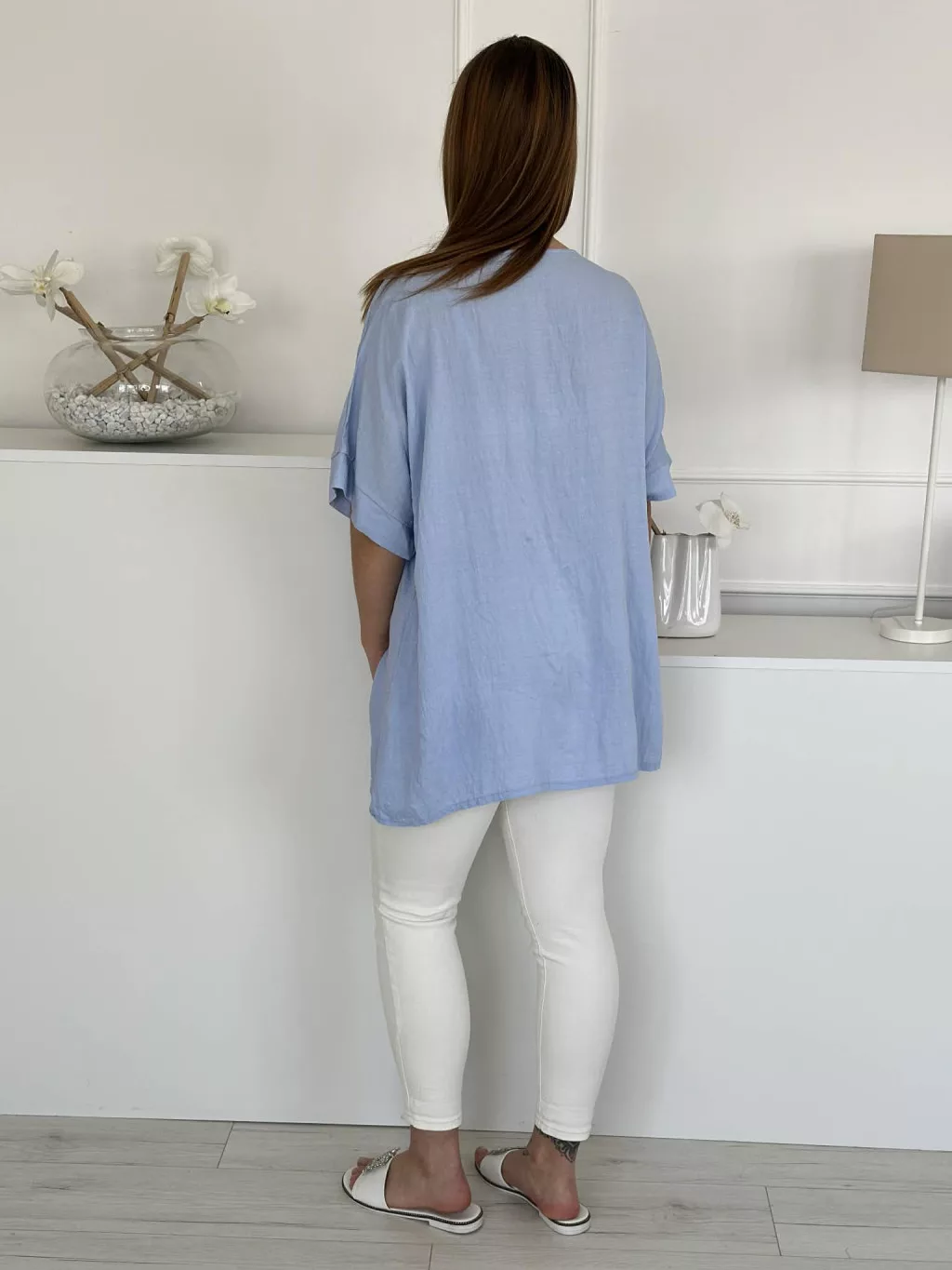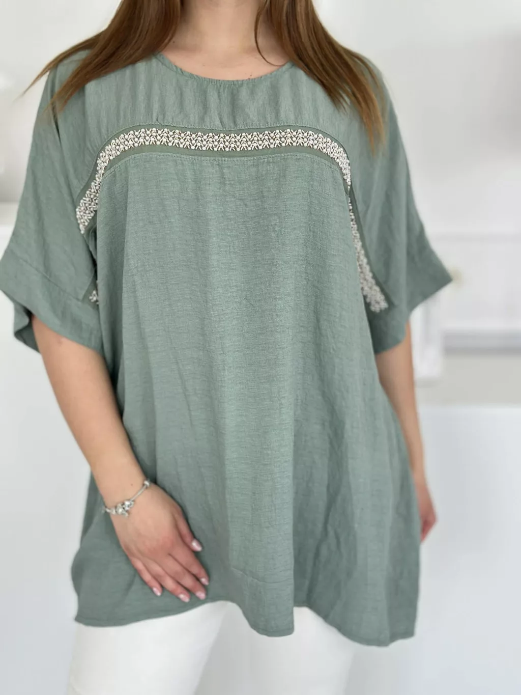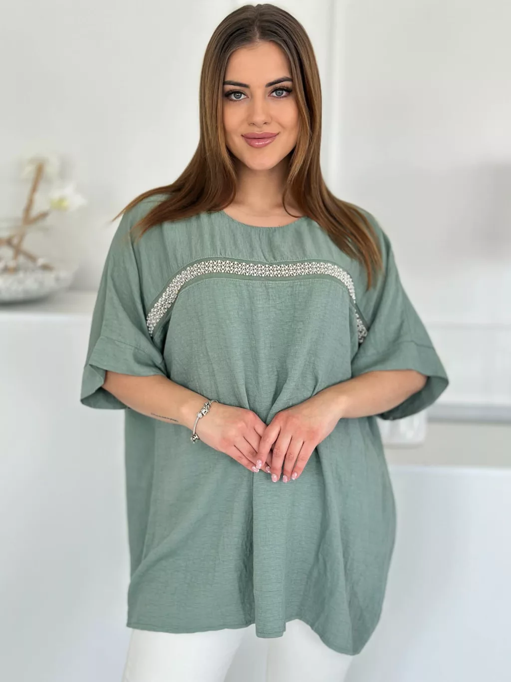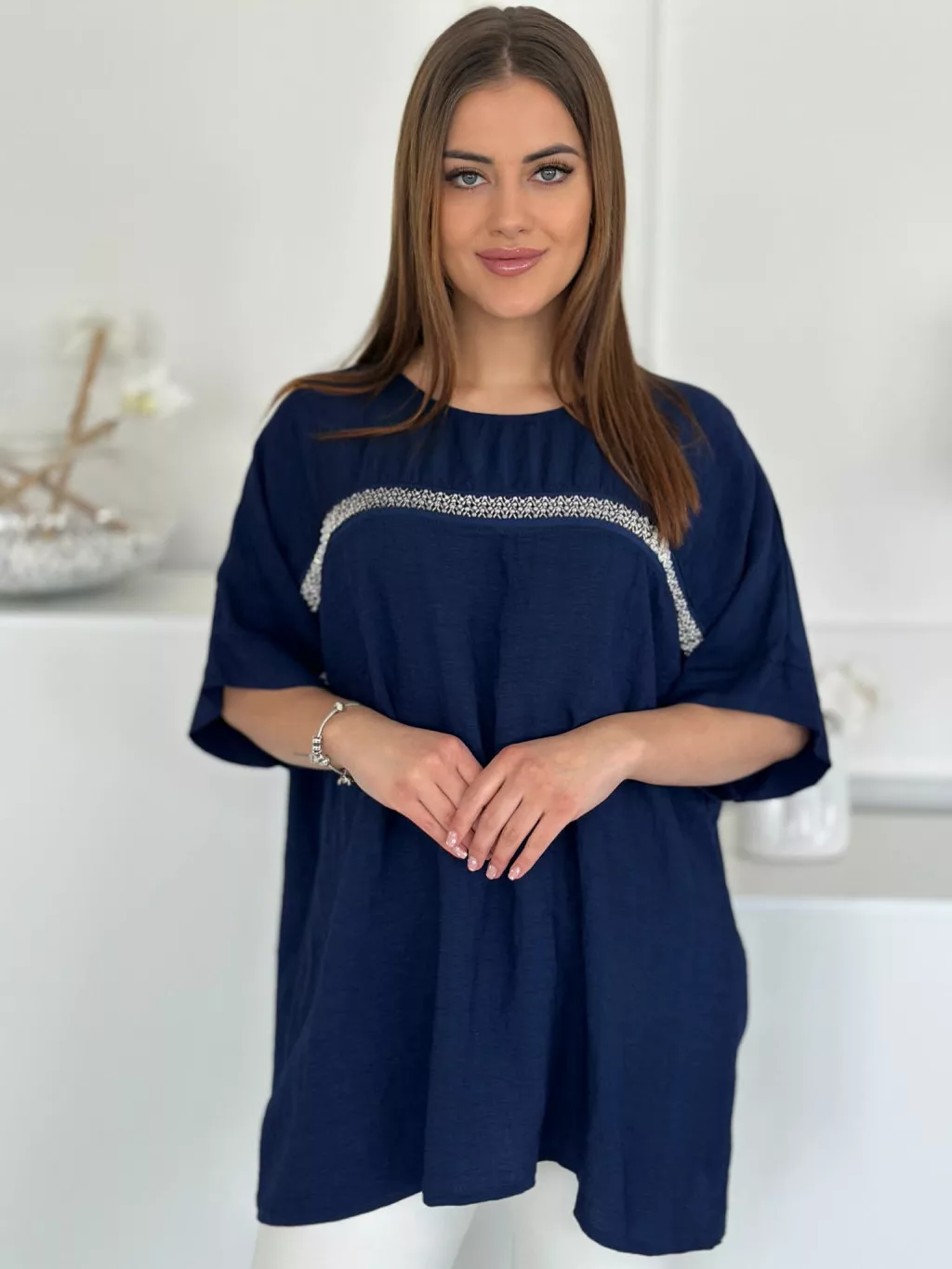 Lenvászon hatású, pamut tunika ,gyöngyökkel díszített, lenge fazonú, nem rugalmas anyagú. (M-XL méretre ajánljuk.)