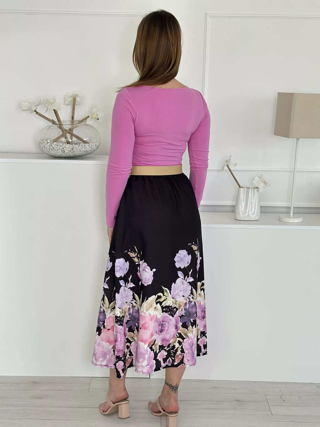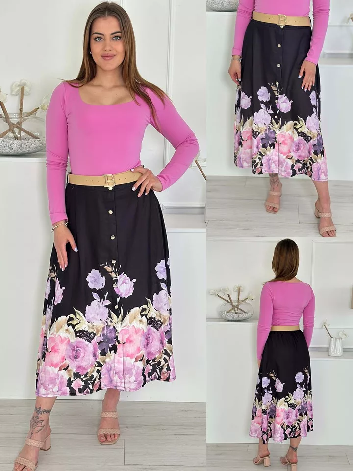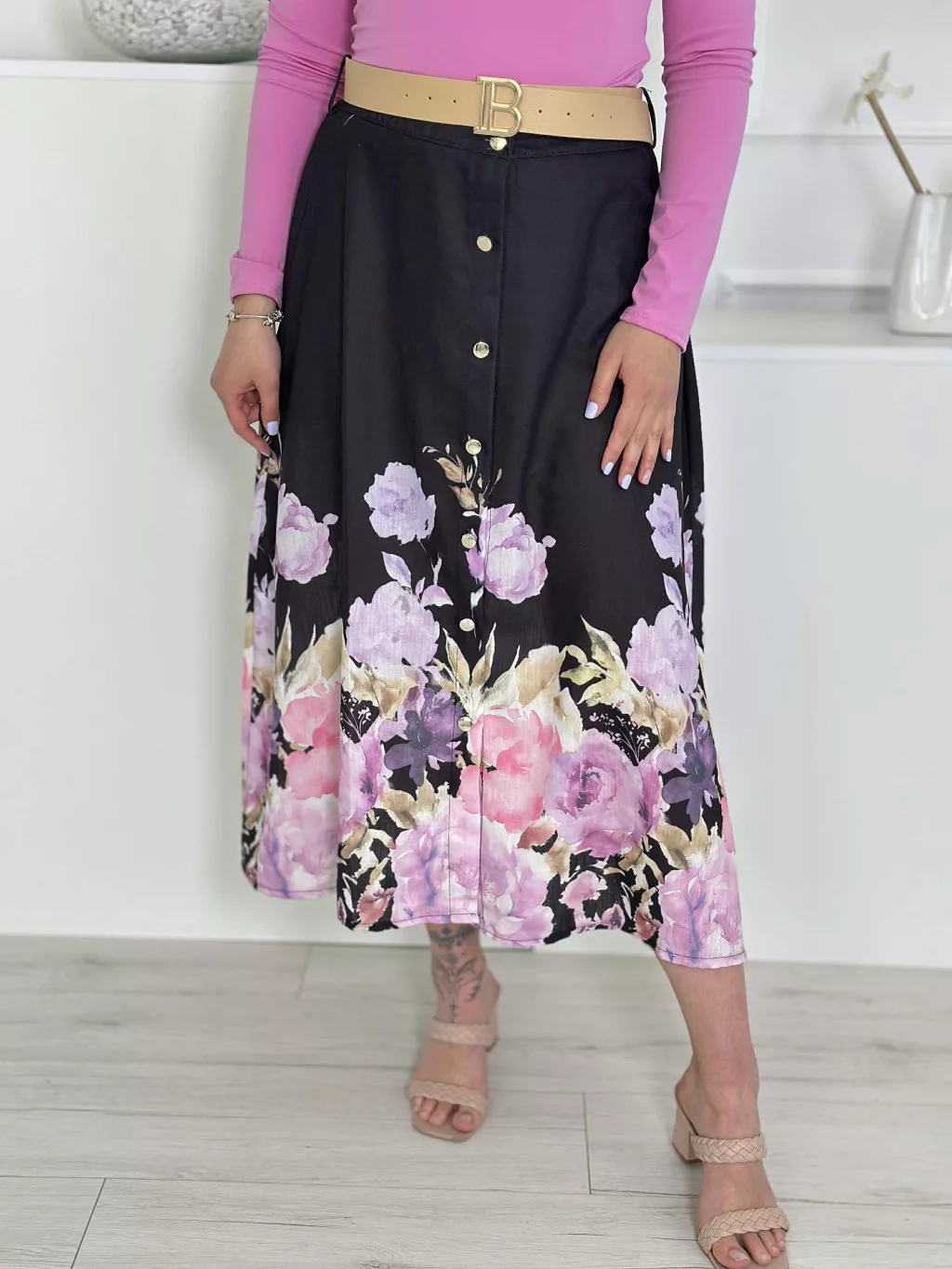 Lenvászon hatású szoknya övvel ,gombos, magas, gumis derekú, nem rugalmas anyagú. (S-L méretre ajánljuk.)