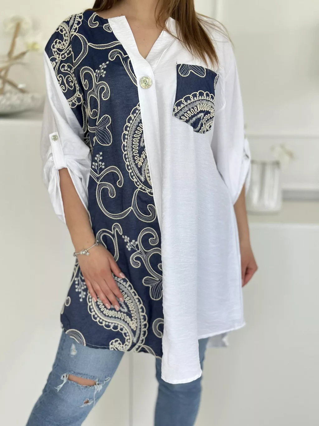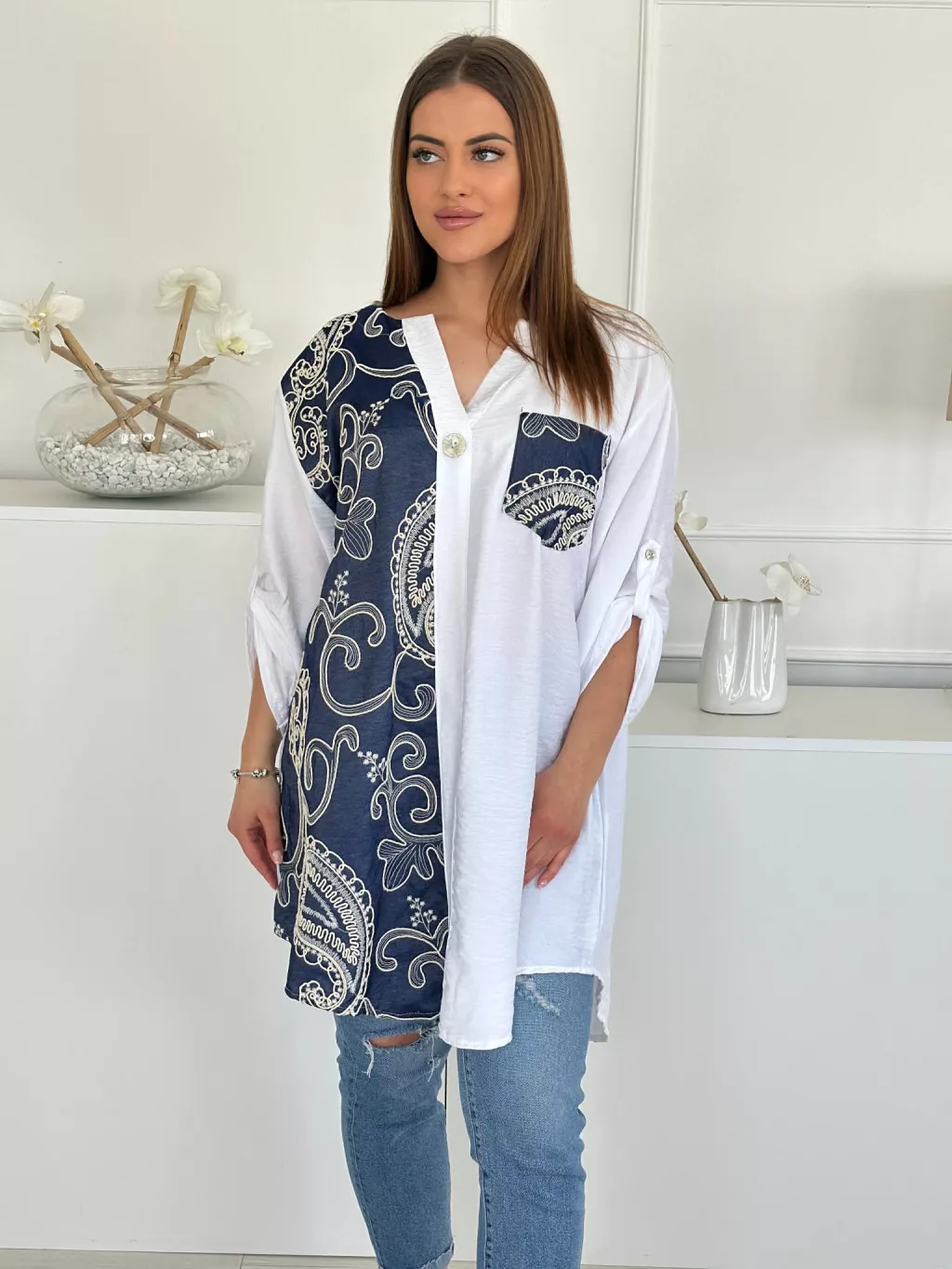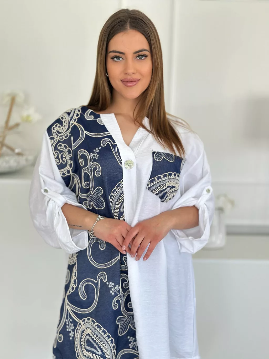 Lenvászon hatású tunika ,lenge fazonú, farmerbetétes, nem rugalmas anyagú. Plus size! M-2XL méretre ajánljuk! Öv nélkül!