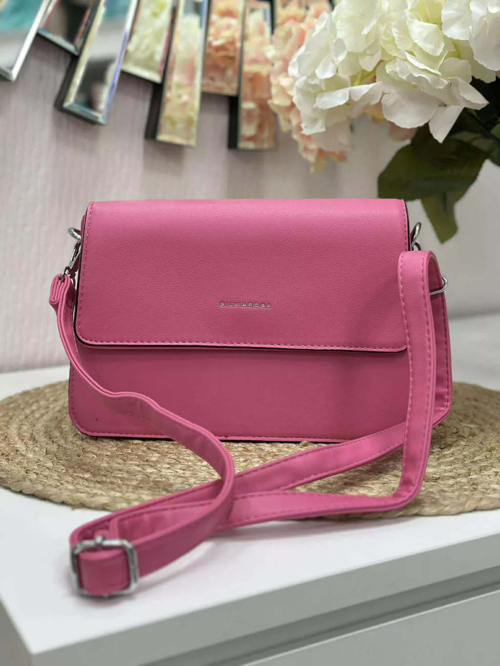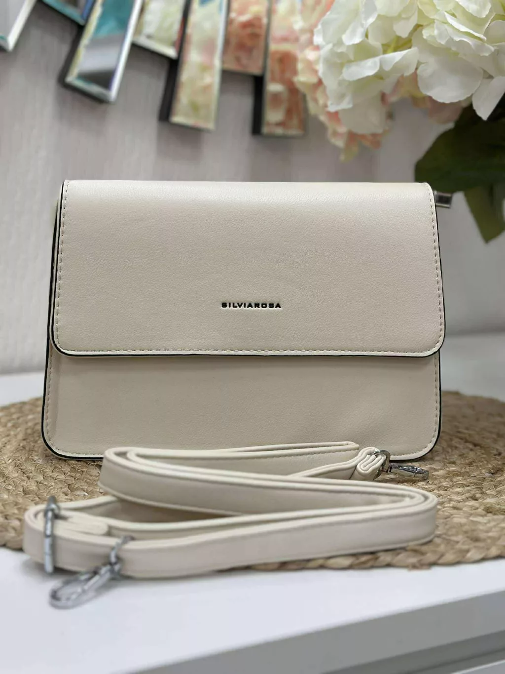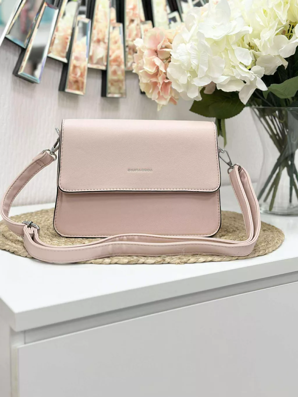 Merev fazonú, puha, műbőr kistáska, levehető hosszú pánttal. Szélesség: 25 cm Magasság: 17,5 cm.