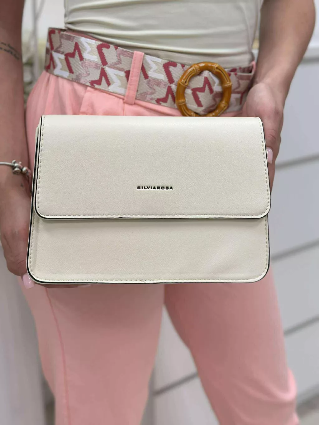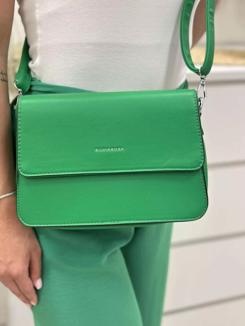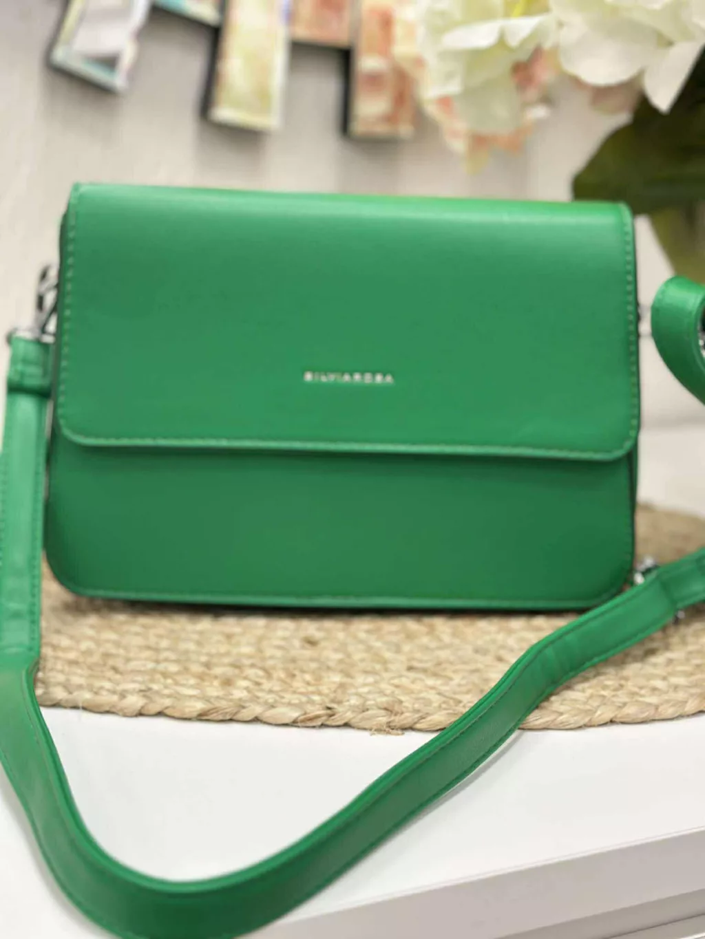 Merev fazonú, puha, műbőr kistáska, levehető hosszú pánttal. Szélesség: 25 cm Magasság: 17,5 cm.