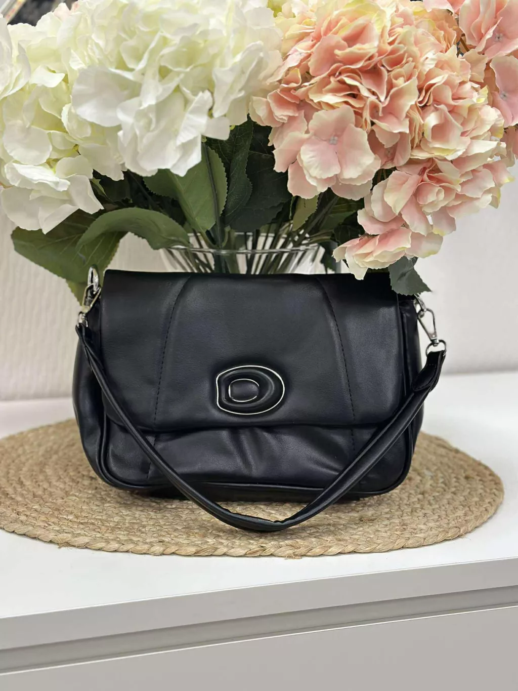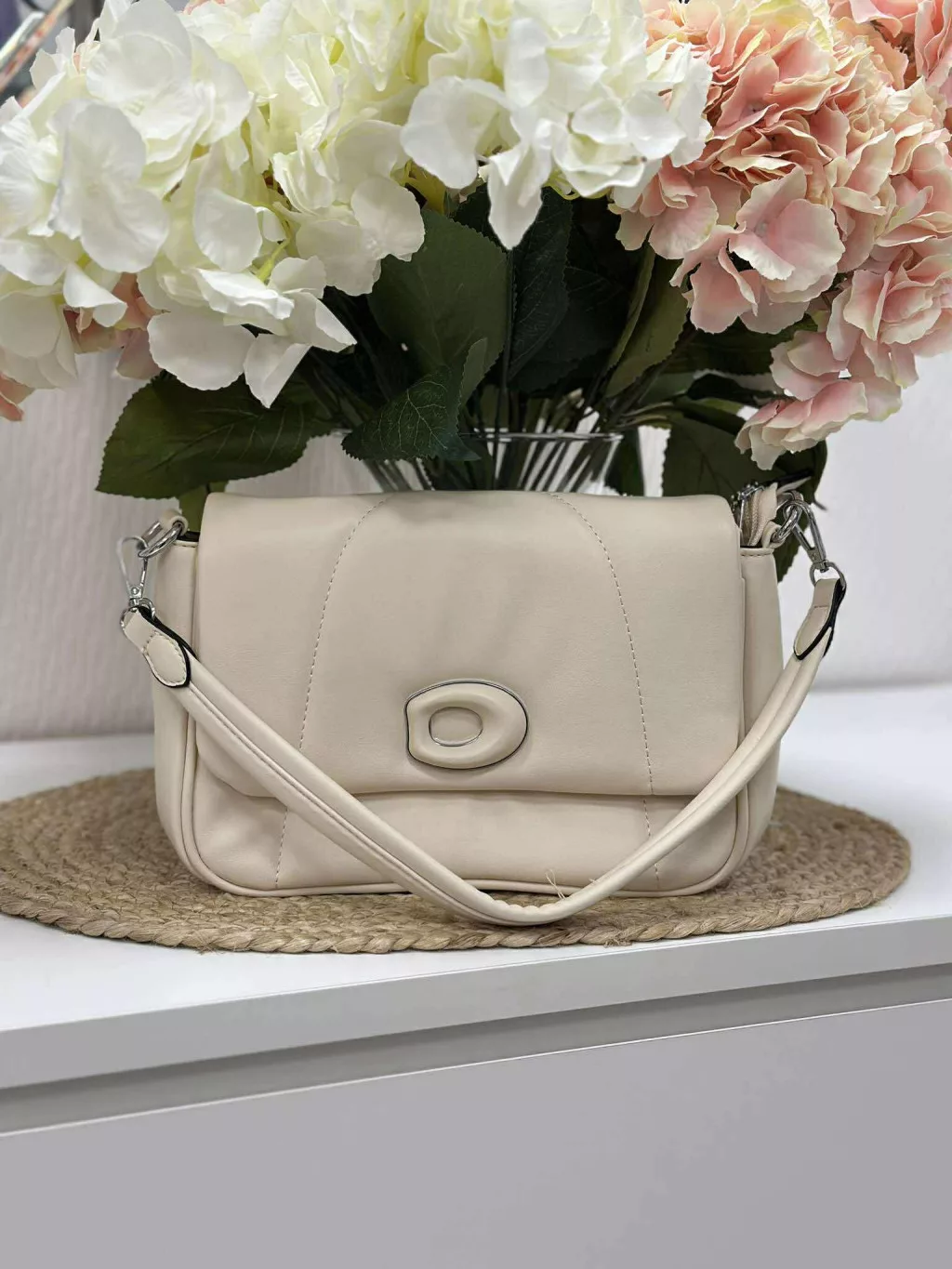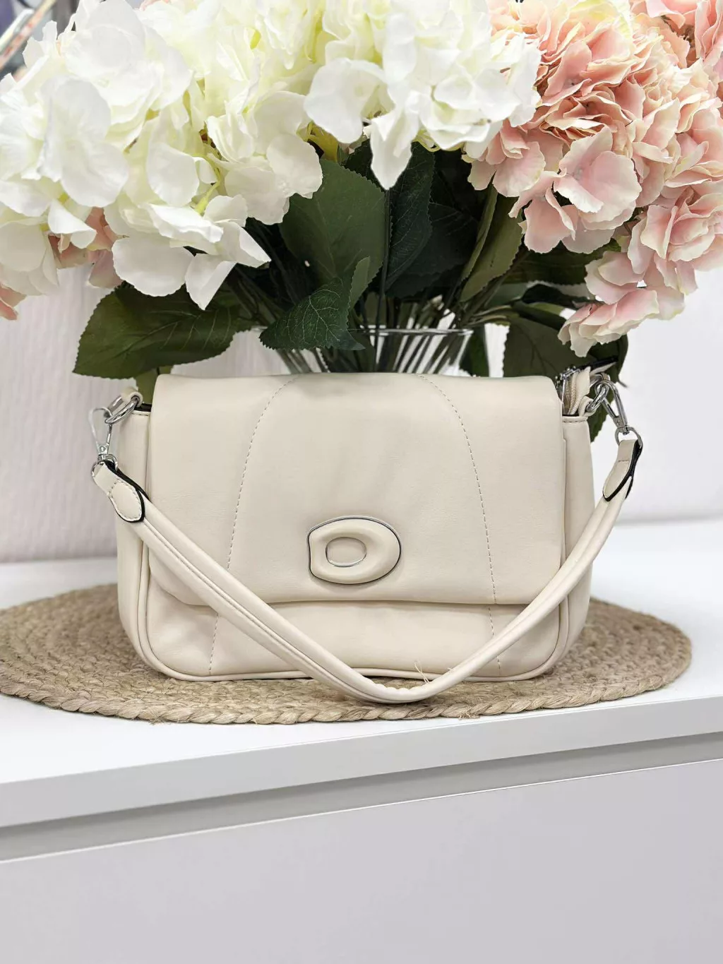 Merev fazonú, puha, műbőr táska, levehető hosszú pánttal. Szélesség: 24 cm Magasság: 17 cm.