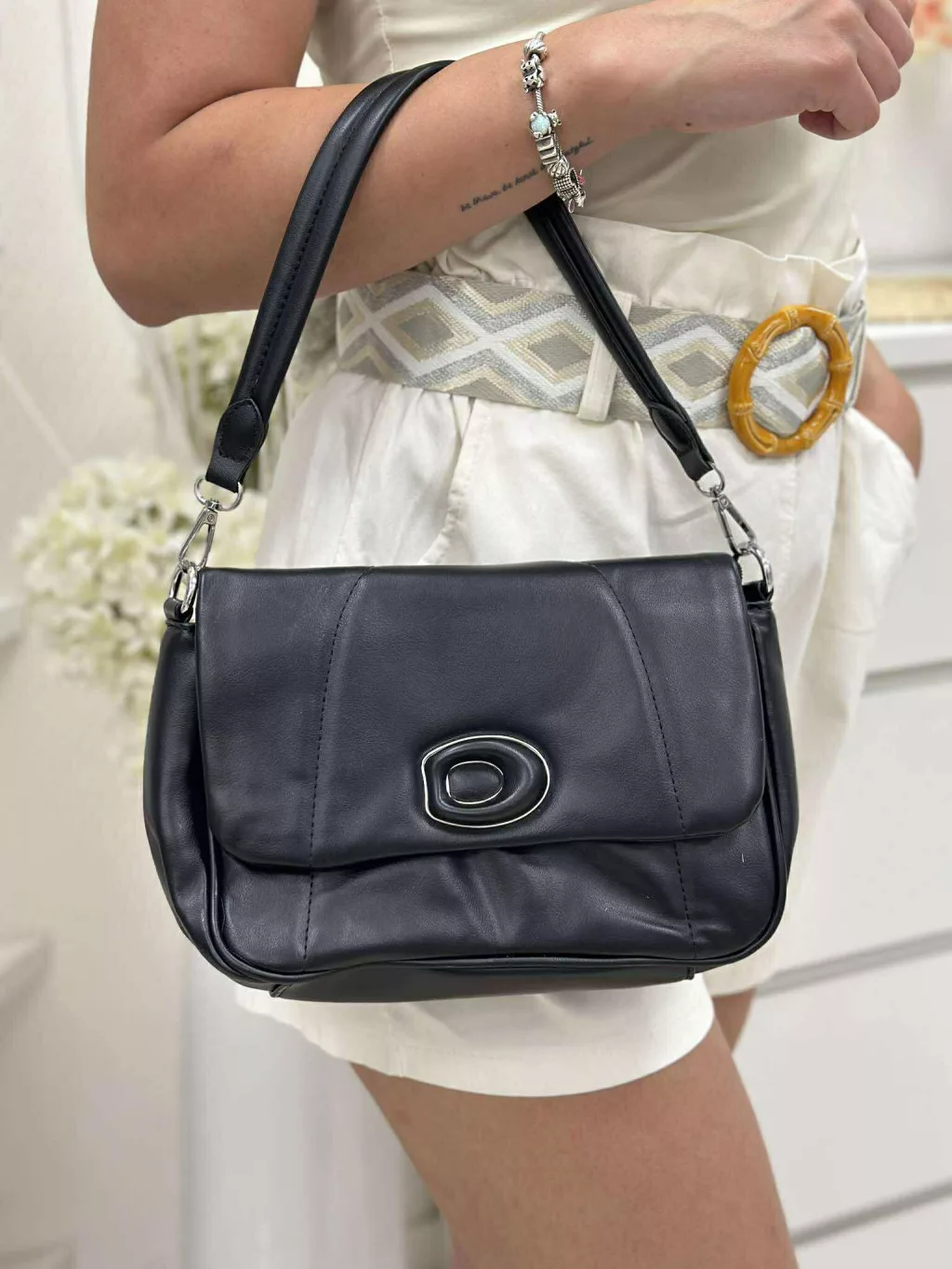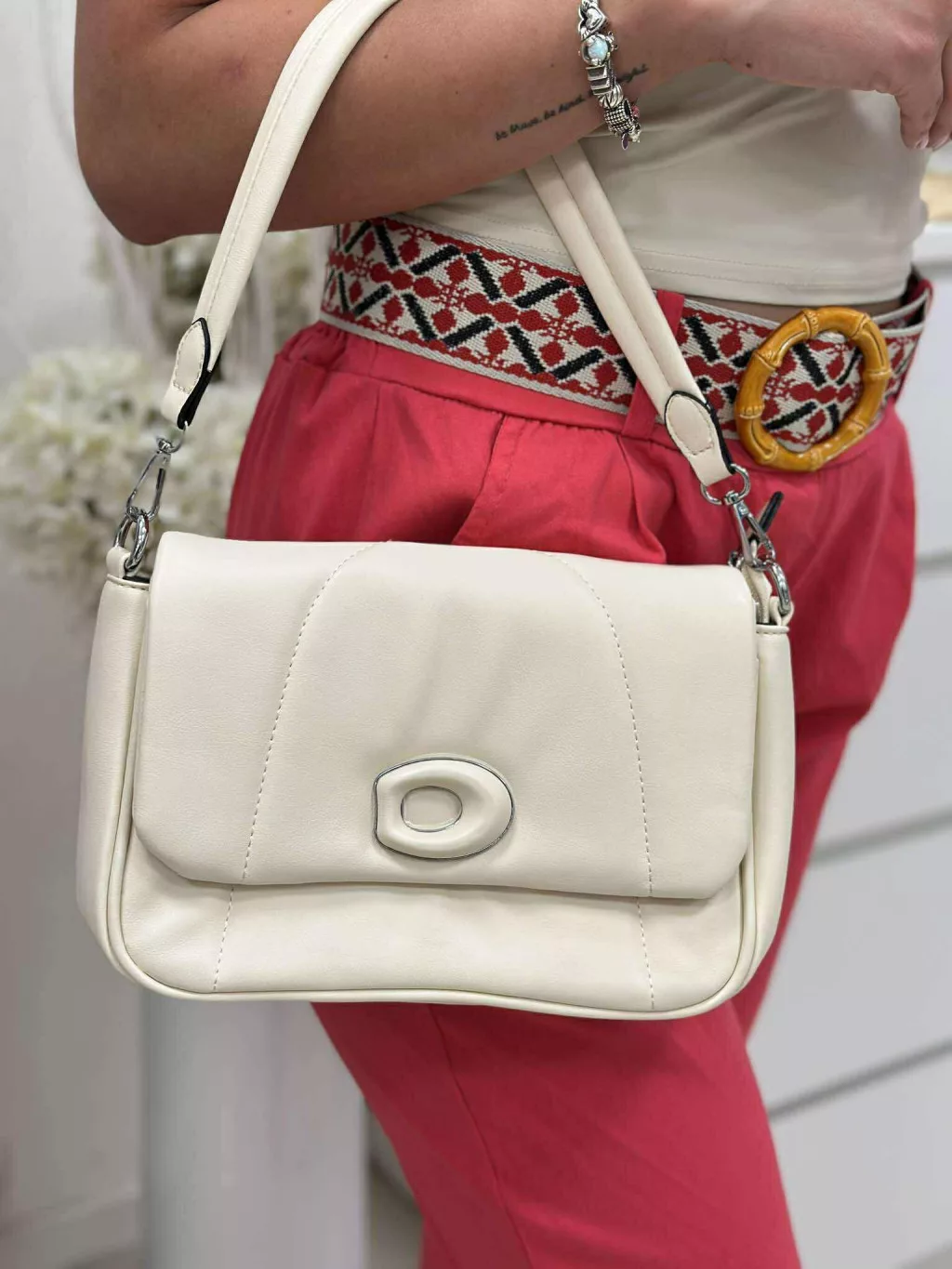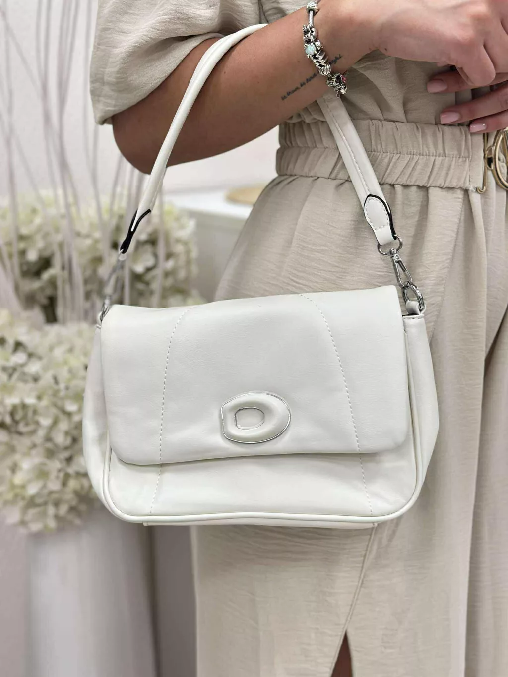 Merev fazonú, puha, műbőr táska, levehető hosszú pánttal. Szélesség: 24 cm Magasság: 17 cm.