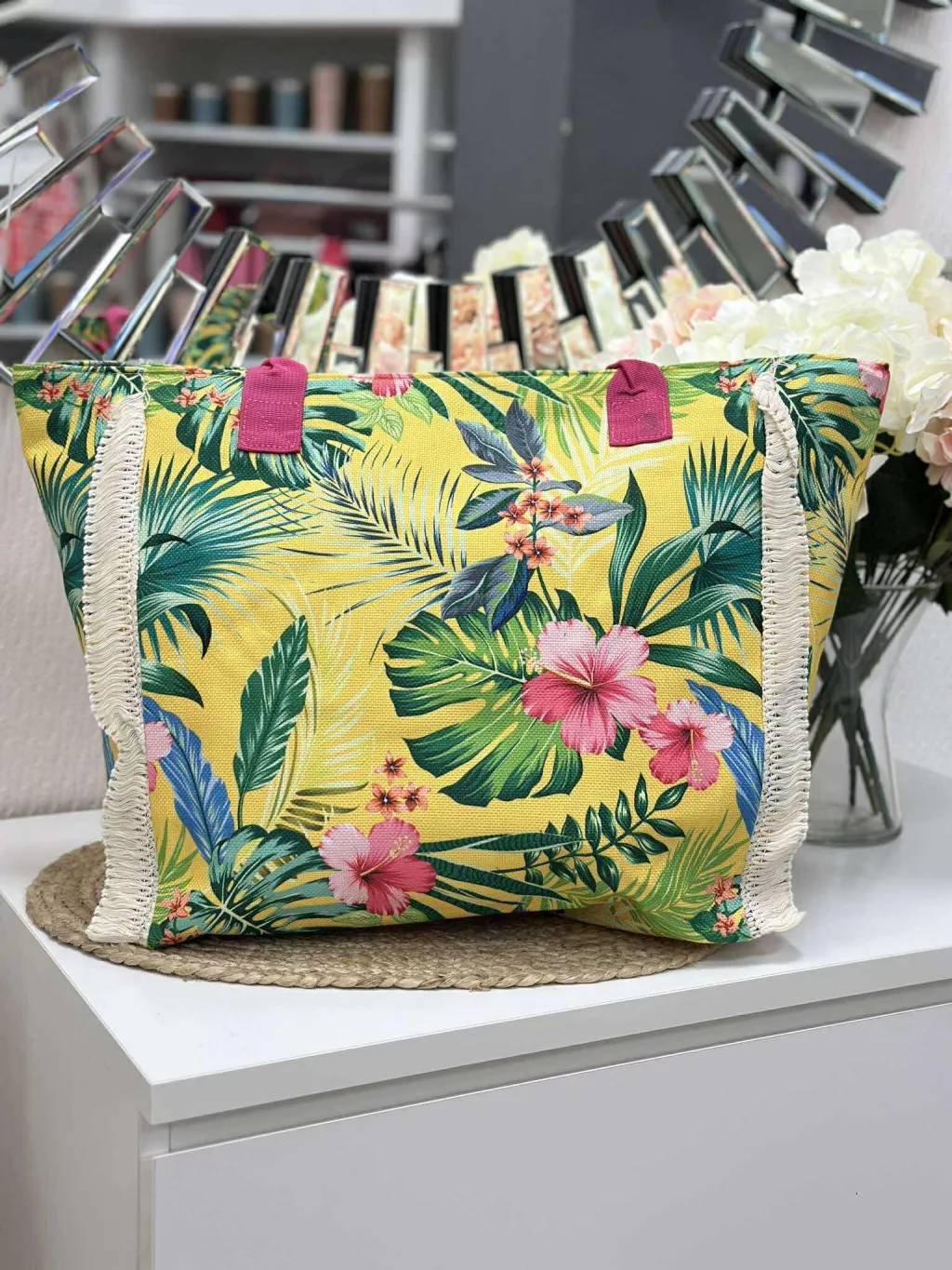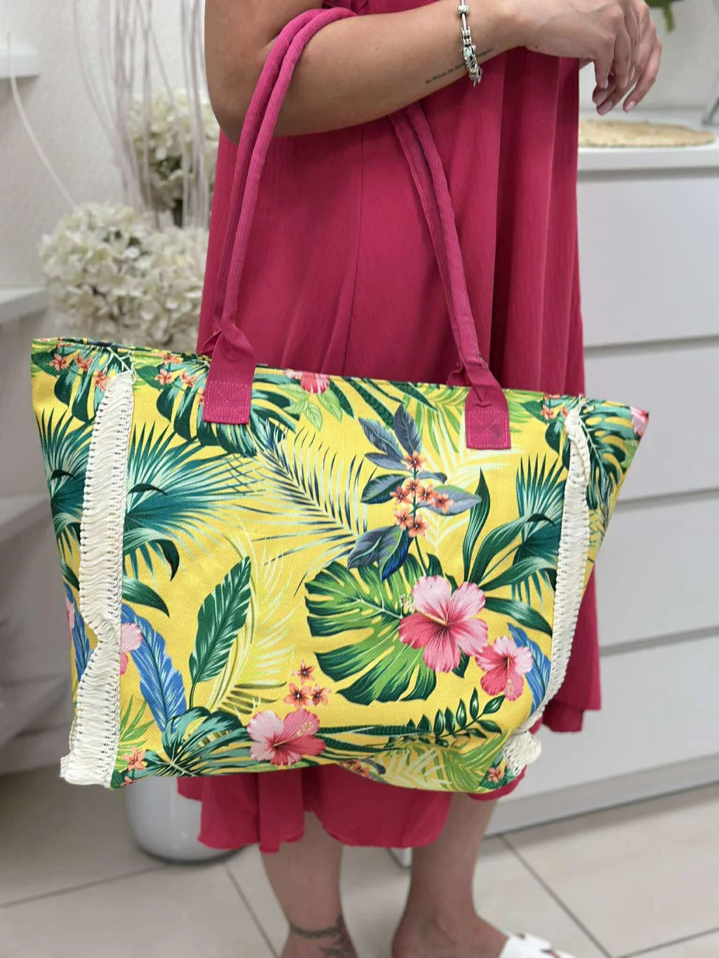 Nagyméretű, cipzáras, mintás, nyári vászon shopper táska. Méretek: 54 x 37 x 17 cm.