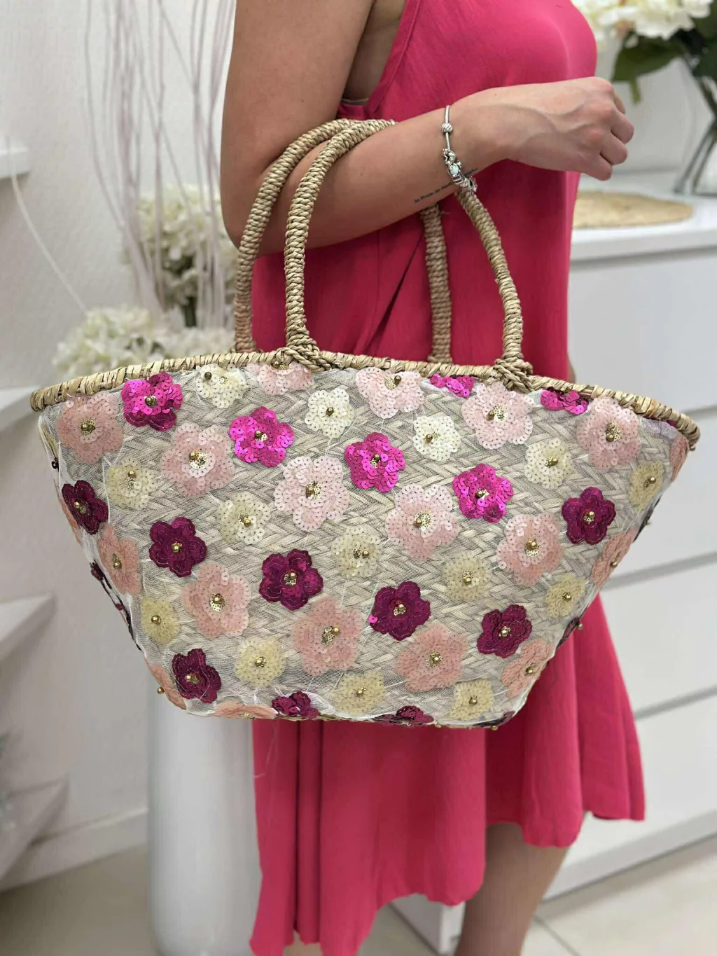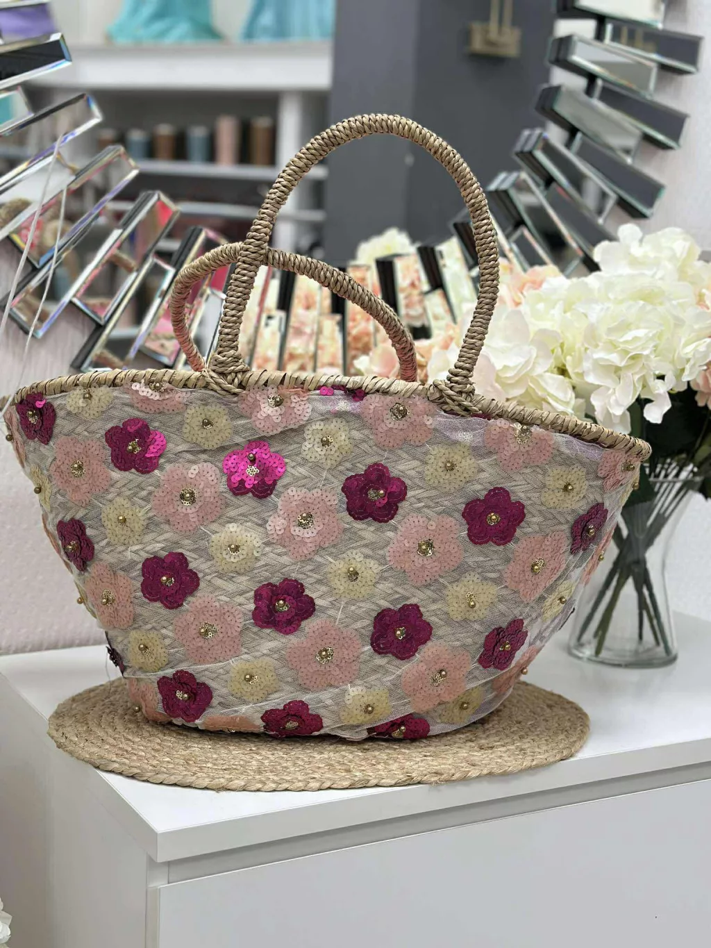 Nagyméretű, merev fazonú, cipzáras, flitteres, nyári, fonott, rattan táska. 54 x 30 x 16 cm.