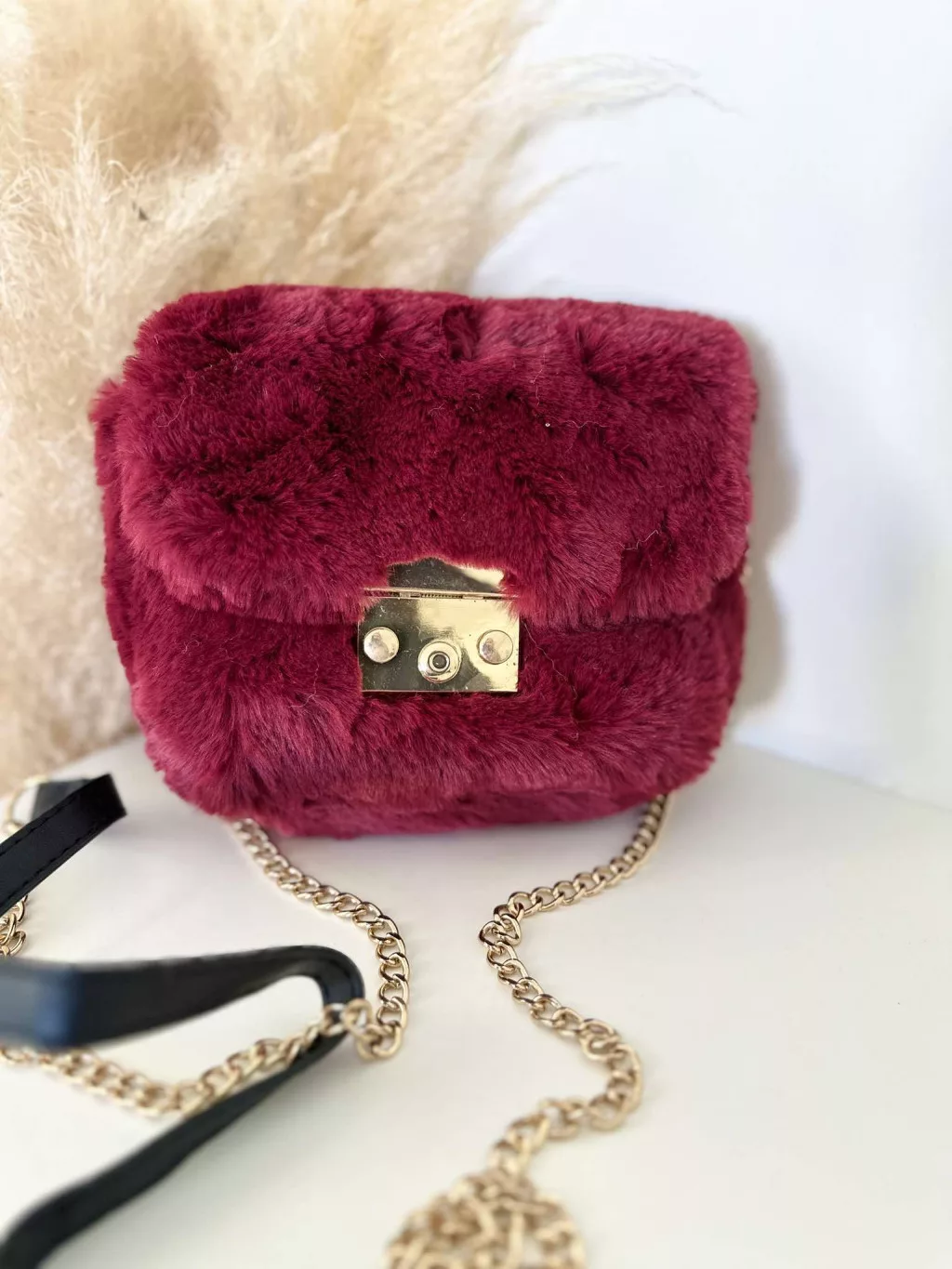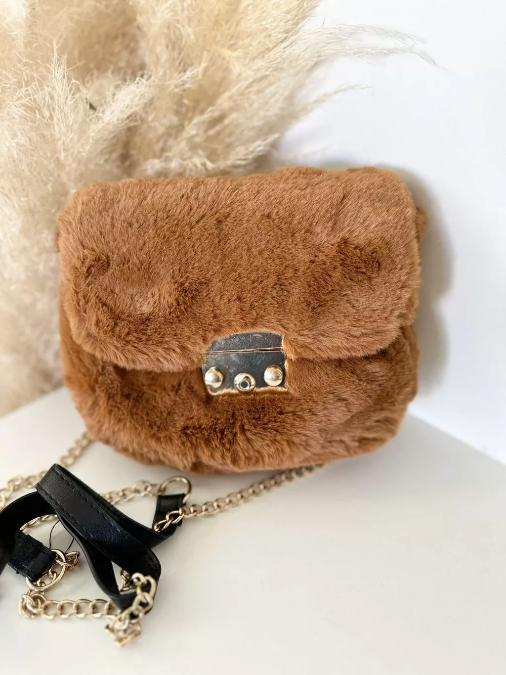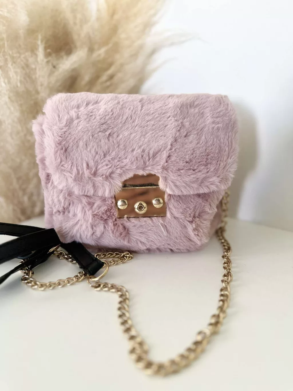 Pihe-puha szőrmés kistáska hosszúpánttal. Szélesség: 16 cm Magasság: 14 cm.