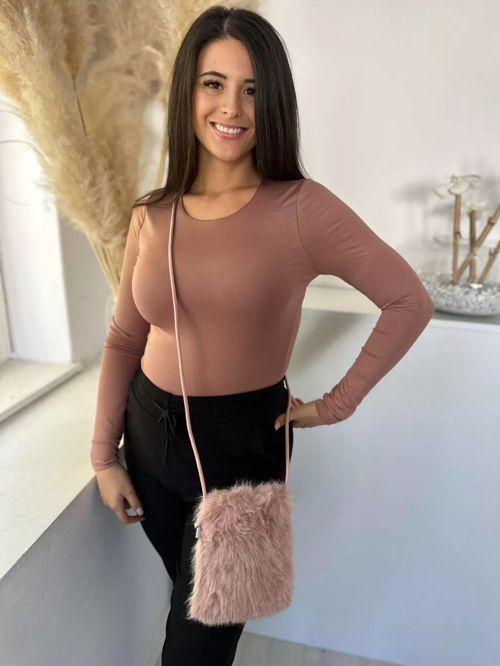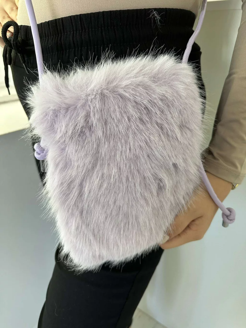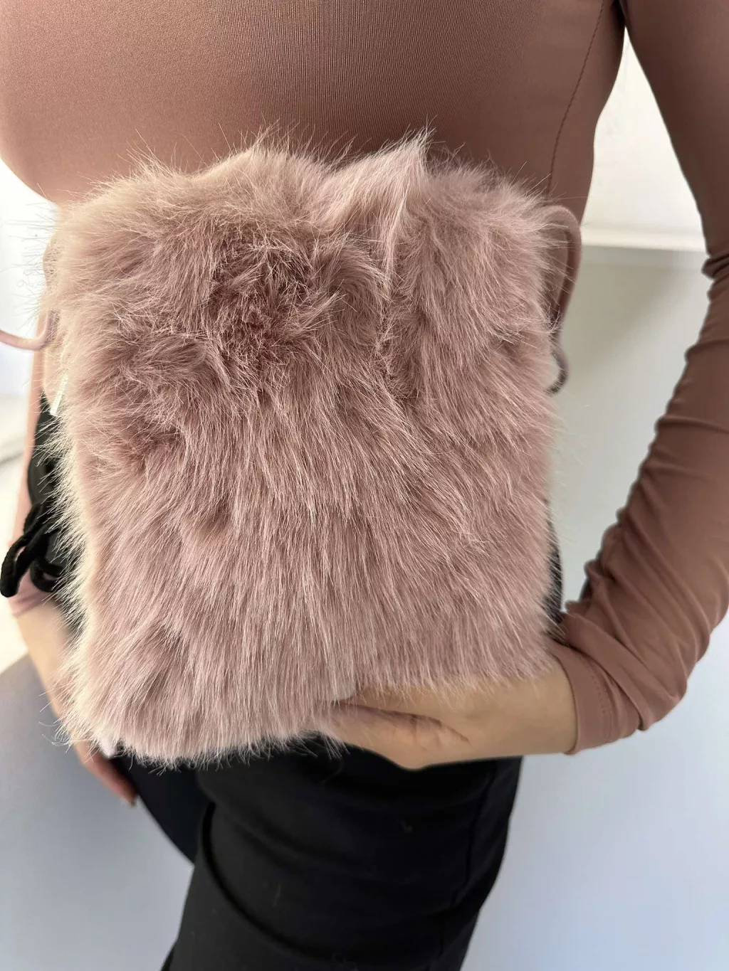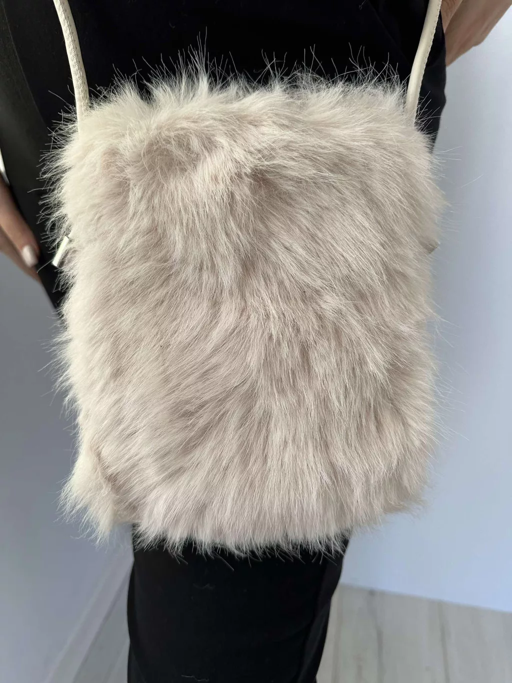 Pihe-puha szőrmés, patentos kistáska, műbőr hosszú pánttal. Szélesség: 15,5 cm Magasság: 20 cm