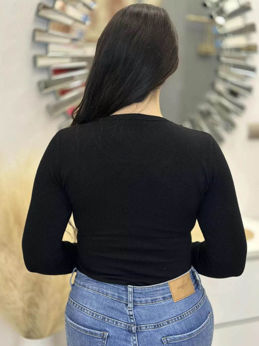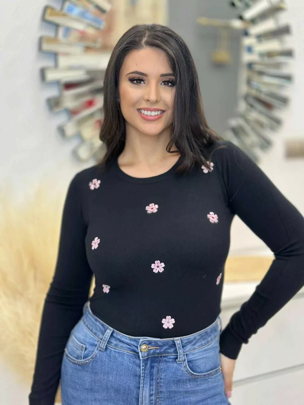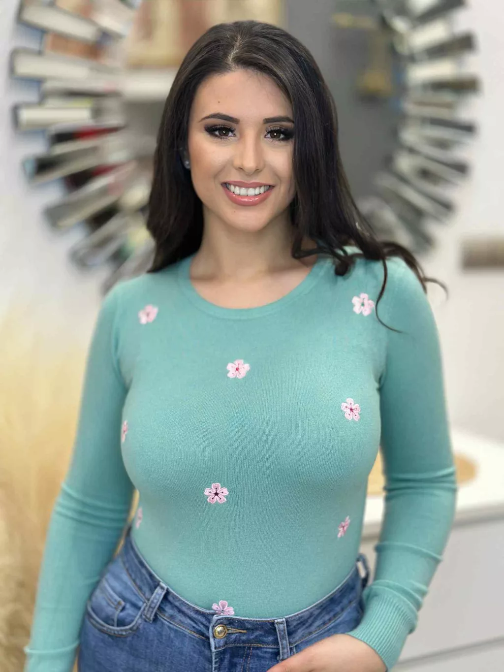 Pihe-puha, vékony kötött felső , kerek nyakú, virágokkal díszített. A Modell S/M méretet visel.