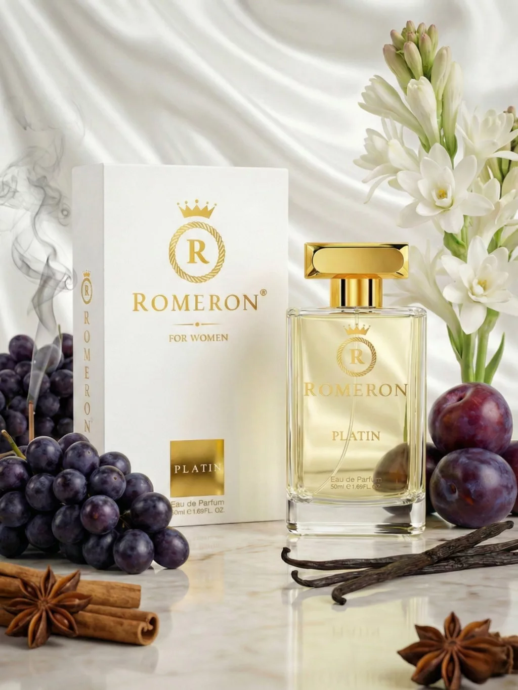 Mivel ez egy Eau de Parfum (a Romeron Platinum szériája gyakran Extrait minőséget képvisel), a piacon elérhető legmagasabb illóolaj-koncentrációk egyikével rendelkezik. Ez azt jelenti számodra, hogy az illat nemcsak rendkívül intenzív, de tartós is – egész nap (sőt, még este is) veled marad anélkül, hogy folyamatosan újra kellene fújnod.