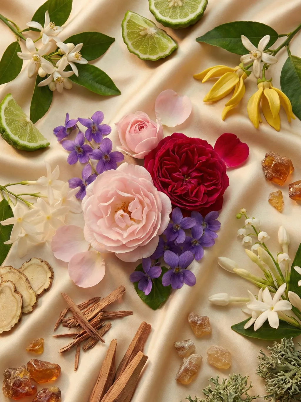 Szívjegyek: Ibolya, Liliom, Ylang-Ylang, Hársfavirág, Gyöngyvirág – az illat púderes, gazdag és romantikus lelke.