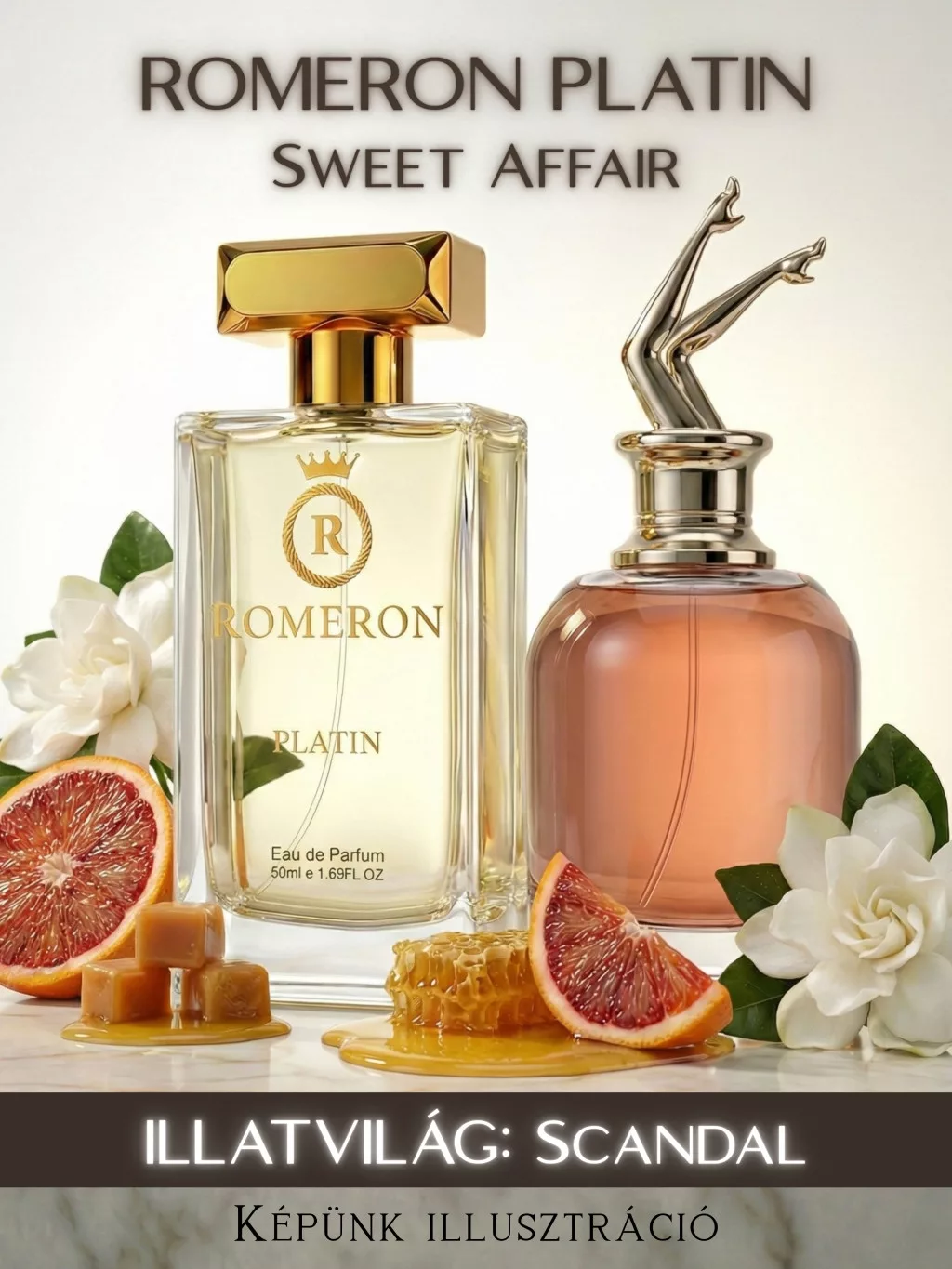 Ha szereted a Jean Paul Gaultier – Scandal illatvilágát, akkor ez a parfüm azonnal a kedvenced lesz. A Romeron Platinum 213 nem a visszafogottságról szól: egy provokatív, szexi és hihetetlenül nőies illat, amely a krémes méz és az elegáns fehér virágok játékára épül, mindezt egy chypre-gourmand köntösbe csomagolva.