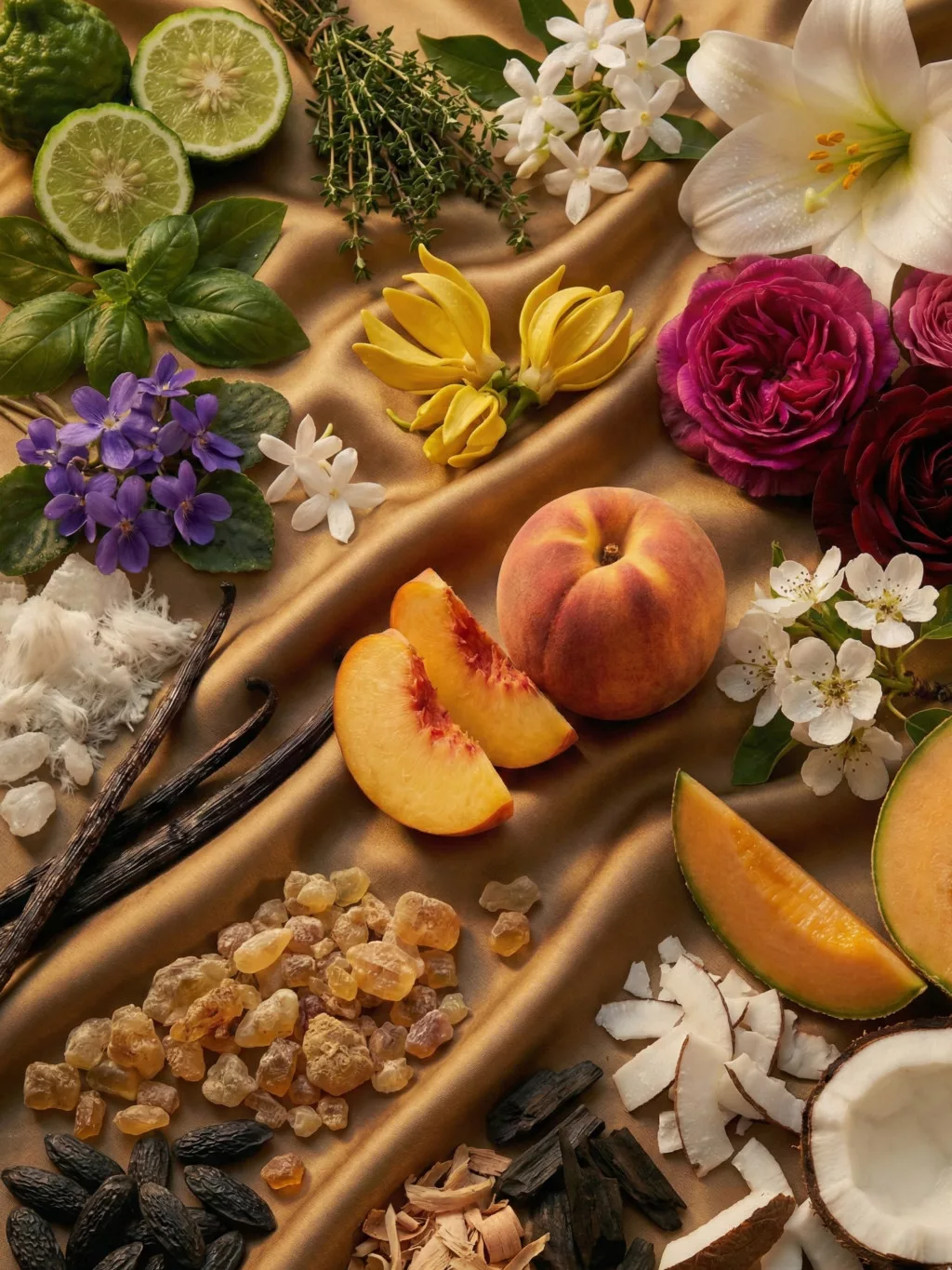 Szívjegyek: Liliom, Ibolyalevél, Damaszkuszi rózsa, Körtevirág, Fehér kunkor, Őszibarack – az illat virágos és zamatosan gyümölcsös szíve.