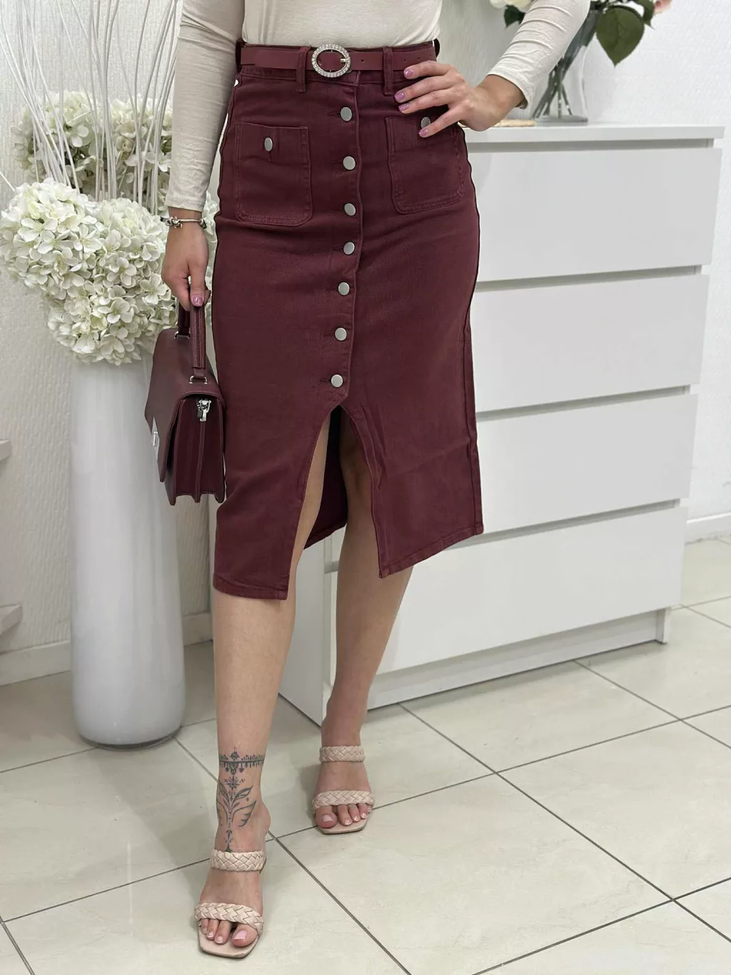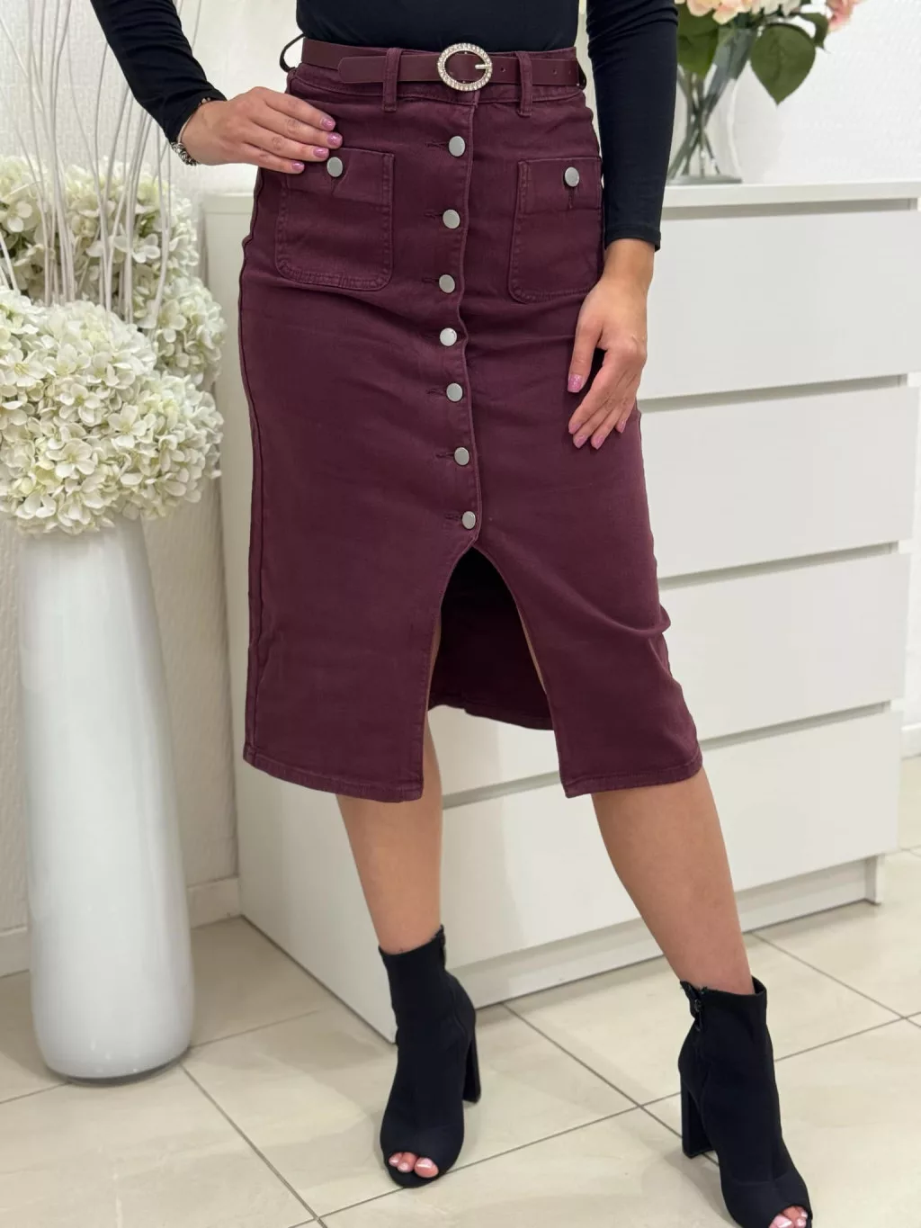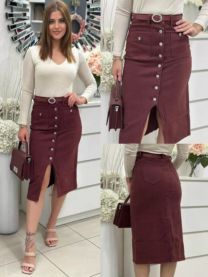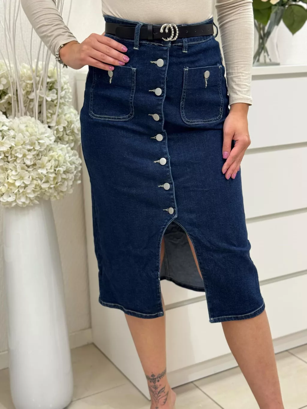 Rugalmas anyagú, magas derekú, gombos, felsliccelt farmerszoknya övvel. A Modell S méretet visel. (XS-XXL méretekben.)