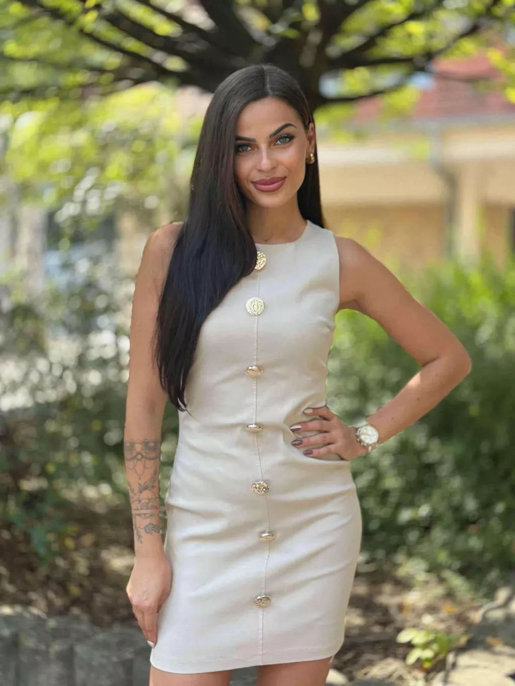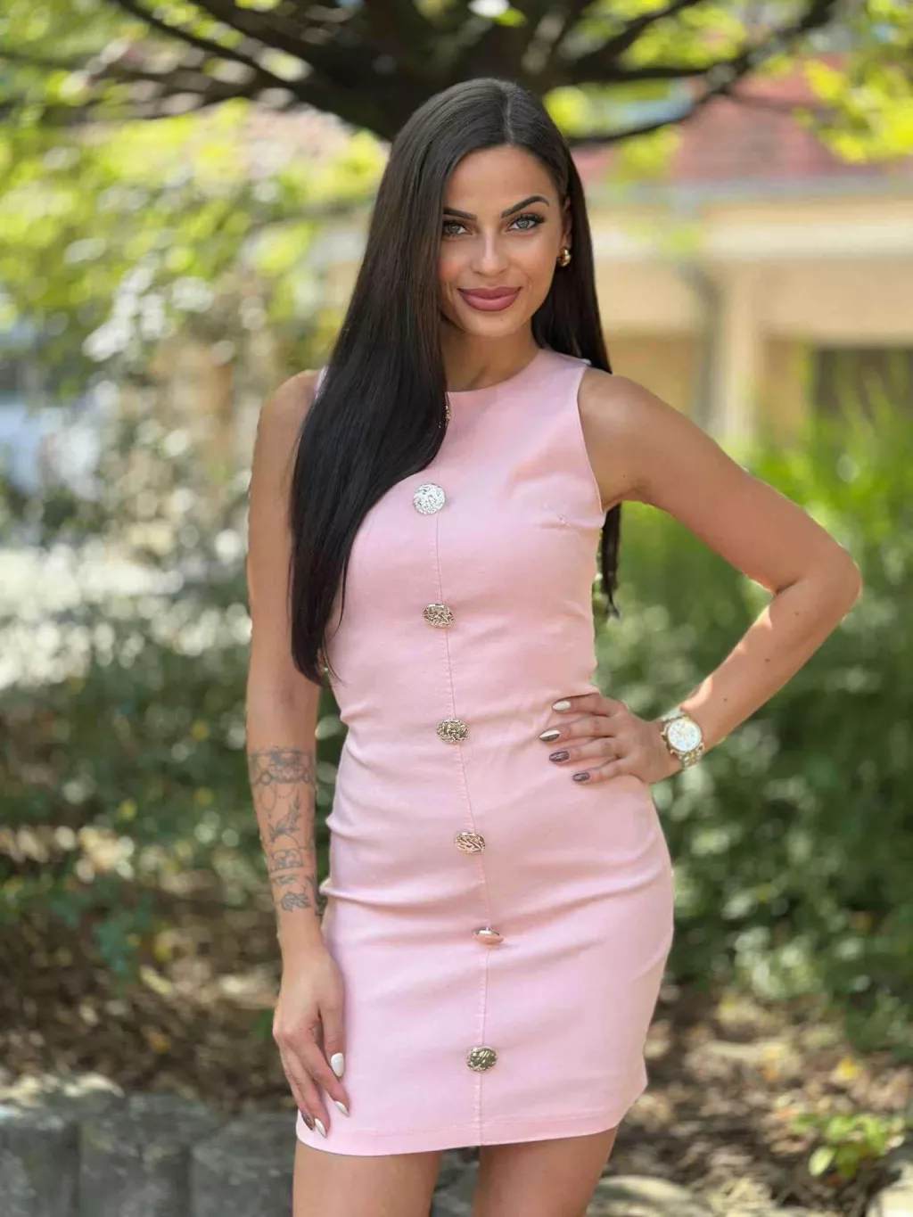 Rugalmas anyagú, testhezálló, hátán cipzáras, díszgombos, csinos ruha. (XS-M méretre ajánljuk.)