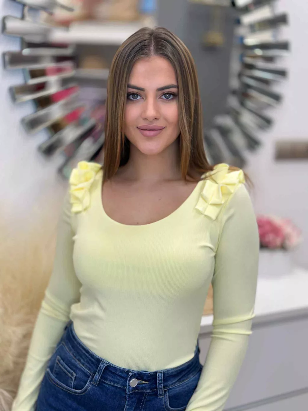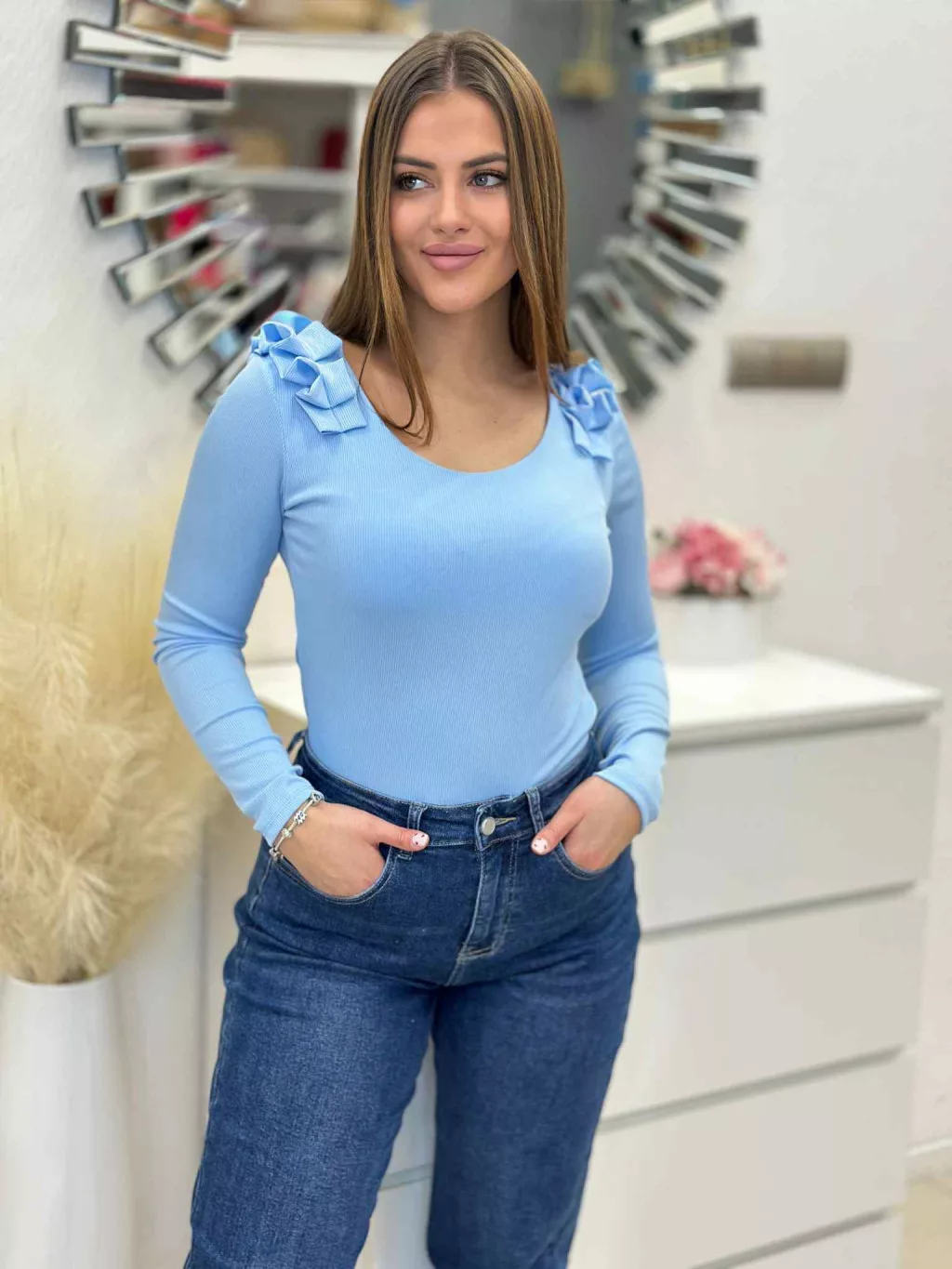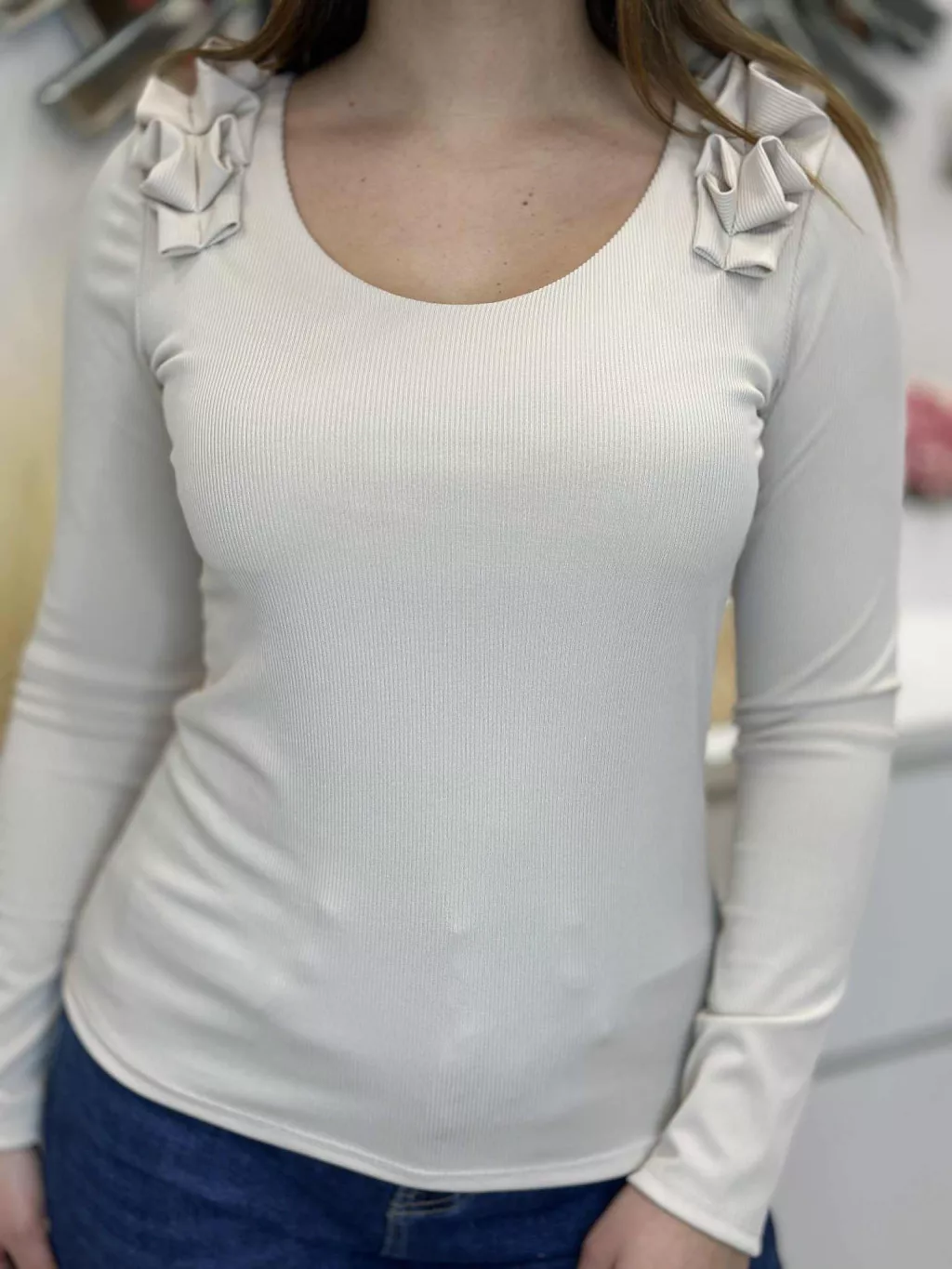 Rugalmas, bordás anyagú felső , vállán fodros. (S-L méretre ajánljuk.)