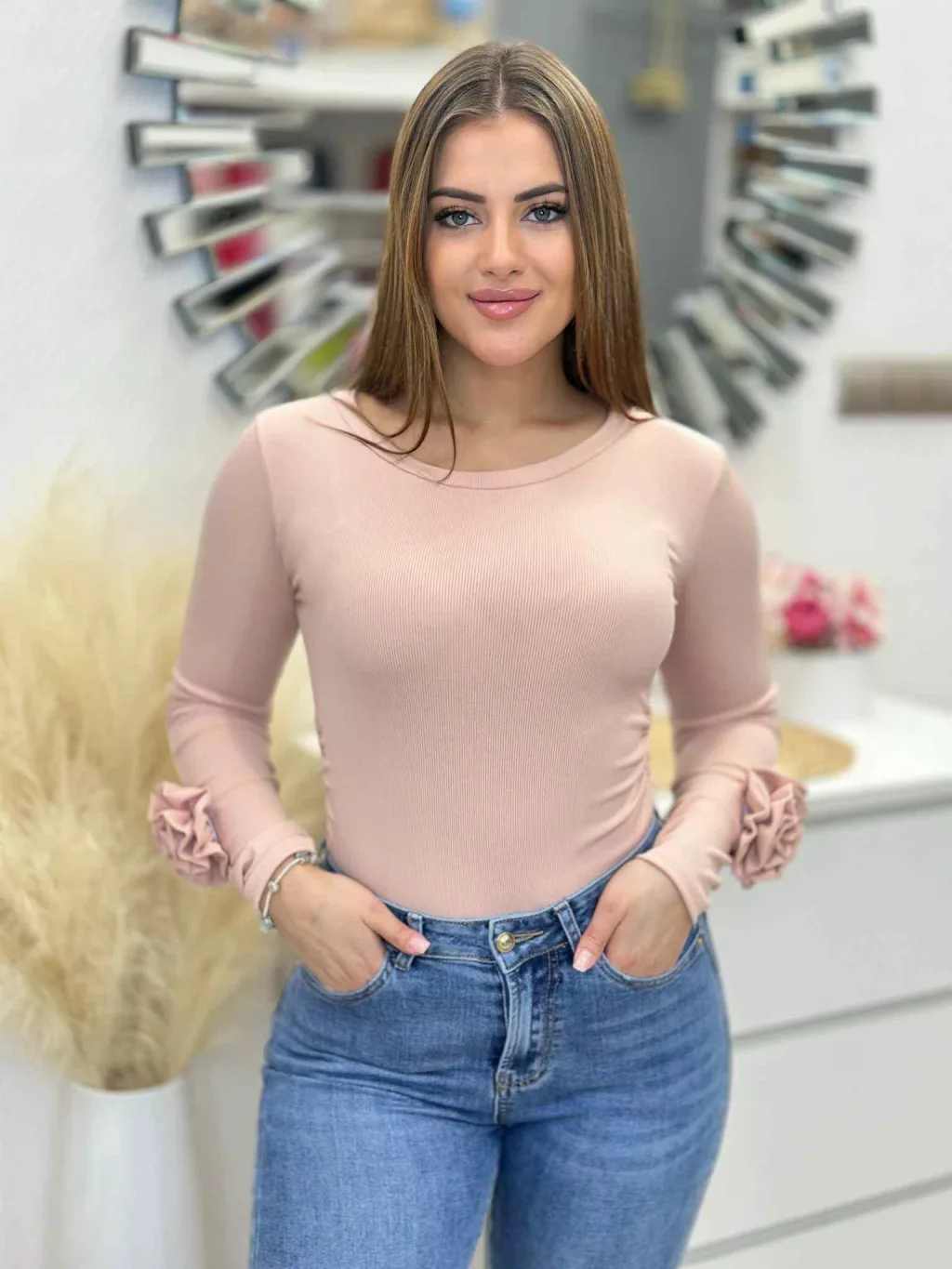 Rugalmas, bordás anyagú felső , oldalán húzott, ujján rózsa dísz. (S-L méretre ajánljuk.)