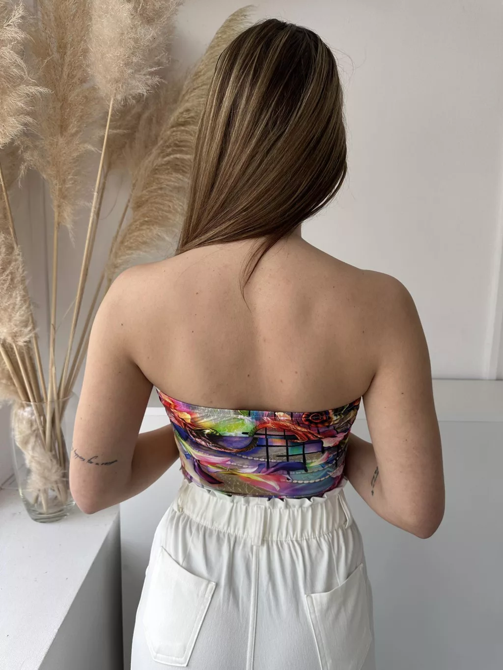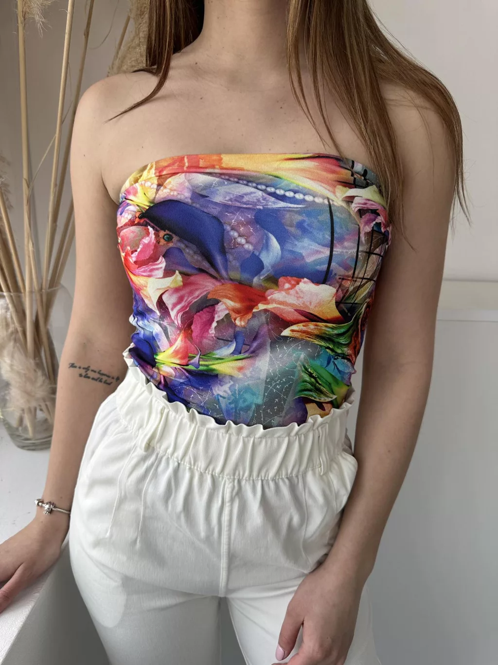 Rugalmas, mellrésznél gumis, dupla anyagú, mintás, pánt nélküli felső. (XS-M méretre ajánljuk.)