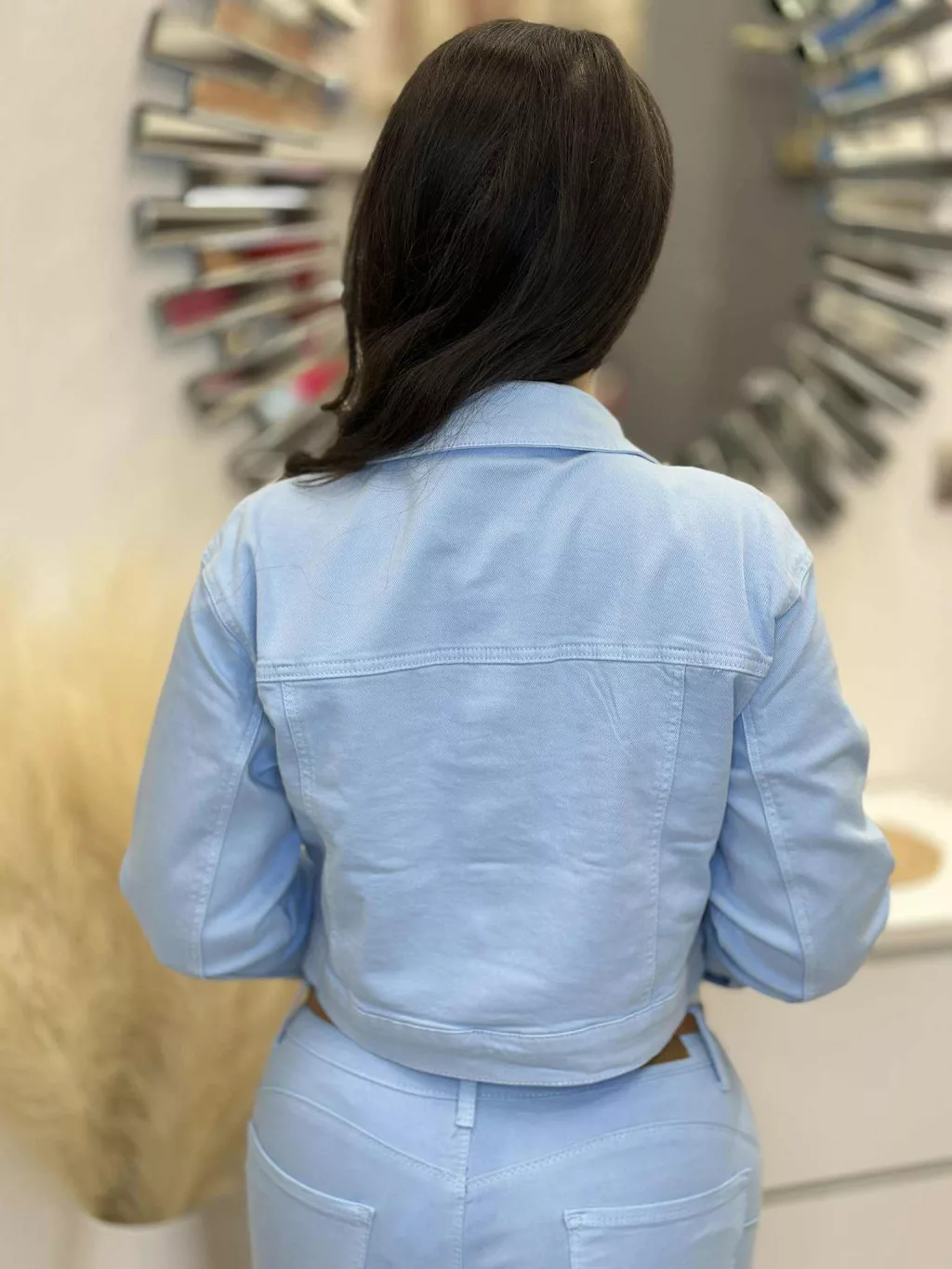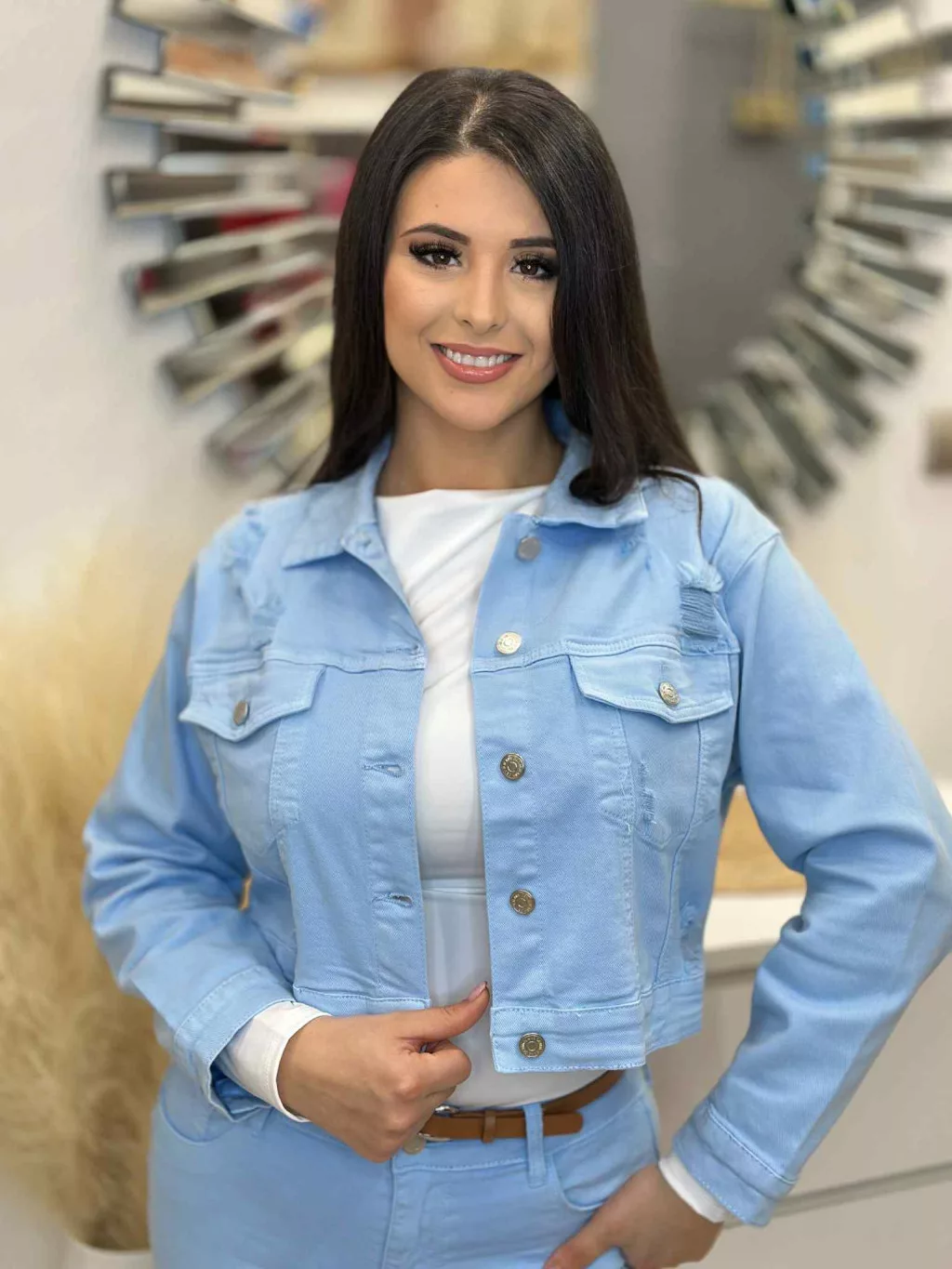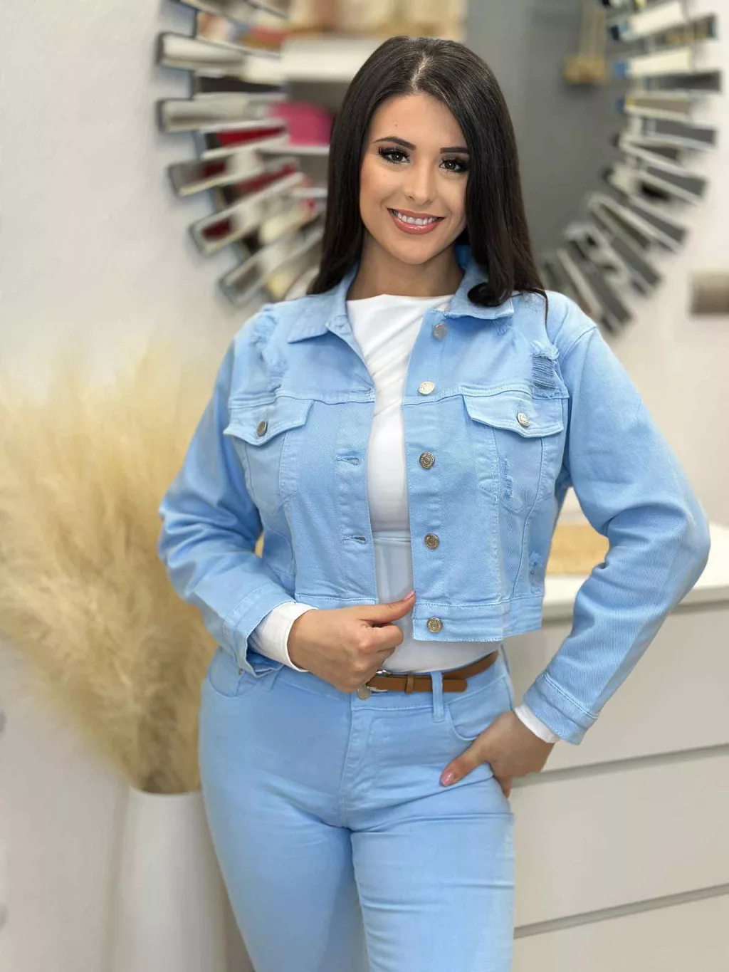 Rugalmas, szaggatott farmerkabát , rövid derekú, over size fazonú. A Modell M méretet visel. A farmernadrág külön vásárolható meg!